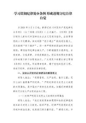 学习贯彻纪律处分条例 形成遵规守纪自律自觉自2024年1月1日起,新修订的《中国共产党纪律处分条例》(以下简称《条例》)正式施行。《条例》坚持以领导人新时代中国特色社会主义思想为指导,全面贯彻党的二十大精神,深刻领悟两个确立的决定性意义、坚决做到两个维护,进一步严明党的政治纪律和政治规矩,带动各项纪律全面从严,不断增强党自我净化、自我完善、自我革新、自我提高能力,保证党的理论和路线方针政策不折不扣贯彻执行。广大党员干部要以学习贯彻《条例》为契机,形成尊崇党章、遵守党纪的良好习惯,养成守纪律、讲规矩的自律自觉。一、深刻认识党的纪律建设的重要意义领导人指出:党要管党、从严治党,靠什么管,凭什么治?就要靠严明纪律。严明纪律是马克思主义政党的本质属性,是中国共产党的优良传统,加强纪律建设是新时代全面从严治党的治本之策。(一)纪律严明是马克思主义政党的本质属性领导人指出:我们党是用革命理想和铁的纪律组织起来的马克思主义政党,组织严密、纪律严明是党的优良传统和政治优势,也是我们的力量所在。建党之初,中国共产党就明确把严密的组织、严格的纪律作为自己的本质要求。党领导的人民军队实行的三大纪律八项注意家喻户晓,后来成为全军的统一纪律。1941年9月,在中央政治局扩大会议上,毛同志提出了路线是王道,纪律是霸道,这两者都不可少的著名论断。1949年3月,党的七届二中全会根