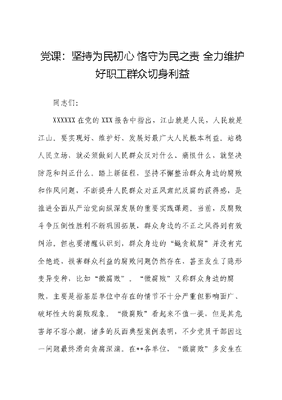 党课:坚持为民初心 恪守为民之责 全力维护好职工群众切身利益同志们:XXXXXX在党的XXX报告中指出,江山就是人民,人民就是江山。要实现好、维护好、发展好最广大人民根本利益。站稳人民立场,就必须做到人民群众反对什么、痛恨什么,就坚决防范和纠正什么。踏上新征程,坚持不懈整治群众身边的腐败和作风问题,不断提升人民群众对正风肃纪反腐的获得感,是推进全面从严治党向纵深发展的重要实践课题。当前,反腐败斗争压倒性胜利不断巩固拓展,群众身边的不正之风得到有效纠治。但也要清醒认识到,群众身边的蝇贪蚁腐并没有完全绝迹,损害群众利益的腐败问题仍然存在,甚至发生了隐形变异变种,比如微腐败。微腐败又称群众身边的腐败,主要是指基层单位中存在的情节不十分严重但影响面广、破坏性大的腐败现象。微腐败看起来不值一提,但是其危害却不容小觑,诸多的反面典型案例表明,不少党员干部因这一问题最终滑向贪腐深渊。在**各单位,微腐败多发生在职工群众身边,是职工群众能够看到的最直观的腐败问题。作为国企纪检监察干部,必须精准惩治职工群众身边的蝇贪蚁腐,推动全面从严治党向基层一线、向群众身边延伸。一、提高站位,深刻认清微腐败的存在性及危害性相比于远在天边的老虎,职工群众对近在眼前的蝇贪蚁腐感受更为真切。微腐败行为虽然一般涉案金额不大,违纪违法问题情节轻微,但是侵害的是群众的切身利