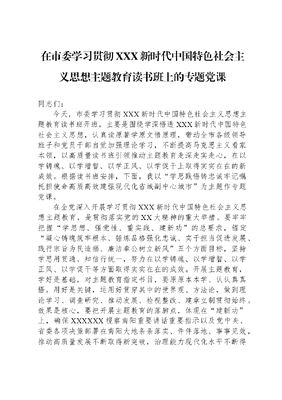在市委学习贯彻XXX新时代中国特色社会主义思想主题教育读书班上的专题党课同志们:今天,市委学习贯彻XXX新时代中国特色社会主义思想主题教育读书班开班,主要是围绕学深悟透XXX新时代中国特色社会主义思想,认真读原著学原文悟原理,带动全市各级领导班子和党员干部自觉加强理论学习,不断提高马克思主义看家本领,以高质量读书班引领推动主题教育走深走实走心,在以学铸魂、以学增智、以学正风、以学促干上取得实实在在的新成效。根据读书班安排,下面,我以学思践悟铸忠诚牢记嘱托担使命高质高效建强现代化省域副中心城市为主题作专题党课。 在全党深入开展学习贯彻XXX新时代中国特色社会主义思想主题教育,是贯彻落实党的XX大精神的重大举措。要牢牢把握学思想、强党性、重实践、建新功的总要求,锚定凝心铸魂筑牢根本、锤炼品格强化忠诚、实干担当促进发展、践行宗旨为民造福、廉洁奉公树立新风五个方面目标,坚持学思用贯通、知信行统一,努力在以学铸魂、以学增智、以学正风、以学促干等方面取得实实在在的成效。开展主题教育,学好是基础,对主题教育指定书目,要原原本本学、认认真真悟。用好是关键,运用好贯穿其中的世界观、方法论,做到理论学习、调查研究、推动发展、检视整改、建章立制贯彻始终。效果是核心,要把开展主题教育的落脚点,体现在建新功上,确保XXXXXX视察南阳重要讲话重要指示以及党中央、省委各项决策部署在南阳大地条条落实、件件落地、事事见效,推动高质量发展不断取得新突破,治理能力现代化水平不断得到新提升,城市更新提质实现新跃升,乡村振兴取得新成绩,人民群众获得感幸福感安全感得到新增强。 一是深学细悟,凝心铸魂强党性。XXX新时代中国特色社会主义思想是一个系统全面、逻辑严密、内涵丰富、内在统一的科学理论体系,为实现中华民族伟大复兴提供了行动指南,为丰富发展马克思主义作出了原创性贡献,为建设中华民族现代文明指明了前进方向,为推动人类文明发展进步贡献了中国智慧。我们要坚持读原著、学原文、悟原理,自觉做XXX新时代中国特色社会主义思想的坚定信仰者、积极传播者、忠实实践者。要深学细悟如磐如炬的理想信念。坚定信仰信念,强化政治忠诚,严明政治纪律,坚定捍卫两个确立、做到两个维护,切实增强四个意识、坚定四个自信。要深学细悟人民至上的根本立场。站稳人民立场,坚持依靠人民,不断造福人民,实现好、维护好、发展好最广大人民的根本利益。要深学细悟守正创新的理论品格。守马克思主义之正,创马克思主义中国化时代化之新,守党的全面领导之正,创党的自我革命之新,守中国特色社会主义之正,创中国式现代化之新,不断把中国式现代化推向前进。要深学细悟鲜活管用的科学方法。坚持问题导向,强化系统观念,发现问题、直面问题、解决问题,善于抓住主要矛盾和矛盾的主要方面,以重点领域和关键环节的突破带动全局。要深学细悟胸怀天下的视野境界。拓展世界眼光,深化对外开放,以全球思维、国际视野看问题、想办法、办事情,顺势而为、乘势而上、加快发展。要深学细悟自我革命的政治勇气。增强自我净化能力、自我完善能力、自我革新能力、自我提高能力,打造具备领导现代化建设能力的执政骨干队伍。 二是牢记嘱托,勇担使命践忠诚。要把加快建设现代化副中心城市,作为践行领袖嘱托的具体行动,锚定省委两个确保十大战略十个河南,紧扣三区一中心一高地的战略定位,强力推进一二三六十工作布局,不断掀起建强副中心,奔向新辉煌;大家齐努力,打造增长极新热潮。必须坚定捍卫两个确立,切实把XXXXXX对南阳的关怀关爱、谆谆教诲转化为加快推动高质量发展和现代化建设的坚定信念、澎湃动力和巨大成效。必须始终心系国之大者,推动南水北调水源地保护、粮食安全、中医药传承创新发展、移民后续帮扶、特色产业培育等重要工作再上新台阶、取得新突破,以实际行动回报XXX的关心厚爱。必须时刻践行为民宗旨,办好柴米油盐酱醋茶、衣食住行教医保等群众的操心事、烦心事、揪心事,尤其为弱势群体、普通百姓搞好服务,高质量高效率把群众反映的问题立行立办、解决到位,不能立行立办的限期解决;举一反三、全面检视、建章立制,杜绝同类问题反复发生。必须大力弘扬实干作风,大兴求真务实、攻坚克难、善作善成、高效闭环、清正廉洁之风,持续深化观念能力作风提升年活动,始终做到政治力强、观念先进、行动迅速、善作善成、勇争第一、廉政为民。 三是感恩奋进,加快打造增长极。要以打造制造业创新发展新高地为支撑,锻造强引擎。坚定不移做强二产,持续抓实制造业发展553工程。做强存量,加快实施千企升级行动;做活变量,强化创新驱动;做大增量,加快招商引资大突破;做优常量,扎实开展万人助万企活动,打造市场化、法治化、国际化营商环境。千方百计做活三产,做大做强数字产业、文旅文创