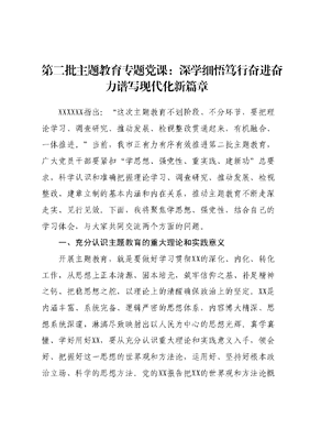 第二批主题教育专题党课:深学细悟笃行奋进奋力谱写现代化新篇章XXXXXX指出:这次主题教育不划阶段、不分环节,要把理论学习、调查研究、推动发展、检视整改贯通起来,有机融合、一体推进。当前,我市正有力有序有效推进第二批主题教育,广大党员干部要紧扣学思想、强党性、重实践、建新功总要求,科学认识和准确把握理论学习、调查研究、推动发展、检视整改、建章立制的基本内涵和内在关系,推动主题教育不断走深走实、见行见效。下面,我将聚焦学思想、强党性,结合自己的学习体会,与大家共同交流两个方面的问题。一、充分认识主题教育的重大理论和实践意义开展主题教育,就是要做好学习贯彻XX的深化、内化、转化工作,从思想上正本清源、固本培元,筑牢信仰之基、补足精神之钙、把稳思想之舵,以理论上的清醒确保政治上的坚定。XX是内涵丰富、系统完备、逻辑严密的思想体系,内容博大精深、思想系统深邃,淋漓尽致映射出以人民为中心的思想光辉。真学真懂、学好用好XX,要从充分认识重大理论和实践意义入手,领会好、把握好这一思想的世界观和方法论,运用好、坚持好根本政治立场、科学的思想方法。党的XX报告把XX的世界观和方法论概括为六个坚持,即必须坚持人民至上、坚持自信自立、坚持守正创新、坚持问题导向、坚持系统观念、坚持胸怀天下,这是XX活的灵魂,集中体现了XX的理论价值和实践意义。一是XX开宗明义坚持人民至上,这同民惟邦本、本固邦宁思想一脉相承,在不同的时空当中掀起了古老同源的记忆,进一步彰显了我们党同人民群众生死相依、休戚与共的血肉联系二是XX有着自信自立的鲜明特质,这是对马克思主义的坚定信仰和对中国特色社会主义的坚定信念,这种自信自立的特质,激励着我们党员干部不断把惠民生的事情办实、暖民心的事情办细、顺民意的事情办好,让现代化建设成果更多、更公平的惠及人民群众。三是XX映射了守正与创新相辅相成的关系,深刻阐释了变与不变的辩证统一,在坚持马克思主义基本原理不动摇、坚持党的全面领导不动摇、坚持中国特色社会主义不动摇的前提条件下,面对世界百年未有之大变局,我们党立破并举丰富发展马克思主义认识论和唯物辩证法,以原创性理论贡献标注了马克思主义中国化、时代化的新飞跃。四是XX鲜明特点是自始至终贯穿着科学的方法论,致力于发现问题、探寻答案的闭环过程,聚焦践行实践遇到的新问题、改革发展稳定存在的深层次问题、人民群众急难愁盼问题、国际变局中的重大问题、党的建设面临的突出问题,伴以智慧的灵光以新理念、新思路、新办法,推动党和国家事业取得历史性成就、发生历史性变革。五是XX符合唯物辩证法的联系观,遵循事物是普遍联系、事物内部各要素是相互影响、相互制约的原则,在运用其指导实践推动工作的过程中,自觉嵌入前瞻性思考、全局性谋划和整体性推进,为完成新时代、新征程中国共产党的使命任务提供了根本遵循和科学路径。六是XX弘扬着胸怀天下的价值理念,在坚定中国共产党是致力于为中国人民谋幸福、为中华民族谋复兴、为人类谋进步、为世界谋大同的百年大党的同时,提出了人类命运共同体理念,为解决人类面临的共同问题提供了中国智慧、中国方案和中国力量二、深刻理解XX的世界观和方法论不断增进对XX的政治认同、思想认同、理论认同、情感认同就是要坚持、运用好辩证唯物主义和历史唯物主义的世界观、方法论,世界观可以帮助我们解决是什么的问题,方法论可以帮助我们解决怎么办的问题。XX是一门用马克思主义基本原理来思考和研究中国问题和中国实践的学问和学科,本次XX的目的就是要让党员干部集中时间、集中精力,通读、精读、研读原著原文原理,学习贯穿XX中的世界观和方法论,运用该思想的世界观和方法观想问题、做决策、抓工作。对标XX省,XXXXXX情系XX大地,党的XX以来,XXXXXX先后六次亲临XX并作出重要讲话、重要指示,给予XX极大的政治关怀、思想指引、奋斗感召和精神鼓舞,这一系列重要讲话、重要指示,深刻阐明了事关XX发展的一系列方向性、根本性、战略性问题,是XX的XX定制版和精华篇为做好新时代、新征程XX各项工作指明了前进方向、提供了根本遵循。作为应急管理战线上的党员干部,我们应急人务必要坚持不懈用XX凝心铸魂,务必要深刻理解XXXXXX重要讲话、重要指示精神的核心要义、务必要运用好贯穿其中的立场、观点和方法,切实把XXXXXX重要要求转化为安全生产、应急救援和防灾减灾救灾的工作重点,在更高起点上不断推进应急管理体系和能力现代化,全力保障人民群众生命财产的绝对安全。一是坚持人民至上、生命至上理念,这是贯穿XX的一条红线,折射到安全生产和应急管理工作的全过程,就是要聚焦冬春防火、夏秋防汛、全年防灾抓安全,唱好安全四季歌,以高水平安全防范工作服务好经济社会高质量发展的全过程。二是务必准确把握应急局首先是政治机关的重要定位,要始终强化