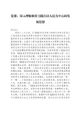 党课:深入理解和着力践行以人民为中心的发展思想同志们:党的十八大以来,以XXX同志为核心的党中央将马克思主义政治经济学基本原理与新时代中国经济发展实践相结合,以强烈的历史主动精神和责任担当敏锐洞察我国经济社会发展新情况新趋势,以满足人民日益增长的美好生活需要为根本目的,围绕新时代中国特色社会主义经济发展重大理论和实践问题,深刻总结并充分运用我国经济发展的成功经验,创造性地提出一系列治国理政新理念新思想新战略,形成和发展了XXX经济思想。XXX经济思想深刻回答了新时代经济发展怎么看、怎么干等重大理论和实践问题,丰富和完善了中国特色社会主义政治经济学理论体系,开拓了当代中国马克思主义政治经济学的新境界。XXX经济思想是马克思主义政治经济学中国化时代化的最新理论成果,是党和国家十分宝贵的精神财富,必须长期坚持、不断丰富发展。人民性是马克思主义政治经济学最首要的理论品格。XXXXXX强调:人民是我们党执政的最深厚基础和最大底气。为人民谋幸福、为民族谋复兴,这既是我们党领导现代化建设的出发点和落脚点,也是新发展理念的根和魂。只有坚持以人民为中心的发展思想,坚持发展为了人民、发展依靠人民、发展成果由人民共享,才会有正确的发展观、现代化观。XXX经济思想坚持人民至上的价值取向,具有鲜明的人民性,其理论体系始终贯穿着一条鲜明的主线,即坚持以人民为中心。只有深入理解坚持以人民为中心这一根本立场,才能更深刻地领会、把握和运用XXX经济思想,深化对中国特色社会主义发展规律的把握,深化对当今世界发展形势和人类社会发展规律的理解,科学回答我国经济社会发展新阶段面临的新情况新问题,更加自觉地依靠人民的磅礴力量发展中国特色社会主义经济,向着全面建成社会主义现代化强国的宏伟目标奋勇前进。下面,我讲几点意见,与同志们共同交流。第一,坚持以人民为中心体现了马克思主义政治经济学的根本立场立场,是人们观察、分析和处理问题的立足点。立场不同对同一个事物的看法不同,其确立、运用的理论以及战略策略也不同。坚持以人民为中心,体现了马克思主义政治经济学的根本立场。人民群众是社会物质财富和精神财富的创造者。物质资料生产是一切历史的前提,没有一定的物质资料生产,就不可能有人类历史。马克思主义高度重视人民的历史作用,阐释了人民群众是历史的创造者,是社会变革的决定力量。马克思主义政治经济学从人民的立场出发,深刻揭示资本主义的矛盾和运动规律及其剥削的本质,指出无产阶级和劳动人民是破除资本主义桎梏、发展生产力的革命力量。马克思主义政治经济学从物质资料生产出发,围绕剩余价值的生产、实现和分配,阐发资本主义生产方式必然导致社会两极分化的事实,主张无产阶级将利用自己的政治统治,一步一步地夺取资产阶级的全部资本,把一切生产工具集中在国家即组织成为统治阶级的无产阶级手里,尽可能快地增加生产力的总量,最终实现人自由而全面的发展。中国共产党一经诞生,就把为中国人民谋幸福、为中华民族谋复兴确立为自己的初心使命,始终坚持共产主义理想和社会主义信念,团结带领全国各族人民为争取民族独立、人民解放和实现国家富强、人民幸福而不懈奋斗,中国人民彻底摆脱了被欺负、被压迫、被奴役的命运,成为国家、社会和自己命运的主人。社会主义革命和建设时期,我们党坚持从人民立场出发,团结带领广大人民集中力量发展社会生产力,逐步解决人民对于经济文化迅速发展的需要同当前经济文化不能满足人民需要的状况之间的矛盾,建立起独立的比较完整的工业体系和国民经济体系,农业生产条件显著改变。我们党领导人民完成社会主义革命,消灭一切剥削制度,实现了中华民族有史以来最为广泛而深刻的社会变革,实现了一穷二白、人口众多的东方大国大步迈进社会主义社会的伟大飞跃,所取得的独创性理论成果和巨大成就,为在新的历史时期开创中国特色社会主义提供了宝贵经验、理论准备和物质基础。改革开放和社会主义现代化建设新时期,我们党作出把党和国家工作中心转移到经济建设上来、实行改革开放的历史性决策,确立社会主义初级阶段基本路线,解放和发展社会生产力,着力解决人民日益增长的物质文化需要同落后的社会生产之间的矛盾,取得的伟大成就举世瞩目,我国实现了从生产力相对落后的状况到经济总量跃居世界第二的历史性突破,实现了人民生活从温饱不足到总体小康、奔向全面小康的历史性跨越,推进了中华民族从站起来到富起来的伟大飞跃。中国特色社会主义进入新时代,我们党继续牢牢扭住经济建设这个中心,集中力量解决人民日益增长的美好生活需要和不平衡不充分的发展之间的矛盾,全面建成小康社会目标如期实现,国家经济实力大幅跃升。在XXX经济思想的科学指引下,我国经济建设取得重大成就,经济发展平衡性、协调性、可持续性明显增强。XXX经济思想蕴含着鲜明的人民立场,是运用马克思主义政治经济学基本原理对新时代中国经济发展实践作