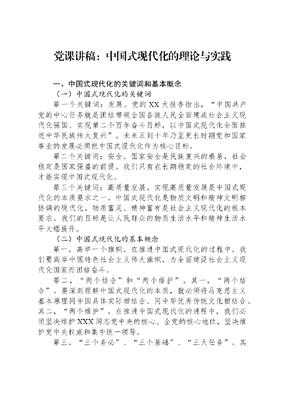 党课讲稿:中国式现代化的理论与实践一、中国式现代化的关键词和基本概念(一)中国式现代化的关键词第一个关键词:发展。党的XX大报告指出,中国共产党的中心任务就是团结带领全国各族人民全面建成社会主义现代化强国、实现第二个百年奋斗目标,以中国式现代化全面推进中华民族伟大复兴。未来五到十年乃至更长时期党和国家事业的发展必须把中国式现代化作为核心目标。第二个关键词:安全。国家安全是民族复兴的根基,社会稳定是国家强盛的前提。我们只有在长期稳定的社会环境中,才能实现中国式现代化。第三个关键词:高质量发展。实现高质量发展是中国式现代化的本质要求之一。中国式现代化是物质文明和精神文明相协调的现代化。物质富足、精神富有是社会主义现代化的根本要求。我们的目标是让人民群众的物质生活水平和精神生活水平大幅提升。(二)中国式现代化的基本概念第一,高举一个旗帜。在推进中国式现代化的过程中,我们要高举中国特色社会主义伟大旗帜,为全面建设社会主义现代化国家而团结奋斗。第二,两个结合和两个维护。其一,两个结合。要深刻理解中国式现代化的本质,就必须将马克思主义基本原理同中国具体实际相结合、同中华优秀传统文化相结合。其二,两个维护。在推进中国式现代化的进程中,我们必须坚决维护XXX同志党中央的核心、全党的核心地位,坚决维护党中央权威和集中统一领导。第三,三个务必、三个基础、三大任务。其一,三个务必。在推进中国式现代化的进程中,我们务必不忘初心、牢记使命,务必谦虚谨慎、艰苦奋斗,务必敢于斗争、善于斗争。其二,三个基础。中国式现代化深深植根于中华优秀传统文化,体现科学社会主义的先进本质,借鉴吸收一切人类优秀文明成果。其三,三大任务。中国式现代化要完成发展、安全、高质量发展三大任务。第四,四个全面、四个自信、四个意识、四个伟大。其一,四个全面。全面建设社会主义现代化国家、全面深化改革、全面依法治国、全面从严治党是中国式现代化的具体目标。其二,四个自信。道路自信、理论自信、制度自信、文化自信是推进中国式现代化的根本保障。其三,四个意识。只有增强政治意识、大局意识、核心意识、看齐意识,才能更好地推进中国式现代化。其四,四个伟大。要想实现伟大梦想,必须进行伟大斗争、建设伟大工程、推进伟大事业。第五,五位一体、五大发展理念、五大特色五大原则、五个必由之路。其一,五位一体。推进中国式现代化要从经济建设、政治建设、文化建设、社会建设、生态文明建设五方面综合考虑。其二,五大发展理念。推进中国式现代化必须坚持创新、协调、绿色、开放、共享五大发展理念。党的十八大以来,我们一直通过五大发展理念促进中国经济社会结构转型升级。其三,五大特色。党的XX大报告指出,中国式现代化有五大特色,即中国式现代化是人口规模巨大的现代化、全体人民共同富裕的现代化、物质文明和精神文明相协调的现代化、人与自然和谐共生的现代化、走和平发展道路的现代化。其四,五大原则。在推进中国式现代化的进程中,我们要坚持和加强党的全面领导、坚持中国特色社会主义道路、坚持以人民为中心的发展思想、坚持深化改革开放、坚持发扬斗争精神。其五,五个必由之路。在推进中国式现代化的进程中,全党必须牢记五个必由之路,即坚持党的全面领导是坚持和发展中国特色社会主义的必由之路,中国特色社会主义是实现中华民族伟大复兴的必由之路,团结奋斗是中国人民创造历史伟业的必由之路,贯彻新发展理念是新时代我国发展壮大的必由之路,全面从严治党是党永葆生机活力、走好新的赶考之路的必由之路。二、中国式现代化的本质要求党的XX大报告指出,中国式现代化的本质要求包括九条。第一,坚持中国共产党领导。中国共产党的初心使命是为中国人民谋幸福、为中华民族谋复兴。党和国家的一切发展事业都将以人民为中心的发展思想摆在首位。坚持中国共产党领导对推进中国式现代化起着基础和核心作用。第二,坚持中国特色社会主义。党的XX大报告指出,中国式现代化,是中国共产党领导的社会主义现代化。社会主义这个词非常关键,表明我们要在社会主义的意识形态、基本价值、社会主义制度之下推进中国式现代化。另外,推进中国式现代化的一个基本目标,就是要解决人民日益增长的美好生活需要和不平衡不充分的发展之间的矛盾问题。第三,实现高质量发展。当前,中国社会经济正处在转型升级的关键期。实现物质生活和精神生活共同富裕是推动我国经济社会高质量发展、实现社会主义现代化的必然要求。从产业发展角度看,我们必须加快产业的数字化、信息化发展进程。从社会管理角度看,我们要用新技术来武装自己高质量发展是系统性、整体性的发展。所以,我们不能把高质量发展仅理解为经济高质量,因为高质量发展还包括人们生活水平的高质量发展。