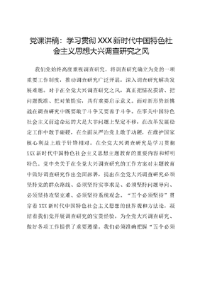 党课讲稿:学习贯彻XXX新时代中国特色社会主义思想大兴调查研究之风我们党始终高度重视调查研究,将调查研究确立为党的一项重要工作制度,推动调查研究广泛开展,深入调查研究解决发展难题。对于在全党大兴调查研究之风,真正把情况摸清、把问题找准、把对策提实,具有重要启示意义。面对新形势新挑战在调查研究中既要敢于斗争又要善于斗争。在事关中国特色社会主义前途命运的大是大非问题上坚定不移,在改革发展稳定工作中敢于碰硬,在全面从严治党上敢于动硬,在维护国家核心利益上敢于针锋相对。在全党大兴调查研究是学习贯彻XXX新时代中国特色社会主义思想主题教育的重要内容和鲜明特色。党中央关于在全党大兴调查研究的工作方案对主题教育中做好调查研究作出全面部署,提出在全党大兴调查研究必须坚持党的群众路线、必须坚持实事求是、必须坚持问题导向、必须坚持攻坚克难、必须坚持系统观念。五个必须坚持贯穿着XXX新时代中国特色社会主义思想的世界观和方法论,凝结着我们党开展调查研究的宝贵经验,为全党大兴调查研究、做好各项工作提供了重要遵循。我们必须准确把握五个必须坚持的丰富内涵和实践要求,把调查研究与理论学习、推动发展、检视整改有机融合、一体推进。一、必须坚持党的群众路线群众路线是我们党的生命线和根本工作路线。XXXXXX指出:开展调查研究就是走群众路线,没有调查就没有发言权,就没有决策权。党员干部要坚持群众观点、站稳人民立场,牢记江山就是人民、人民就是江山的深刻道理,自觉把自己当作群众的一员,把群众的事当作自己的事,把实现好、维护好、发展好最广大人民根本利益作为一切工作的出发点和落脚点,通过调查研究,进一步密切党群关系、干群关系。要坚守人民情怀,以百姓心为心,以心交心、将心比心,放下架子、扑下身子,身入基层、心到群众,拜人民为师,甘当小学生,虚心向群众学习,尊重群众首创精神,总结群众经验、反映群众意见、汲取群众智慧。要改进群众工作方法,既要继承党的群众工作的好传统,又要创新群众工作方法,充分运用互联网、大数据等现代信息技术,提高调查研究的科学性和精准性。要改进工作作风,多采取四不两直、蹲点调研等方式,深入农村、社区、企业、医院、学校、两新组织等基层单位,同群众坐在一条板凳上,直接听取群众意见,防止出现坐不下板凳、稳不住心神、说不上话现象。在调研中,要严格执行中央八项规定及其实施细则精神,轻车简从,不搞层层陪同,防止出发一车子、开会一屋子、发言念稿子式调研,不搞作秀式、盆景式、打卡式调研,避免扎堆调研、多头调研、重复调研,不给基层增加负担。要积极回应群众关切,对群众普遍关注的问题要及时解疑释惑、化解矛盾,把惠民生、暖民心、顺民意的工作做到群众心坎上,切实使调查研究的过程成为广大群众加深对党的创新理论认同和领悟的过程,成为密切党同人民群众血肉联系的过程。二、必须坚持实事求是实事求是是马克思主义的精髓,也是我们党的思想路线的核心。XXXXXX指出,能不能做到实事求是,是党和国家各项工作成败的关键。全党同志一定要把实事求是贯穿到各项工作中去,经常、广泛、深入开展调查研究。坚持实事求是,根本的是要一切从客观实际出发,研究和探求事物的发展规律,努力做到主观和客观的统一。要把实事求是的实事求是两个方面和调查研究的调查研究两个环节紧密结合起来,使调查研究的过程真正成为体现实事求是的过程。一方面,通过深入调查弄清实事,既看高楼大厦又看背阴胡同,既听顺耳话又听逆耳言,全面掌握丰富、生动的第一手材料,切实把实际情况摸实,把存在的问题摸准,把群众的所思所盼摸透。另一方面,通过深入研究去求是,探求和掌握事物本质和规律。在调查的基础上,对掌握的各方面一手材料下一番思考、分析、综合的功夫,经过交换、比较、反复,去粗取精、去伪存真,由此及彼、由表及里,把握事物本质,形成规律性认识,找到解决问题的正确办法,坚决避免调查多、研究少,情况多、分析少,不解决问题的调查研究。坚持实事求是,必须发扬理论联系实际的马克思主义学风,坚持运用党的创新理论分析问题、解决问题。要学深悟透XXX新时代中国特色社会主义思想,善于运用这一重要思想的世界观、方法论和贯穿其中的立场观点方法分析解决问题、推动事业发展。坚持实事求是,必须坚守党性原则。坚持实事求是既是思想方法、工作方法问题,更是党性问题。任何主观主义、形式主义、机械主义、教条主义、经验主义的观点,都是缺乏党性的表现,都是有害的、不可取的。在调研中,要坚持真理、修正错误,不唯书、不唯上、只唯实,有一是一、有二是二,坚决防止做表面文章,坚决反对弄虚作假行为。三、必须坚持问题导向马克思曾深刻指出:问题就是时代的口号,是它表现自己精神状态的最实际的呼声。坚持问题导向是马克思主义的鲜明特点。XXXXXX指