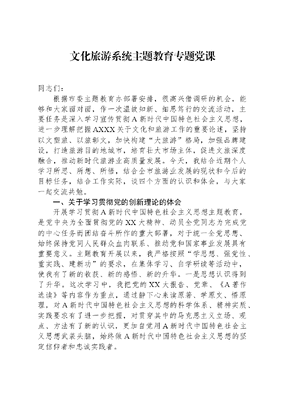 文化旅游系统主题教育专题党课同志们:根据市委主题教育办部署安排,很高兴借调研的机会,能够和大家面对面,作一次温故知新、细思笃行的交流活动,主要任务是深入学习宣传贯彻A新时代中国特色社会主义思想,进一步理解把握AXXX关于文化和旅游工作的重要论述,坚持以文塑旅、以旅彰文,加快构建大旅游格局,加强品牌建设,打造旅游目的地城市,培育壮大市场主体,促进文旅深度融合,推动新时代旅游业高质量发展。今天,我结合近期个人学习所思、所想、所悟,结合全市旅游业发展的现状和今后的目标任务,结合工作实际,谈四个方面的认识和体会,与大家一起交流共勉。一、关于学习贯彻党的创新理论的体会开展学习贯彻A新时代中国特色社会主义思想主题教育,是党中央为全面贯彻党的XX大精神、动员全党同志为完成党的中心任务而团结奋斗所作的重大部署,对于统一全党思想、始终保持党同人民群众血肉联系、推动党和国家事业发展具有重要意义。主题教育开展以来,我严格按照学思想、强党性、重实践、建新功的要求,在集体学习、自学研读等活动中,使我有了新的收获、新的感悟、新的升华。一是思想认识得到了升华。这次学习中,我把党的XX大报告、党章、《A著作选读》等内容作为重点,通过静下心来读原著、学原文、悟原理,对A新时代中国特色社会主义思想的科学体系、精神实质、实践要求有了进一步把握,对贯穿其中的马克思主义立场、观点、方法有了新的认识,更加自觉用A新时代中国特色社会主义思想武装头脑,始终做A新时代中国特色社会主义思想的坚定信仰者和忠诚实践者。二是党性修养得到了提高。通过学习AXXX关于党性修养的一系列重要论述,深刻认识到作为一名党员领导干部,要始终坚定理想信念、强化党性锻炼、提升党性修养、坚守党性原则,不断锤炼对党忠诚的政治品质,始终保持共产党人的浩然正气。时刻牢固树立党章意识,自觉用党章规范自己的一言一行,筑牢信仰之基、补足精神之钙、把稳思想之舵,在任何情况下坚决做到政治信仰不变、政治立场不移、政治方向不偏。三是使命担当得到了增强。XXX指出:干部敢于担当作为,既是政治品格,也是从政本分。在实际工作中,我将始终保持只争朝夕、奋发有为的奋斗姿态和越是艰险越向前的斗争精神,担当起应该担当的责任,始终把发展扭住,着力把重点抓住,坚持有什么问题就解决什么问题,什么问题突出就重点解决什么问题,勇于挑最重的担子、啃最硬的骨头、接最烫的山芋,在解决一个又一个问题中推动发展,真正做到不负重托、不辱使命。四是宗旨意识得到了深化。通过学习使我清醒的认识到,作为一名党员领导干部,要时刻牢记党的一切工作都是为了实现好、维护好、发展好最广大人民根本利益,时刻牢记全心全意为人民服务的根本宗旨。要把守初心、担使命体现到落实党中央决策部署和省市委工作要求上,体现到提升景区品质、丰富景区业态等一件件实际工作中,实干苦干,不务虚功,把主题教育的成果转化为践行党的根本宗旨的自觉行动。二、关于学习贯彻党的创新理论的感悟一是坚持深学细悟,方可提升能力素质。AXXX指出:好学才能上进,中国共产党人依靠学习走到今天,也必然要依靠学习走向未来。我们要坚持一篇一篇读原著、逐段逐句学原文,做到全面系统学、突出重点学、及时跟进学、反反复复学,深刻领会、准确把握A新时代中国特色社会主义思想的科学体系和丰富内涵,全面把握贯穿其中的立场观点方法,切实将主题教育学习成果转化为干事创业的强大动力。要做到真思、思透,真悟、悟透,知其言更知其义、知其然更知其所以然,切实悟出贯穿其中的中国共产党人的政治品格、价值追求、精神境界、作风操守,蕴藏其中的真理力量、实践力量、人格力量,坚持不懈用A新时代中国特色社会主义思想凝心铸魂。二是坚定理想信念,方可做到绝对忠诚。XXX指出,坚定理想信念,坚守共产党人精神追求,始终是共产党人安身立命的根本。坚定理想信念,重在绝对忠诚。作为党员干部,忠诚是第一位的要求。绝对忠诚和坚定理想信念是相通相致的,两者都体现出不谈条件和回报;都表现为严格履行责任、义务和操守,为党尽忠、为国尽职、为民尽责;都是人生最重要的品质,更是共产党人最重要的品质。对党绝对忠诚,最根本的就是用好党的创新理论,内化于心、外化于行,发自内心、坚定不移,树牢四个意识,坚定四个自信,做到两个维护,严守党的政治纪律和政治规矩,始终在政治立场、政治方向、政治原则、政治道路上同以同志为核心的党中央保持高度一致,做到任何时候都站得稳、靠得住、不动摇。三是树牢发展意识,方可全力抓好落实。坚定不移抓落实是我们党在革命、建设、改革各个历史时期,带领广大人民群众战胜一个又一个困难、夺取一个又一个胜利的重要法宝。正如AXXX所言,如果不沉下心来抓落实,再好的目标,再好的蓝图,也只是镜中花、水中月。党员领导干部要把抓落实作为一种政治自觉、政治要求,牢固树立发展为要