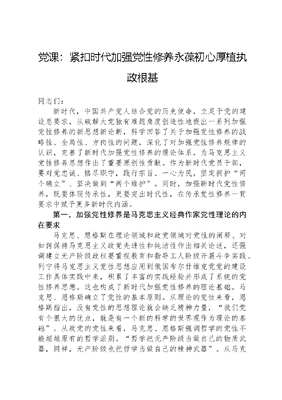 党课:紧扣时代加强党性修养永葆初心厚植执政根基同志们:新时代,中国共产党人结合党的历史使命,立足于党的建设总要求,从破解大党独有难题角度创造性地提出一系列加强党性修养的新思想新论断,科学回答了关于加强党性修养的战略性、全局性、方向性的问题,深化了对加强党性修养规律的认识,完善了新时代加强党性修养的理论体系,为马克思主义党性修养思想作出了重要原创性贡献。作为新时代党员干部,要对党忠诚、恪尽职守,践行宗旨、一心为民,坚定拥护两个确立、坚决做到两个维护。同时,加强新时代党性修养,既要体现传承性,更要突出时代性,在传承党性修养一贯要求中赋予更多新时代内涵。第一,加强党性修养是马克思主义经典作家党性理论的内在要求马克思、恩格斯在理论领域和政党领域对党性的阐释、对如何保持马克思主义政党先进性和纯洁性作出相关论述,还强调建立无产阶级政权要重视教育和指导工人阶级开展斗争实践。列宁将马克思主义党性思想应用到俄国布尔什维克党党的建设工作具体实践中来,积累了丰富的实践经验并形成了系统的党性修养思想。这也构成了新时代加强党性修养的理论基础。马克思、恩格斯确立了党性的基本原则。从理论的党性来看,恩格斯指出,没有党性的思想理论就会缺乏精神力量,我们党有个很大的优点,就是有一个新的科学的世界观作为理论的基础。从政党的党性来看,马克思、恩格斯强调哲学的党性不能超越原有的哲学派别。哲学把无产阶级当做自己的物质武器,同样,无产阶级也把哲学当做自己的精神武器。从马克思主义政党的先进性和纯洁性来看,马克思、恩格斯强调,无产阶级的思想武器具有鲜明的党性,要时刻保持着与广大无产阶级的密切联系并代表着他们的利益,领导无产阶级运动,明确阐释了共产党的阶级性、批判性和战斗性。另外,马克思、恩格斯还强调了组织纪律对马克思主义政党保持战斗力的重要性,要求马克思主义政党要善于通过批评和自我批评来加强党的作风建设、提高党的战斗力。列宁将党性概念纳入到无产阶级政党的党建领域。从哲学的党性来看,列宁提出哲学是具有党性的重要论断,强调党性和非党性的问题即使不是最重要的问题,至少也是重要的问题之一,要求无产阶级政党应该时刻与非党性作斗争。列宁从哲学的党性视角阐释了党员要把马克思主义哲学作为精神武器,必须具备辩证唯物主义世界观、绝对服从党、始终忠于党、具有严格的组织纪律性。从政治的党性来看,列宁强调,党员作为一名马克思主义者无论何时处理任何问题都必须直率而又公开站在无产阶级的立场上,坚持运用辩证唯物主义分析和解决问题。第二,加强党性修养是传承和发扬中国共产党宝贵经验和优良传统的自觉要求百年来,中国共产党始终高度重视加强党性修养,善于提炼加强党性修养的成功经验,从党性修养视角回答了不同历史时期加强党的建设的时代之问,进而形成了系统的党性修养思想。这也是深刻领悟中国共产党成功实现由弱变强、由领导人民为夺取全国政权而奋斗的党,转变为在全国执政并长期成功执政的党的思想理论密码。加强党性教育、增强党员党性修养,关系到党的执政地位稳固。新时代以来,为了解决党内存在的深层次矛盾,中国共产党将加强党性修养纳入到全面从严治党战略中,明确了新时代党性修养的理论内涵、提出增强党性修养的科学举措,要求全党同志特别是高级干部要加强党性锻炼,不断提高政治觉悟和政治能力,把对党忠诚、为党分忧、为党尽职、为民造福作为根本政治担当。从普通党员到高级干部都在时代历练中锻炼了党性,展现出新时代中国共产党人忠诚干净担当的政治本色。这也充分体现出新时代中国共产党人对加强党性修养优良传统的继承发展和宝贵经验的具体应用。第三,加强党性修养是促进党员干部健康成长的重要保障党性需要在学习和实践中逐步提升。党性是党员、干部立身、立业、立言、立德的基石。只有将党性修养作为坚定理想信念的核心工作来抓,才能打造出能够经受住各种风险和困难考验、自觉抵制各种腐朽思想侵蚀的党员干部队伍。应对国际环境风云变幻的现实要求。当今世界正处于大发展大变革大调整时期,这给我国发展带来有利机遇的同时,也带来严峻挑战。面对这些挑战,我国迫切需要发挥党员干部的优势作用,进一步加强党员干部的党性修养,以巩固党的长期执政地位。特别是在意识形态领域的斗争,我国迫切需要党员干部自觉坚持马克思主义指导地位,自觉坚持两个确立、坚决做到两个维护,不断加强党性修养,进而不断提高党应对国际环境深刻复杂变化的能力和水平。新时代实现中华民族伟大复兴奋斗目标的必要保障。新时代,我国社会主要矛盾发生根本变化,确立了新的奋斗目标,这对党的执政能力建设和党员的党性修养提出新的更高要求。特别是我国已经进入全面深化改革的攻坚期,改革的风险和难度不断加大,给实现中华民族伟大复兴奋斗目标带来严峻挑战。伟大斗争的艰巨性、长期性和复杂性,要求党员干部要自觉克服困难、坚定信