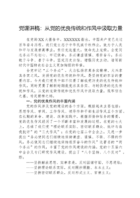 党课讲稿:从党的优良传统和作风中汲取力量在党的XX大报告中,XXXXXX指出,中国共产党已走过百年奋斗历程。我们党立志于中华民族千秋伟业,致力于人类和平与发展崇高事业,责任无比重大,使命无上光荣。全党同志务必不忘初心、牢记使命,务必谦虚谨慎、艰苦奋斗,务必敢于斗争、善于斗争,坚定历史自信,增强历史主动,谱写新时代中国特色社会主义更加绚丽的华章。全党牢记三个务必,大力弘扬求真务实精神、大兴求真务实之风,发扬党的优良传统和作风,是坚持党的宗旨的重要内容。今天我们党员干部不仅要了解我党历史的优良传统和作风,同时更要了解新时期我党求真务实、与时俱进的优良传统和作风,从党的光荣传统和优良作风中汲取力量,筑牢信念之基、补足精神之钙。一、党的优良作风的丰富内涵党的作风涉及党的建设的各个方面,概括起来主要包括:思想作风、学风、工作作风、领导作和干部生活作风五个方面。在长期的革命、建设、改革实践中,根据形势和任务的需要,党的优良作风经历了一个不断丰富和发展的过程。在党的七大上,总结了我们党理论联系实际、密切联系群众、批评与自我批评的三大作风;在党的七届二中全会上,又进一步提出务必使同志们继续地保持谦虚、谨慎、不骄、不躁的作风,务必使同志们继续地保持艰苦奋斗的作风这著名的两个务必的作风,丰富了党的作风建设的内涵。党的十五届六中全会又专门研究作风建设,提出了八个坚持、八个反对,即:——坚持解放思想、实事求是,反对因循守旧、不思进取;——坚持理论联系实际,反对照抄照搬、本本主义;——坚持密切联系群众,反对形式主义、官僚主义;——坚持民主集中制原则,反对独断专行、软弱涣散;——坚持党的纪律,反对自由主义;——坚持清正廉洁,反对以权谋私;——坚持艰苦奋斗,反对享乐主义;——坚持任人唯贤,反对用人上的不正之风。二、党的三大作风在1945年4月党的七大上,毛泽东同志第一次概括了我们党的三大作风,即理论联系实际,密切联系群众,批评与自我批评。鲜明指出,这三大作风是我们党区别于其他任何政党的显著标志。进入新阶段,时代赋予了党的三大作风以新的内涵。第一,理论联系实际。这是我们党一贯的思想原则,是马克思主义的学风,是我们学习运用马克思主义的根本方法。理论联系实际的核心内容,就是要用马克思主义的立场、观点、方法来研究解决我国改革开放和现代化建设中遇到的新情况和新问题。坚持理论联系实际,前提是掌握理论,加强理论武装;目的是指导实践,推动各项工作。每个党员在革命实践当中,都要密切联系本职工作的实际,联系自己的思想实际,刻苦学习理论,学以致用,做到理论与实际相结合、学习与运用相统一,在马克思主义理论的指导下创造性地开展工作。第二,密切联系群众。这是我们党的政治优势,是加强党的执政能力建设的核心,是实现党的全心全意为人民服务宗旨的前提条件。密切联系群众的基本要求是:时时处处关心群众,坚定不移依靠群众,倾听群众呼声、满足群众需求、尊重群众的创造精神、带领群众前进。每个党员都要牢牢记住,在任何时候、任何情况下,与人民群众同呼吸共命运的立场不能变,全心全意为人民服务的宗旨不能忘,坚信群众是真正的英雄的历史唯物主义观点不能丢。这三个不能,应该成为我们每个党员的座右铭。第三,批评和自我批评。这是我们党开展党内生活、调整党内关系、解决党内矛盾的一大法宝。只有拿起这个武器,经常地开展批评和自我批评,才能有效地抵制各种不良风气对党员的侵蚀,才能及时地纠正党员的缺点和错误。正确开展批评和自我批评要本着对党、对人民、对组织、对同志高度负责的态度,从团结的愿望出发,做到自我批评要诚恳,相互批评要中肯。既要严肃认真,又要心平气和。批评要讲政治,坚持实事求是的原则和惩前毖后、治病救人的方针,允许同志对自己的缺点、错误有一个认识的过程。批评不能庸俗化,更不能泄私愤、搞报复、借机整人。我们在日常的工作学习中,要把积极健康的思想历练开展起来,达到统一思想、增进团结、共同提高、促进工作的目的。三、三个务必的作风三个务必是我们党在长期革命实践中形成的优良作风影响和培育了一代又一代共产党人。在全面建设社会主义现代化国家新征程中,党要牢记三个务必,以良好的精神状态和工作作风,推进中国特色社会主义伟大事业。全党同志要牢记我国的基本国情和党的庄严使命,增强忧患意识,居安思危,为实现党所确定的目标开拓进取、团结奋斗。第一,牢记三个务必,要求我们大力弘扬艰苦奋斗的优良传统作风。我们党是靠艰苦奋斗起家的,也是靠艰苦奋斗发展壮大、成就伟业的。我们所熟悉的伟大建党精神、井冈山精神、长征精神、延安精神、西柏坡精神、铁人精神、两弹一星精神、抗洪精神和抗震救灾精神等,其核心就是艰苦奋斗。正是靠着这种精神和作为其外在表现的优良作风,我们党才建立起与人民群众的鱼水之情,才