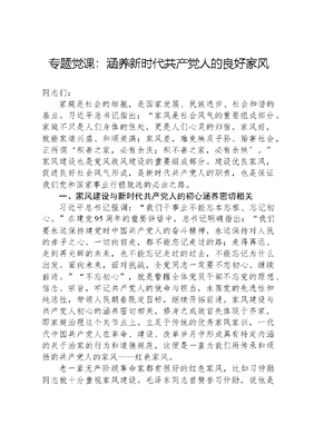 专题党课:涵养新时代共产党人的良好家风同志们:家庭是社会的细胞,是国家发展、民族进步、社会和谐的基点。习近平总书记指出:家风是社会风气的重要组成部分。家庭不只是人们身体的住处,更是人们心灵的归宿。家风好,就能家道兴盛、和顺美满;家风差,难免殃及子孙、贻害社会,正所谓积善之家,必有余庆;积不善之家,必有余殃。家风建设也是党风政风建设的重要组成部分。建设优良家风,促进良好社会风气形成,是新时代共产党人的职责,也是保证我们党和国家事业行稳致远的必由之路。一、家风建设与新时代共产党人的初心涵养密切相关习近平总书记强调:我们干事业不能忘本忘祖、忘记初心。在建党95周年的重要讲话中,总书记明确指出:我们要永远保持建党时中国共产党人的奋斗精神,永远保持对人民的赤子之心。一切向前走,都不能忘记走过的路;走得再远、走到再光辉的未来,也不能忘记走过的过去,不能忘记为什么出发。面向未来,面对挑战,全党同志一定要不忘初心、继续前进。不忘初心,就是警醒全体党员干部不忘党的理想、信念、宗旨,牢记共产党人的使命与担当,永葆党的先进性和纯洁性,带领人民朝着既定目标,继续开拓前进。家风建设与共产党人初心的涵养密切相关,修身之成效首先体现于齐家,即家庭治理这个关节点上。立足于传统的优秀家风家训,一代代中国共产党人在革命、建设、改革岁月中形成具有特定内涵的关于治家的行为和道德规范,这便是一直为我们所传承和颂扬的共产党人的家风——红色家风。老一辈无产阶级革命家都有很好的红色家风,比如习仲勋同志就十分重视家风建设。毛泽东同志曾赞誉习仲勋,说他是一位从群众中走出来的群众领袖。作为一位从陕北黄土地走出来的革命领袖,习仲勋对于群众的感情是真心实意、发自肺腑的,他把常思群众之苦融入家庭教育的每一个环节。2001年,家人为习仲勋举办88岁寿宴,亲朋好友汇聚一堂,唯独时任福建省省长的习近平因工作原因没到场。对此,他毫不介怀地说:为人民服务,就是对父母最大的孝!加强家风建设是弘扬伟大建党精神、赓续红色血脉的现实需要。红色家风蕴含着坚守信仰、对党忠诚的家国情怀,蕴含着人民至上、不负人民的初心使命。担当天下,忧乐天下,以天下为己任,应该成为新时代共产党人的基本价值追求。如果没有强烈的家国情怀和责任担当,就不可能有切实有效的价值观构建,就不可能有自觉自律的家风建设。走好新时代新征程的赶考之路,党员干部必须弘扬革命先辈的好家风好传统,廉洁修身齐家,做家风建设的表率。二、以优良家风正民风、促政风、纯党风习近平总书记曾多次强调,不论时代发生多大变化,不论生活格局发生多大变化,我们都要重视家庭建设,注重家庭、注重家教、注重家风自然生态要山清水秀,政治生态也要山清水秀。我们党历来高度重视家风建设。《中国共产党廉洁自律准则》第一条(坚持公私分明,先公后私,克己奉公)、第八条(廉洁齐家,自觉带头树立良好家风),正是强调重视家风建设的深远意义。党风建设引领社会风气和家风建设;而家风建设的成败,则直接关乎社会是否风清气正,同时也关乎党风建设的基础是否牢固。只有培育文明风尚,强化行为善成,逐步提升家庭成员的文明素质,以优良家风正党风、促政风、带民风,才能不断推进家风建设向纵深发展。家风正则民风淳,民风淳则社风清,社风清则社稷安。传统中国社会主流思想中,修身正己立德,一直被强调是做人处事,尤其是为官从政的基本要求。儒家经典《礼记·大学》有明明德、亲(新)民、止于至善之三纲领,更有格物、致知、诚意、正心、修身、齐家、治国、平天下之八条目。三纲领和八条目,是儒家内圣外王之学的精髓,我们在新时代吸收借鉴并推动儒家内圣外王思想的创造性转化和创新性发展,可以建构一套修己与安人相结合的人格修养之道:修身为本、齐家为基、治国为要、天下为怀。齐家,家既是修身之所,也是检验修身是否成功的第一块试金石。齐家是廉之基,廉是齐家之始,家风连着党风。立家规,正家风,正是新时代共产党人不忘初心的必然要求。作为新时代的共产党人,要自觉把家风建设与加强党员干部的道德教育结合起来,切实践行三严三实:严以修身、严以用权、严以律己,谋事要实、创业要实、做人要实。君子之德风,小人之德草,草上之风,必偃。新时代共产党人要弘扬中华优秀传统文化和传统美德,以德铸魂、以德化俗、以德立人,做到崇德治家、清风传家。三、优良的传统家风既要传承弘扬,又要转化发展传统中国的家规家训,是中华优秀传统文化的重要组成部分,也是中华传统美德的重要载体。我国古代有极为丰富的家规家训资源,比如北齐颜之推的《颜氏家训》、明清时代孙奇逢的《孝友堂家训》等,都是从崇德向善这种关乎人生底线的价值理念入手,展开其阐述和训诫的。中华优秀传统文化中的优良家风家训家规,与社会主义核心价值观有着天然的契合性,值得