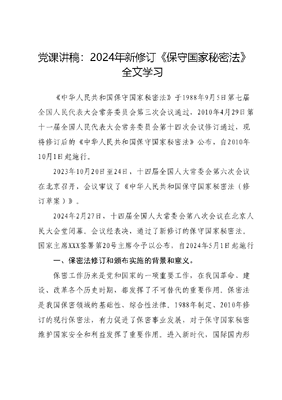 党课讲稿:2024年新修订《保守国家秘密法》全文学习《中华人民共和国保守国家秘密法》于1988年9月5日第七届全国人民代表大会常务委员会第三次会议通过,2010年4月29日第十一届全国人民代表大会常务委员会第十四次会议修订通过,现将修订后的《中华人民共和国保守国家秘密法》公布,自2010年10月1日起施行。2023年10月20日至24日,十四届全国人大常委会第六次会议在北京召开,会议审议了《中华人民共和国保守国家秘密法(修订草案)》。2024年2月27日,十四届全国人大常委会第八次会议在北京人民大会堂闭幕。会议经表决,通过了新修订的保守国家秘密法。国家主席XXX签署第20号主席令予以公布,自2024年5月1日起施行一、保密法修订和颁布实施的背景和意义。保密工作历来是党和国家的一项重要工作,在我国革命、建设、改革各个历史时期,都发挥了不可替代的重要作用。保密法是我国保密领域的基础性、综合性法律。1988年制定、2010年修订的现行保密法,有力促进了保密事业发展,对于保守国家秘密维护国家安全和利益发挥了重要作用。进入新时代,国际国内形势发生深刻变化,科技发展最新讲话系列,保密工作面临一些新问题新挑战。为更好地适应新形势新任务,有必要对保密法进行修改完善。这次保密法修订以XXX新时代中国特色社会主义思想为指导,深入贯彻党中央关于保密工作的决策部署和XXXXXX重要指示批示精神,全面贯彻XXX法治思想,坚持总体国家安全观,统筹发展与安全,将党的十八大以来保密工作成熟有效的政策措施和实践经验上升为法律制度,为切实筑牢国家秘密安全防线提供了更加有力的法治保障。保密法修订,是加强保密法治建设的重大成果,是健全国家安全体系的必然要求,对于推动保密工作高质量发展维护国家主权、安全、发展利益具有重要而深远的意义。二、保密法修订的主要内容保密法此次修订坚持总体国家安全观,统筹发展与安全,将党的十八大以来保密工作成熟有效的政策措施和实践经验上升为法律制度,对于推动保密工作高质量发展,维护国家主权、安全发展利益具有重要而深远的意义。新修订的保密法在总则中规定坚持中国共产党对保守国家秘密工作的领导,明确中央保密工作领导机构领导全国保密工作,研究制定、指导实施国家保密工作战略和重大方针政策,统筹协调国家保密重大事项和重要工作,推进国家保密法治建设。文可居文库——海量学习资料,手机电脑下载www.wenkeju.com此次修订吸收了一些工作实践中定密和解密的成熟做法,包括:明确保密事项范围的确定应当遵循必要、合理原则,科学论证评估,并根据情况变化及时调整;完善定密责任人制度和定密授权机制,并对密点标注作出原则规定,进一步推动定密精准化科学化;完善国家秘密审核制度,将定期审核修改为每年审核,并明确了未履行解密审核责任造成严重后果的法律责任,进一步压实定密机关、单位主体责任,便利信息资源合理利用。新修订的保密法还体现出对于保密科技创新和科技防护的重视,在总则中明确国家鼓励和支持保密科学技术研究和应用,提升自主创新能力,依法保护保密领域的知识产权。此次修订还明确,涉密信息系统应当按照国家保密规定和标准规划、建设、运行、维护,应按规定检查合格方可投入使用,并定期开展风险评估。为适应当前涉密人员管理的新特点、新要求,此次修订补充细化了涉密人员基本条件、权益保障和管理要求等方面的规定。三、《保密法》全文学习第一章总则第一条为了保守国家秘密,维护国家安全和利益,保障改革开放和社会主义现代化建设事业的顺利进行,根据宪法,制定本法。文可居文库——海量学习资料,手机电脑下载www.wenkeju.com第二条国家秘密是关系国家安全和利益,依照法定程序确定在一定时间内只限一定范围的人员知悉的事项。第三条坚持中国共产党对保守国家秘密(以下简称保密)工作的领导。中央保密工作领导机构领导全国保密工作,研究制定指导实施国家保密工作战略和重大方针政策,统筹协调国家保密重大事项和重要工作,推进国家保密法治建设。第四条保密工作坚持总体国家安全观,遵循党管保密、依法管理,积极防范、突出重点,技管并重、创新发展的原则,既确保国家秘密安全,又便利信息资源合理利用。法律、行政法规规定公开的事项,应当依法公开。第五条国家秘密受法律保护。一切国家机关和武装力量、各政党和各人民团体、企业事业组织和其他社会组织以及公民都有保密的义务。任何危害国家秘密安全的行为,都必须受到法律追究。第六条国家保密行政管理部门主管全国的保密工作。县级以上地方各级保密行政管理部门主管本行政区域的保密工作。第七条国家机关和涉及国家秘密的单位(以下简称机关、单位)管理本机关和本单位的保密工作。中央国家机关在其职权范围内管理或者指导本系统的保密工作。文可居文库——海量学习资料,手机电脑下载www.wenk