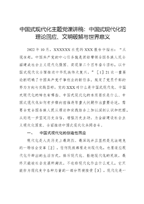 中国式现代化主题党课讲稿:中国式现代化的理论回应、文明破解与世界意义2022年10月,XXXXXX在党的XXX报告中指出:从现在起,中国共产党的中心任务就是团结带领全国各族人民全面建成社会主义现代化强国、实现第二个百年奋斗目标,以中国式现代化全面推进中华民族伟大复兴。[1]21这一重要论断明确了中国共产党干事创业的新任务,规定了党员干部的努力方向与实践目标。党的XXX对什么是中国式现代化、中国式现代化的特色有哪些、中国式现代化的本质要求是什么、中国式现代化如何有步骤向前推进等重大问题作出重要论述,需要全党全国各族人民从理论和实践结合上加以深刻认识和把握,从而进一步坚定历史自信,增强历史主动,为全面建设社会主义现代化国家、全面推进中国式现代化共同奋斗。一、中国式现代化的创造性回应现代化是人类历史上最剧烈、最深远并且显然是无法避免的一场社会变革[2]。任何民族都要走向现代化,也要适应现代化开辟出的生活方式。排斥现代化、拒绝现代化的民族,最终只能被社会发展所淘汰。不论给现代化作出什么定义,它只能作为现代史中各种力量的一部分而被接受[3]。现代化是一个流动概念,不同时期具有不同的内涵,因此,我们绝不能一成不变地理解现代化,否则便无异于刻舟求剑。衡量一个国家、一个社会的现代化水平,具体指标也随着时间变化有所变化。环顾历史、展望古今,中华民族曾长期领先世界,创造出了令各国刮目相看的辉煌成就。来自中国的发明创造与经验积累通过丝绸之路的文明交流,深刻影响了世界走势、人类发展。无论是器物层面,抑或是制度层面,中华民族都曾被视为样板与范例,成为世界其他国家争相学习的榜样。但也正因长期领先世界,封建帝国逐渐在自我标榜的因循守旧中丧失了拓新知于海外的能力。在闭关锁国的盲目自大下,中华民族逐渐落后于世界潮流。鸦片战争以后,从世界各国发展格局与力量对比中,可以深刻感受李鸿章惊呼三千年未有之大变局的内心独白。1840年是中华民族发展史上遭遇不幸的转折点,国际角色与世界地位由主动转变为被动。自此之后,独立的封建王朝开始沦为帝国主义的附庸,人民群众开始遭受封建主义与帝国主义的双重压迫,背负着沉重的苛捐杂税,田赋厘金。半殖民地半封建的社会性质使近代中国长期陷入困局之中。由此可见,一个曾经长期领先世界的民族翻转式地落后于世界,无疑冲击着民族心理。故而,实现中华民族伟大复兴成为人民希文可居文库——海量学习资料,手机电脑均可下载www.wenkeju.com冀、国家关切。近代中国的国情向中华民族提出了重要命题:曾经长期领先世界的民族,能否实现复兴,能否赶上现代化潮流?可以说,实现现代化是中华民族面临的世纪难题。为了寻觅这一问题的答案,不同阶级、阶层人士几乎先后尝试了当时世界上所有的实践方案,但在帝国主义与封建主义的裹挟下,结果总是不遂人愿。从历史眼光看,现代化对中国来说有着败也萧何、成也萧何的意味。近代中国不同阶级、阶层人士探索现代化、工业化的成败得失,见证了中华民族奋起直追却也充满无奈的艰难历程。说败也萧何,意思是说近代中国是被现代化大潮淘汰出局的。曾经长期领先世界发展的传统文明古国,由于西方近代工业革命的历史变革而落伍时代,被世界边缘化。第一次鸦片战争后,半殖民地半封建的中国始终受到西方现代化国家的排斥和压榨,现代化导致了中国的衰败。当然,那个时候的现代化不能与今日今时的现代化同日而语。从中国先进分子的世界认知中,彼时的现代化更多指的是工业化,尽管工业化是对现代化概念的窄化,但却代表着最先的夙愿表达。从这个意义上讲,近代中国败给了现代化。为了实现工业化,地主文可居文库——海量学习资料,手机电脑均可下载www.wenkeju.com阶级掀起洋务运动,自强、求富成为两面高擎的大旗,带动着近代中国工业的发展。但也要看到,旨在维系地主阶级统治的洋务运动,由于缺少制度层面追赶现代化的理论自觉与实践自觉,结果甲午中日海战一盆冷水,彻底浇灭了依靠器物逐梦现代化的幻想。资产阶级维新派接续地主阶级的实践,冲破了器物层面的仿制,企图在制度层面上挽大厦于将倾,扶江山于既倒。然而,资产阶级维新派严重低估了地主阶级顽固派的实力,最终也以失败告终。先进分子从中发现,西化不可能是中华民族实现现代化的道路抉择,引进的制度会被内部落后阶级势力分化消解,亦无法改变中国的国运。此后,资产阶级革命派通过革命推翻了清王朝,结束了苟延残喘的封建帝制,使得民主共和观念深入人心。不过,由于资产阶级的软弱性与妥协性,辛亥革命之后中国的面貌并没有发生根本性改变。尤其是广大落后地区,对民主与共和等理念也尚未产生现代性的认识,建立的中华民国只是成为一块招牌,专制主义依然存活延续。从这段历史来看,尽管近代中国追求现代化的努力始终没有放弃,但在多重历史因素影响下,近代中国