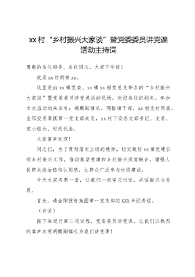 xx村乡村振兴大家谈暨党委委员讲党课活动主持词尊敬的各位领导、各位同志,大家下午好!我是xx村的黄xx。这里是由xx镇党委、xx镇xx村党总支举办的乡村振兴大家谈暨党委委员讲党课活动现场,欢迎各位的到来。参加本次活动的来宾有:胡鹏副镇长,网格镇干部,xx村支村两委,金阳投资集团第一党支部成员,xx村下设各支部书记、支委、党小组长、村民代表。大家掌声欢迎!同志们,为了贯彻落实上级的精神,切实做好xx镇党建引领乡村振兴工作,推动基层党建和乡村振兴深度融合,增强人民群众政治信仰认同感,让群众广泛参与村级建设,今天大家齐聚一堂,让我们一起学习讨论,共话振兴与发展。首先,请金阳投资集团第一党支部的XXX书记讲话。(讲话)接下来进行第二项议程,党委委员讲党课。让我们以热烈的掌声欢迎胡鹏副镇长为我们讲党课!(党课)接下来,请大家一起观看《中国共产党第十九届中央委员会第六次全体会议公报》的视频。(观看视频)下面,进行活动的第三项议程,谈心得体会。有请xx村的党员代表谈谈自己对如何当好一名微网格长、推进五个到户和乡村振兴工作的心得体会。(党员代表讲话)接下来,请金阳投资集团第一党支部党员代表谈谈自己的心得体会。(党员代表发言)下面是今天活动的最后一项议程,讨论会。大家可以以乡村振兴为主题,围绕环境卫生、交通出行、村镇建设等方面提出自己的看法,欢迎大家踊跃发言。(讨论)感谢大家的积极参与,对于大家提出的意见和建议,我们会积极的采纳。金阳投资集团第一党支部XXX书记,以( )为主题刚才胡鹏副镇长以《 》为主题,从( )、()、()个方面做了深入浅出的讲解。胡鹏副镇长讲的文可居文库——海量学习资料,手机电脑均可下载www.wenkeju.com党课主题鲜明、内涵丰富,具有很强的理论性、针对性和指导性,大家一定要认真学习领会,切实抓好落实。两位党员同志的发言,贴合实际,总结了自己的微网格工作经历,体现了作为党员的责任和担当,令人印象深刻。文可居文库——海量学习资料,手机电脑均可下载www.wenkeju.com