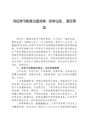 党纪学习教育主题党课:细学法规 ,重在落实同志们,根据党纪学习教育安排,今天我以细学法规,重在落实为题给大家上一次主题党课。党的十八大以来,以XXX同志为核心的党中央形成了治国理政的新理念新思想新战略,特别是新修订的《中国共产党纪律处分条例》再次释放出以严明纪律管全党治全党的鲜明信号,通过推进全面从严治党、坚持思想建党和制度治党相结合,对于全面提高党的建设科学化水平,保持党的先进性和纯洁性,顺利实现党的执政使命和奋斗目标,必将会产生重大而深远的影响,我们必须认真学习领会,落到实处。一、在学习方面抓好落实,切实学深悟透从严治党,有规可依,吃透精神,把握灵魂,这是落实条例要求的前提。治国在治党,治党贵有规。我们必须在学懂弄通上下功夫。一是要掌握标准。党的纪律是党内规矩,党规党纪严于国家法律。纪法分开,纪严于法、纪在法前,党纪已成为管党治党不可逾越的底线。马克思说过,我们现在必须绝对保持党的纪律,否则将一事无成。应坚持高标准和守底线相结合,既要注重规范惩戒,严明纪律底线,更要引导人向善向上,坚守共产党人精神追求,筑牢拒腐防变思想道德底线,以实现严肃党内政治生活,净化党内政治生态的目标。二是要通晓内容。XXXXXX在二十届中央纪委三次全会上的重要讲话,系统总结了党的十八大以来从严治党的新举措新经验新成果,既指出了病症,也开出了药方;既有治标举措,也有治本方略,是我们党坚持思想建党、制度建党的治政规律的体现。我们要通晓XXXXXX重要讲话的精髓实质。党内规矩包括党章、党的纪律、国家法律、党在长期实践中形成的优良传统和工作惯例等;党的纪律包括政治纪律、组织纪律、财经纪律、宣传纪律、群众纪律、保密纪律、人事纪律、外事纪律等。要通过学习,务必提高政治觉悟。进一步坚定马克思主义信仰和人民立场,保持党同人民的血肉联系,回答好为了谁、依靠谁、我是谁的问题,从而厚植党的执政的政治基础。三是要创新方式。应不拘一格,采取科学的学习方式,从内容、形式、载体、方法、手段等方面改进创新,坚持问题导向、目标导向学习,自觉学习、主动学习、及时学习、经常学习,学中干、干中学,在真学、真信、真用、真行促进我们正在做的工作上下功夫。在认真学习的同时,和学习其他党内法规及XXXXXX的系列讲话精神相结合,和解决自身存在的实际问题结合起来,和促进当前正在做的事情结合起来,做到全面系统领会党的基本理论、基本纲领、基本路线、基本经验、基本要求,切实增强法规治党意识和党性修养。二、要从思想方面抓落实,切实真心践行法规生命力在于执行。有规必依,不折不扣,这是落实条例的根本。XXXXXX强调,注重从思想上建党,以思想理论的先进性引领党的发展,是我们党加强自身建设的重要经验真心践行,就要使我们的党员、干部特别是高级干部懂得,思想是行动的先导,有权必有责,用权必担责,滥权必追究,监督执纪问责,永远在路上。一是要把条例作为底线标准。XXXXXX要求,让广大党员干部受警醒、明底线、知敬畏,主动在思想上划出红线、在行动上明确界限,真正敬法畏纪、遵规守矩。对照条例标准找差距,主动查找政治偏差,提高政治站位,提高自我修复能力。应注重从宏观上查找党的领导弱化、党的建设缺失、全面文可居文库——海量学习资料,手机电脑均可下载www.wenkeju.com从严治党不力、使命意识淡化的根本原因,又要从中观上分析党内政治生活庸俗化、随意化、平淡化的原因,更要从微观上查找党员忘记入党时间、迟交少交党费、不愿参加党的组织活动甚至信仰缺失、能力不足、消极腐败、以权谋私、妄议中央等忘记初心的原因。并在分析原因的基础上,拿出切实可行措施,逐条逐项逐人解决,要从思想上来一次纯洁党员思想的革命,以守住做人、处事、用权、交友的底线,真正把思想统一到XXXXXX治国理政新理念新思想新战略上来,以适应新形势新任务的要求。二是要遵循党的政治生活基本规范。XXXXXX一再强调,要坚持好党的政治路线、思想路线、组织路线、群众路线和三大优良作风。各级领导干部一定要严格遵守党的政治纪律,坚决维护党的章程和党内政治生活条例,自觉同党中央保持高度一致。要弘扬批评和自我批评的作风,使咬耳扯袖、红脸出汗批评方式成为习惯、自觉和责任。党员、干部特别是高级干部必须带头践行社会主义核心价值观,继承和发扬党的优良传统和作风,弘扬中华民族传统美德,讲修养、讲道德、讲诚信、讲廉耻,养成共产党人的高风亮节,自觉远离低级趣味。从而筑牢信仰之基,补足精神之钙,把稳思想之舵。三是要坚持抓好党性教育。教育党员不断加强党性修养,认识到党性是立身、立业、立言、立德的基石,锤炼党性修养是每个党员终身的必修课。要使党员、干部在党爱党、在党言党、在党为党,必须强化政治意识、大局意识、核心意识和看齐意识,严守党的政治纪律和规矩,做到从思想上政治上行动上
