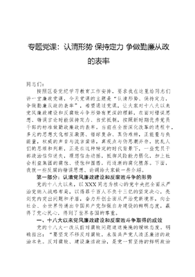 专题党课:认清形势 保持定力 争做勤廉从政的表率同志们:按照区委党纪学习教育工作安排,要求我在这里给同志们讲一堂廉政党课,今天党课的主题是认清形势、保持定力,争做勤廉从政的表率,希望通过党课,让大家对十八大以来党风廉政建设和反腐败斗争形势有更深的理解,在面对错误思想、错误言论时能保持定力、自觉抵制,按照新时期优秀党员干部的标准做勤政廉政的表率。当前在全面深化改革的进程中,多元的思想文化相互激荡、错综复杂、真伪难辨,正能量与负能量,权威的声音与流言蜚语,真观点与伪思潮并存,扰乱人们的思维和判断,正是在这种特定的时代背景下,一些党员干部政治信仰迷失,理想信念动摇,抵御风险能力弱化,加上社会利益集团的腐蚀、侵蚀和围猎,而逐渐的腐化堕落。下面,我就一些反腐的错误思想、论调给大家做一些介绍。第一部分:认清党风廉政建设和反腐败斗争的形势党的十八大以来,以XXX同志为核心的党中央把全面从严治党纳入战略布局,以得罪千百人不负十三亿的坚定决心,亮剑党内突出问题和矛盾,奋力开创全面从严治党新境界,向全社会、全世界传递出中国共产党加强自身建设的鲜明态度,赢得了党心民心,得到了世界各国的尊重。一、十八大以来党风廉政建设和反腐败斗争取得的成效党的十八大一改从前对腐败问题遮遮掩掩的暧昧态度,明确指出:要坚定不移反对腐败,永葆共产党人清正廉洁的政治本色。反对腐败、建设廉洁政治,是党一贯坚持的鲜明政治立场,是人民关注的重大政治问题。不坚决反腐败就会对党造成致命伤害,甚至亡党亡国。在这里没有对腐败问题的回避,没有对党风问题的粉饰,更没有提出什么腐败分子只是极少数,而是坦诚地指出了腐败的严重性、危害性,并旗帜鲜明地表明反腐败是党一贯坚持的鲜明政治立场,是人民关注的重大政治问题。多年的高压反腐,党风廉政建设和反腐败斗争在困难复杂的形势下不断取得新突破。从十八届中央纪委一次全会到四次全会,党中央对反腐败斗争形势的总体判断是依然严峻复杂;2015年初召开的十八届中央纪委五次全会上,党中央认为腐败和反腐败呈胶着状态;2016年十八届中央纪委六次全会上,党中央认为反腐败斗争压倒性态势正在形成;再到中纪委七次全会提出反腐败斗争压倒性态势已经形成,中纪委对反腐败态势表述的不断变化,标志着反腐败斗争取得了阶段性胜利。(一)不敢腐的目标逐步实现。2013年1月,王岐山同志首次提出坚持标本兼治,当前以治标为主,为治本赢得时间的论述。什么是治标,治标就是以惩立威,当头棒喝,让易于腐败者在带电的高压态势下不敢越雷池半步。1.零容忍惩治腐败。十八大之后,反腐败上无禁区。正国级周永康,副国级郭伯雄、令计划、苏荣、徐才厚,中央委员14人,中央候补委员15人,共计256名中管干部被立案审查。下无死角。114.3万科级以下党员干部、55.4万农村干部受党政纪处理。不以问题小而姑息。平顶山湛河区河滨街道杜庄村党支部委员、会计张宝平在开展村级慰问活动时,私吞100元慰问金,被党内严重警告;山东巨野县田桥镇政府办公室主任魏衍顺到县城了解苹果行情,食用、收受了两个苹果,均未按价付款购买,被诫勉谈话。不以违者众而放任。湖南衡阳贿选案处理467人;四川南充贿选案处理了477人;辽宁贿选案处理955人(中管干部34人);山西塌方式腐败查处违纪党员干部7367人,以致于出现县委书记都找不着人选,不得不从外文可居文库——海量学习资料,手机电脑均可下载www.wenkeju.com省市调任的情况。这些数据表明了中央对反腐败零容忍的态度,体现了不管涉及到谁,不论权力大小,都一查到底,决不姑息的反腐决心,极大地震慑了腐败分子。2.天网追逃消除幻想。XXX同志在中央纪委五次全会上强调,要加大国际追逃追赃力度,布下天罗地网,决不能让腐败分子躲进避罪天堂、逍遥法外。按照党中央的决策部署,2014年以来,我国设立中央反腐败协调小组国际追逃追赃工作办公室,先后开展天网2015天网2016等等专项行动,从70多个国家和地区追回2442人,其中国家工作人员397人,百名红通人员40人,追赃金额85.42亿元。天津市国税局直属分局原局长庞顺喜,天津港保税区瀚通国际贸易有限公司原总经理安慧民,分别因涉嫌受贿罪、行贿罪于2014年12月被天津市河西区人民检察院立案侦查,案发后潜逃至老挝。2015年3月28日下午,按照中央反腐败协调小组国际追逃追赃工作办公室的统一部署,在我外交部和驻老挝使馆大力支持下,公安部派出的联合缉捕工作组将潜逃老挝的庞顺喜、安慧民成功押解回国,取得了反腐败国际追逃追赃天网行动的首个战果。吉林省通化金马药业集团有限公司原董事长闫永明,别名刘阳,出生于中国吉林通化快大茂,因涉嫌职务侵占犯罪,被吉林省通化市公安局立案。2001年11月逃