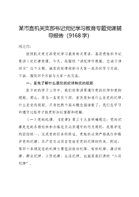 某市直机关支部书记党纪学习教育专题党课辅导报告(9168字)同志们:按照机关党支部党纪学习教育相关要求,基层党组织书记要讲1次纪律党课。今天,我围绕讲纪律守规矩、忠诚干净担当这个主题,就党的纪律规矩与大家一起共同学习交流。下面,围绕四个方面与大家一起交流。一、首先了解什么是党的纪律和党的规矩在平时的学习工作中,我们经常讲要遵守党的纪律和党的规矩。那么,作为一名党员干部,首先要知道什么是党的纪律,什么是党的规矩。只有把两个基本概念搞清楚了,我们在学习和遵守过程中才能更好加以掌握和理解。(一)党的纪律。《党章》第三十九条明确规定:党的纪律是党的各级组织和全体党员必须遵守的行为规则,是维护党的团结统一、完成党的任务的保证。党组织必须严格执行和维护党的纪律,共产党员必须自觉接受党的纪律的约束。同时,第四十条规定党的纪律主要包括政治纪律、组织纪律、廉洁纪律、群众纪律、工作纪律、生活纪律。也就是我们讲的六项纪律。(二)党的规矩。是指党的各级组织和全体党员必须遵守的行为规范和规则,是党章、纪律、法律的规范要求和党的优良传统、工作惯例等的总和。既包括成文的党内法规,如党章等党内规章制度、党的纪律和国家法律,也包括党在长期实践中形成的优良传统、工作惯例等未明文列入纪律的规矩。纪律是成文的规矩,一些未明文列入纪律的规矩是不成文的纪律;纪律是刚性的规矩,一些未明文列入纪律的规矩是自我约束的纪律。党内很多规矩是我们党在长期实践中形成的优良传统和工作惯例,经过实践检验,约定俗成、行之有效,反映了我们党对一些问题的深刻思考和科学总结,需要全党长期坚持并自觉遵循。这些规矩看着没有白纸黑字的规定,但都是一种传统、一种范式、一种要求。违反了这些优良传统和工作惯例,在政治上造成了不良影响,应当受到党纪惩处。比如:我们党的三大优良作风:理论联系实际、密切联系群众、批评与自我批评。工作惯例,比如:党委会开会要有事先议题通知,班子成员要互相交流情况,如果意见不同,要把问题摆到桌面上来,不在背后议论等。《中国共产党纪律处分条例》第七十六条规定,违反党的优良传统和工作惯例等党的规矩,在政治上造成不良影响或者文可居文库——海量学习资料,手机电脑均可下载www.wenkeju.com严重后果的,给予相应处分。本条规定是对党员、干部遵守党的政治规矩提出的纪律要求。对违反党的规矩的行为,在政治上造成不良影响的要视情节给予党纪处分。在政治上造成不良影响,主要是指损害党的政治形象,破坏党同人民群众的关系,破坏党的团结统一等。新修订的《条例》将违反党的规矩的行为危害后果修改为在政治上造成不良影响或者严重后果,进一步明确了认定此类问题的标准,体现以高标准、严要求严明党的政治纪律和政治规矩,进而带动其他纪律严起来。二、深入扎实开展党纪律学习教育开展党纪学习教育,是加强党的纪律建设、推动全面从严治党向纵深发展的重要举措。中共中央办公厅专门印发了《关于在全党开展党纪学习教育的通知》,要求今年4至7月集中时间开展党纪学习教育。我们要深入学习贯彻XXXXXX的重要讲话和重要指示精神,切实把思想和行动统一到党中央决策部署上来,不折不扣落实《通知》要求,扎实开展党纪学习教育,以实际行动坚定拥护两个确立、坚决做到两个维护。(一)要充分认识开展党纪学习教育的重大意义。首先要了解党纪学习教育的重要性:党的纪律是管党治党的戒尺,也是党员、干部约束自身行为的标准和遵循,各级党组织要把文可居文库——海量学习资料,手机电脑均可下载www.wenkeju.com严守纪律、严明规矩放到重要位置来抓,努力在全党营造守纪律、讲规矩的氛围。其次要了解党纪学习教育的必要性:每个党员干部脑子里要有个紧箍咒,这个紧箍咒就是党规党纪。党员干部学好了党规党纪,就能弄清楚自己该做什么、不该做什么,能做什么、不能做什么。再次是要了解党纪学习教育的紧迫性:很多领导干部犯错误,最后在忏悔书中都说对党章和党规党纪不了解、不熟悉,出了事重新学习后幡然醒悟,惊出一身汗。这说明平时对党纪的学习教育不够,如果我们把党章和党规党纪学好了、掌握了,又自觉遵守了,防患于未然,就可以防止一些干部今天是好干部、明天是阶下囚的现象。(二)开展党纪学习教育的方法途径。一是原原本本学习《条例》。坚持个人自学与集中学习相结合。党组采取理论学习中心组学习、举办读书班等形式,逐条学习《条例》,紧扣党的六大纪律进行研讨,推动《条例》入脑入心。党支部要采取三会一课、主题党日以学习《条例》为主题,组织全体党员认真学习,基层党组织书记讲纪律党课。二是坚持党性党风党纪一起抓。党性、党风、党纪是有机整体,党性是根本,党风是表现,党纪是保障,要把党章和党规党纪学习教育作为党性教育的重要内容。(党性教育是通过特定的