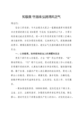 知敬畏 守底线 弘扬清风正气同志们:结合工作安排,今天由我为大家上一堂廉政教育专题党课本次党课的题目是《知敬畏 守底线 弘扬清风正气》。主要目的是通过此次党课形式,进一步引导改革发展干部职工正确认清当前形势,自觉加强党性锻炼,弘扬清风正气,提高廉政勤政意识,增强拒腐防变能力,建设正气充盈的廉洁改革发展委员会。一、心存敬畏,始终保持政治上的清醒和坚定党员干部只有心存敬畏,才会思而出乎理智、做而有所顾忌、行而不忘法纪。要对改革发展工作心存敬畏,自觉遵守党的纪律,认真执行廉洁自律各项规定,慎独慎初慎微,勤于自省,永葆共产党人清正廉洁的政治本色。要对人民群众心存敬畏,紧贴民心,尊重民意,集中民智,力解民忧,把维护群众根本利益放在首位,立足岗位,扎实工作,为民服务。一要加强党性修养。XXXXXX强调,党性是党员干部立身、立业、立言、立德的基石。加强党性修养首在净化灵魂,重在修心,新时代党员干部要永葆共产党人的初心、对党的忠诚心、对人民的感恩心、对事业的进取心、对法纪的敬畏心,筑牢使命担当,自觉做新时代中国特色社会主义的坚定信仰者和忠实践行者。二要坚定理想信念。党员干部只有理想信念坚定,才能在政治上经得起风浪考验。坚定的理想信念不会自发形成,而是基于对科学理论的系统认知与深入理解。要持之以恒把学习贯彻XXX新时代中国特色社会主义思想、XXXXXX关于改革发展领域工作重要指示批示精神、中央和省(市县)关于党风廉政建设决策部署等作为首要政治任务,在学懂弄通的基础上,增强政治认同、思想认同、理论认同、情感认同,不断提升运用党的创新理论武装头脑、破解难题、指导实践的能力。要从强化日常廉政教育入手,做到早教育早提醒早预防,严格贯彻落实中央八项规定精神,时刻绷紧廉洁自律这根弦。三要牢记初心使命。XXXXXX指出,中国共产党人的初心和使命,就是为中国人民谋幸福,为中华民族谋复兴。历史充分证明,同人民风雨同舟、血脉相通、生死与共,是我们党战胜一切困难和风险的根本保证。离开了人民,我们就会一事无成。不忘初心,方得始终。党员干部要把人民放在心中最高位置,虚心向群众学习,真心对群众负责,热心为群众服务,诚心接受群众监督;想问题、作决策、办事情都要想一想是不是站在文可居文库——海量学习资料,手机电脑均可下载www.wenkeju.com人民的立场上,是不是有助于解决群众的难题,是不是有利于增进人民福祉,通过落实落细每项改革发展职责,践行为民服务的初心使命。二、坚守底线,切实筑牢思想政治根基做人、做事有底线,是党员干部的立身之本,是每一位改革发展党员干部做人从政的生命线、防火墙,全体党员干部要时时警醒、事事谨记,时刻拧紧思想阀门。一要坚守党性基线。改革发展工作事关民生福祉,直面最基层百姓,作为改革发展干部办事要视法纪如带电的高压线,绝不越雷池一步。在任何时候、任何情况下都与组织保持高度一致,多为组织着想,多替组织分忧。敬畏群众,真正做到对人民负责、受人民监督、让人民满意,当好人民的公仆。二要坚守法纪红线。改革发展工作涉及的法律和条例较多每名改革发展干部都要具备强烈的法纪意识,始终把法律、规章、制度作为行动的纲要,坚决执行改革发展等改革发展工作政策法规,把依法行政作为基本理念和行动准则落实到工作的每一个环节中去。严防雁过拨毛式腐败问题,坚决杜绝违纪违规行为,特别是改革发展等关键环节。要始终牢记廉洁从政,时刻以为政之德激励自己、以贪欲之害告诫自己、以律已之心约束自己,决不利用手中的权力谋取个人私利、优亲厚友。文可居文库——海量学习资料,手机电脑均可下载www.wenkeju.com要自觉接受组织、群众、舆论和社会监督,凡涉及社会广泛关注的问题,都能做到公平、公正、公开,让阳光渗透到改革发展工作的每一个环节。要坚持依法用权、以德用权,在制度笼子里办事情,遵守办事规程、行为准则。看淡名利,经常算算人生几本账,正确考量得与失,避免沦为权力与名利的奴隶。三要坚守警示防线。不断反躬自省,做到自警、自省、自重、自律。要谨慎独处。要明白哪些能做、哪些不能做,什么必须坚持、什么必须反对。要谨小慎微。严格要求自己,以先进典型鞭策自己,以反面教材警示自己,防微杜渐,注重点滴。要谨慎交友,不能随便交友、滥交友;要经常过滤、净化自己的社交圈、生活圈和朋友圈,善交益友,乐交诤友,不交损友。四要坚守廉洁底线。严以律已,关键是落实到工作生活点滴中去,做到言行一致。要笃行。要时时处处律己,一辈子律己,坚决管好自己的头、手、足。要敢拒。主动拒绝一些歪风邪气,在大是大非面前旗帜鲜明,在风浪面前无所畏惧,在诱惑面前立场坚定,做到一身正气。要善行。要有抓铁之手、踏石之足,多谋事、多干事,办实事、办好事。文可居文库——海量