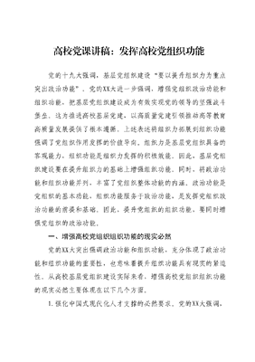 高校党课讲稿:发挥高校党组织功能党的十九大强调,基层党组织建设要以提升组织力为重点突出政治功能。党的XX大进一步强调,增强党组织政治功能和组织功能,把基层党组织建设成为有效实现党的领导的坚强战斗堡垒。这为推进高校基层党建,以高质量党建引领推动高等教育高质量发展提供了根本遵循。上述表述将组织力拓展到组织功能强调了党组织作用发挥的价值导向。组织力是基层党组织具备的客观能力,组织功能是组织力发挥的积极效能。因此,基层党组织建设要在提升组织力的基础上增强组织功能。同时,将政治功能和组织功能并列,丰富了党组织整体功能的内涵。政治功能是党组织的基本功能,组织功能服务于政治功能,是发挥党组织政治功能的前提和基础。因此,提升党组织的组织功能,要同时增强党组织的政治功能。一、增强高校党组织组织功能的现实必然党的XX大突出强调政治功能和组织功能,充分体现了政治功能和组织功能的重要性,也意味着提升组织功能具有现实的紧迫性。从高校基层党组织建设实际来看,增强高校党组织组织功能的现实必然主要体现在以下几个方面。1.强化中国式现代化人才支撑的必然要求。党的XX大强调,以中国式现代化全面推进中华民族伟大复兴。同时强调,教育、科技、人才是全面建设社会主义现代化国家的基础性、战略性支撑。培养造就大批德才兼备的高素质人才,是国家和民族长远发展大计。XXXXXX指出,世界科技强国必须能够在全球范围内吸引人才、留住人才、用好人才。我国要实现高水平科技自立自强归根结底要靠高水平创新人才,要更加重视人才自主培养,更加重视科学精神、创新能力、批判性思维的培养培育。中国式现代化离不开高等教育的重要支撑,这对高校党组织履行党管人才职责提出了新的要求。必须充分发挥高校党组织的组织功能积极营造有利于人才成长的良好环境,为建设一支规模宏大、结构合理、素质优良的人才队伍提供保障。2.促进高等教育高质量发展的必然要求。全面建设社会主义现代化强国,前提是建成教育强国。高等教育发展水平是教育强国的重要体现。经过改革开放以来的持续努力,中国高等教育已经由数量扩张阶段发展为内涵式提升阶段,也就是高质量发展阶段。实现高等教育高质量发展,要加强基础学科、新兴学科、交叉学科建设,加快建设中国特色、世界一流的大学和优势学科。这对高校党组织领导改革发展,深入推进一融双高提出了新要求。高校要加强基层党组织建设,充分发挥党的政治优势和组织优势,强化党建引领,加强师德师风建设,通过有组织的教学科研,引导广大教师铸师魂、提师能,着力解决关键技术卡脖子问题,把论文写在中国大地上,推动高等教育高质量发展。3.落实立德树人根本任务的必然要求。XXXXXX指出:从历史和现实的角度看,任何国家、任何社会,其维护政治统治、维系社会稳定的基本途径无一不是通过教育。我国是中国共产党领导的社会主义国家,这就决定了我们的教育必须把培养社会主义建设者和接班人作为根本任务,培养一代又一代拥护中国共产党领导和我国社会主义制度、立志为中国特色社会主义奋斗终身的有用人才。这就需要高校党组织以立德树人成效作为检验党建工作成效的根本标准,充分发挥组织功能,加强师生思想政治工作,坚持马克思主义在意识形态领域的指导地位,践行社会主义核心价值观,开展严肃认真的党内政治生活,把高校建设成为坚持党的领导的坚强阵地。4.提升基层党建质量的必然要求。党的十九大和党的XX大,都对不断提高党的建设质量作出重要论述。组织功能是衡量党建质量的重要标准。XXXXXX指出:基层党组织组织能力强不强,抓重大任务落实是试金石,也是磨刀石。党中央制定了一系列重大战略、部署了一系列重大工作,基层党组织就要在贯彻落实中发挥领导作用。提升基层党建质量,把党员组织起来,把师生群众凝聚起来,全面贯彻落实中央决策部署和上级党组织工作要求,就要从根本上增强基层党组织组织功能。这也是党的XX大提出增强基层党组织组织功能的现实要求。二、组织功能的提出与高校党组织组织功能的深刻内涵1.组织功能的提出。2014年1月,XXXXXX指出,党的领导体现在党的严密组织体系和强大组织能力上。他把党的领导与组织体系和组织能力联系在一起,突出组织功能要服务于党的领导2016年2月,XXXXXX在审议两学一做学习教育方案时强调,要激活基层党组织,增强基层组织力真正使党的组织生活党员教育管理严起来、实起来。这里突出党的组织生活和党员教育管理,侧重于内部组织功能。2017年10月,XXXXXX在党的十九大报告中强调,要以提升组织力为重点,突出政治功能加强基层组织建设。2018年1月,XXXXXX把政治功能与组织功能并列提出,强调要积极适应形势发展变化、党员结构深刻变化,强化党组织的政治功能和组织功能,在严肃的党内生活中锤打,提高适应新时代新要求的新本领新能力。从这