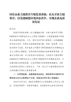 国有企业主题教育专题党课讲稿:扎实开展主题教育,以党建赋能深化国企改革,实现企业高质量发展同志们:根据市国资系统第二批主题教育安排,为深入推动学习贯彻XXX新时代中国特色社会主义思想主题教育,以高质量党建引领国有企业高质量发展,今天,我以扎实开展主题教育,以党建赋能深化国企改革,实现企业高质量发展为题,讲授一堂党课,与大家共同学习交流。在全党深入开展学习贯彻XXX新时代中国特色社会主义思想主题教育,是贯彻落实党的XX大精神的重要举措,是事关全局的大事。对于国资国企系统来说,必须把学习宣传贯彻XXX新时代中国特色社会主义思想主题教育作为首要政治任务,以此推动国企高质量发展,尤其是要着力创新体制机制建设,为深化国资国企改革注入强劲动力。下面,我从3个方面简要谈谈如何以党的建设引领企业高质量发展。一、从思想层面,全面提高政治站位,围绕贯彻XXX新时代中国特色社会主义思想这个主线,在政治方向引领上深度融入2016年10月10日,XXX在全国国有企业党的建设工作会议上指出,坚持党的领导、加强党的建设,是我国国有企业的光荣传统是国有企业的根和魂,是我国国有企业的独特优势。2018年9月27日,XXX在中国石油辽阳石化公司考察时强调,坚持党对国有企业的领导,必须一以贯之;国有企业建立现代企业制度,也必须一以贯之。改革开放45年来,我们党引领国有企业脱胎换骨、浴火重生,走上了社会主义市场经济发展道路、开启了建设中国特色现代国有企业制度伟大征程,取得举世瞩目的历史性成就。回顾我们党引领国有企业改革发展波澜壮阔的光辉历程眺望具有全球竞争力世界一流企业的宏伟目标,我们更加深刻感到,坚持党的领导、加强党的建设是国有企业改革发展的根本所在命脉所系,是新时代搞好国有企业、发展壮大国有经济的根本保证。第一,坚持党的领导,加强党的建设,是国有企业的根和魂,是国有企业的独特优势。一是国有企业做到两个维护更加坚定。坚持把党的政治建设作为根本性建设,深刻领会两个确立的决定性意义,坚持第一议题制度,建立督办落实工作机制,构建传达学习、研究部署、贯彻落实、跟踪督办报告反馈的工作闭环,确保党中央和XXXXXX决策部署到哪里,国有资产就贯彻落实到哪里。二是党对国有企业的全面领导更加有力。全面落实两个一以贯之,加快建设中国特色现代企业制度,在完善公司治理中加强党的领导,全面落实党建入章、一肩挑、前置清单等制度,确保党的领导在制度上有规定、程序上有保证、实践中有落实。坚持党管干部、党管人才原则,建设了一支忠诚、干净、担当的高素质专业化干部人才队伍三是党建基层基础更加稳固。坚持建强国有企业基层党组织不放松,坚持党建工作和业务工作同谋划、同部署、同落实、同考核积极推进基层党建标准化规范化建设。四是管党治党责任更加强化。建立实施中央企业党委(党组)向国资委党委报告年度党建工作、党委(党组)书记向国资委党委现场述职、基层党组织书记抓党建述职评议考核三项制度,制定中央企业党建工作责任制实施办法,不断完善党建考核评价体系,层层压实企业党建责任五是企业政治生态更加优化。持续加强企业党风廉政建设和反腐败斗争,驰而不息整治四风,坚持不懈严查快处违反中央八项规定精神问题,切实加大国企反腐力度,一体推进不敢腐、不能腐、不想腐,风清气正的良好政治生态加快形成。第二,加强党对国有企业全面领导必须深刻把握实质内涵。旗帜鲜明讲政治是推动国有企业改革发展的基本前提。长期以来国有企业坚持听党话、跟党走。近年来,建立完善了第一议题等制度机制,在学习贯彻落实党中央决策部署和XXXXXX关于本行业本单位的重要指示批示精神上迈出了坚实步伐。这是党的领导坚强有力的具体体现。更加突出政治引领,进一步增强旗帜鲜明讲政治的政治自觉、思想自觉和行动自觉;要在保落实上做好文章,不断完善党中央决策部署贯彻落实体系,在政治思想、体制机制、行权监督等方面共同发力,确保中央政令在企业畅通、决策落地生根。提高把方向的准度、精度,准确把握新时代新征程国有企业的定位、方位、地位,进一步增进国有企业当好两个基础的责任感、使命感、认同感,推动企业坚定成为党领导经济工作的重要力量,成为坚持和完善社会主义基本经济制度的重要根基,成为立足新发展阶段、贯彻新发展理念、构建新发展格局、推动高质量发展的重要支撑。瞄准高质量发展目标,推动党的领导与企业经营管理各方面、各环节深度融合,进一步强化党委对企业经营生产各项重大决策、重点任务的把关定向,把能否推动企业高质量发展,作为检验各级党委领导能力强不强的最重要内容,切实管好企业高质量发展的大局。更加突出全面从严治党政治责任,进一步完善监督体系,用好党建考核指挥棒,推动全面从严治党要求落实到每一个支部、每一名党员;积极探索创新党建工作融入生产经营中
