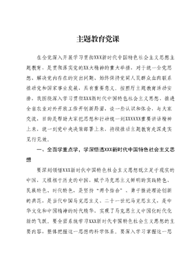 主题教育党课在全党深入开展学习贯彻XXX新时代中国特色社会主义思想主题教育,是贯彻落实党的XX大精神的重大举措,对于统一全党思想、解决党内存在的突出问题、始终保持党同人民群众血肉联系推动党和国家事业发展,具有重要意义。按照厅主题教育活动安排,我围绕深入学习贯彻XXX新时代中国特色社会主义思想、推进全省农业对外开放工作开创新局面,谈一些认识和体会,与大家交流,目的是帮助大家把思想和行动统一到XXXXXX重要讲话精神上来,统一到党中央决策部署上来,持续推动主题教育走深走实见行见效。一、全面学重点学,学深悟透XXX新时代中国特色社会主义思想要深刻领悟XXX新时代中国特色社会主义思想既立足于现实的中国,又植根于历史的中国,赋予马克思主义鲜明的实践特色、民族特色、时代特色,是坚持两个结合、勇于推进理论创新的典范,是当代中国马克思主义、二十一世纪马克思主义,是中华文化和中国精神的时代精华,实现了马克思主义中国化时代化新的飞跃。要全面系统学习XXX新时代中国特色社会主义思想的主要内容,整体把握这一思想的科学体系。要深入学习掌握这一思想关于不忘初心、牢记使命,胸怀国之大者,提高政治判断力、政治领悟力、政治执行力,三严三实,忠诚干净担当,为民务实清廉等一系列要求。党员干部特别是领导干部要准确把握包括六个必须坚持在内的XXX新时代中国特色社会主义思想的立场观点方法,把精髓要义领会透。既要读原文、悟原理,又要系统学、跟进学。当然,深入开展学习XXX新时代中国特色社会主义思想,既要全面学习又要重点领会,结合处和中心的职能要重点从以下三个方面学习领会。(一)深入学习XXXXXX关于三农工作重要论述。XXXXXX关于三农工作的重要论述,是XXX新时代中国特色社会主义思想的重要组成部分,也是我们做好三农工作的根本遵循。XXXXXX深刻指出农业保的是生命安全、生存安全,是极端重要的国家安全等一系列重大论断,向全党全社会表明了党中央加强三农工作的鲜明态度,发出了重农强农的强烈信号。我们要全面学习领会、深入贯彻落实XXXXXX关于三农工作重要论述,充分认识做好三农工作对满足人民美好生活需要、实现高质量发展、夯实国家安全基础的极端重要性。(二)深入学习XXXXXX视察河北重要讲话精神。5月10日到12日,XXXXXX先后到雄安新区、沧州市、石家庄市等地调研,对河北提出了五个新的希望,在推进创新驱动发展中闯出新路子;在推进京津冀协同发展和高标准高质量建设雄安新区中彰显新担当;在推进全面绿色转型中实现新突破;在推进深化改革开放中培育新优势;在推进共同富裕中展现新作为。XXXXXX的重要讲话和重要指示,思想深邃,视野宏阔、内涵丰富,具有很强的政治性、思想性、战略性和指导性。我们要牢记XXX的嘱托,在谱写中国式现代化建设河北篇章中体现责任担当。(三)深入学习XXXXXX关于对外开放的重要论述。新时代十年,我国开放事业取得的历史性成就、发生的历史性变革,是在XXX新时代中国特色社会主义思想特别是在XXXXXX关于对外开放的重要论述指引下实现的,充分彰显了党的创新理论的思想伟力和实践伟力。党的XX大报告指出,我们实行更加积极主动的开放战略,构建面向全球的高标准自由贸易区网络,加快推进自由贸易试验区、海南自由贸易港建设,共建一带一路成为深受欢迎的国际公共产品和国际合作平台。我国成为一百四十多个国家和地区的主要贸易伙伴,货物贸易总额居世界第一,吸引外资和对外投资居世界前列,形成更大范围、更宽领域、更深层次对外开放格局。我们要坚持用XXX关于对外开放的重要思想指导全省农业对外工作。二、注重结合融合,推动农业对外开放重点工作走深走实在开展主题教育过程中,要把理论武装工作落实到位,以实践成就促进主题教育扎实开展。要以XXX新时代中国特色社会主义思想为指导,全面贯彻落实党的XX大精神,立足新发展阶段、贯彻新发展理念,深入实施开放带动战略,紧紧围绕服务国家总体外交大局和农业农村事业发展,统筹利用两个市场、两种资源,全面实施农业引进来、走出去,主动融入一带一路建设,积极促进农业对外贸易,持续推动农业国际合作,进一步加强农业国际交流,努力提升全省农业对外开放水平。下面我简要提几点要求:(一)实施贸易促进六大工程。一是实施出口基地提档升级工程。围绕精品蔬菜、道地中药材等优势特色产业,建设一批产业集聚度高、生产标准高、出口附加值高、品牌认可度高、综合服务水平高的农业国际贸易高质量发展基地、先行区。二是实施农业国际服务贸易培育工程。吸引社会资本向农业国际服务贸易流动,壮大农业国际服务贸易主体,打造一批农业国际服务贸易发展基地。三是实施出口型农业企业壮大工程。实施农产品出口企业破零倍增计划,加大对重点出口企业支持力度,帮助