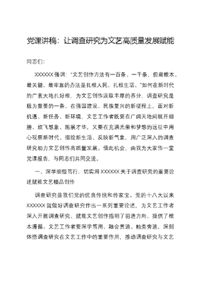党课讲稿:让调查研究为文艺高质量发展赋能同志们:XXXXXX强调:文艺创作方法有一百条、一千条,但最根本、最关键、最牢靠的办法是扎根人民、扎根生活。如何在新时代的广袤大地扎好根,为文艺创作汲取丰厚的养分,调查研究是极为重要的一条。在强国建设、民族复兴的新征程上,面对新机遇、新任务、新环境,文艺工作者既要在广阔天地间展开翅膀、放飞想象、施展才华,又要在充满光荣和梦想的远征中用心观察新时代、描绘新生活、反映新气象,用广泛深入的调查研究助力文艺创作高质量发展。借此机会,由我为大家作一堂党课报告,与同志们共同交流。一、深学细悟笃行,切实用XXXXXX关于调查研究的重要论述赋能文艺精品创作调查研究是我们党的优良传统和传家宝。党的十八大以来XXXXXX就做好调查研究作出一系列重要论述,为文艺工作者深入开展调查研究、赋能文艺创作指明了前进方向、提供了根本遵循。文艺工作者要深学笃用、融会贯通、触类旁通,深刻体悟调查研究在文艺工作中的重要作用,推动调查研究与文艺创作有机结合、相互促进。1.深刻领悟调查研究在文化文艺事业中的重要作用。XXXXXX强调:调查研究是我们做好工作的基本功。实现强国建设、民族复兴的宏伟蓝图,既需要强大的物质力量,也需要强大的精神力量,其中文化文艺的作用举足轻重、不可替代。党的XX大报告对推进文化自信自强、铸就社会主义文化新辉煌作出了全面部署,广大文艺工作者要经常、广泛、深入地开展调查研究,在与基层单位、人民群众的交往中,切实掌握真实情况、获取一手材料、倾听民情民意,在推动党的XX大各项决策部署具体化、实践化上出实招、求实效。2.深刻领悟从群众中来、到群众中去在文艺创作中的重要作用。XXXXXX强调:广大文艺工作者只有深入人民群众、了解人民的辛勤劳动、感知人民的喜怒哀乐,才能洞悉生活本质,才能把握时代脉动,才能领悟人民心声,才能使文艺创作具有深沉的力量和隽永的魅力。文艺来源于生活,人民是文艺的真正创造者。文艺作品能否深入人民的精神世界,能否触及灵魂、引发人民的思想共鸣,要看创作者是否走进了群众中间、融入了人民生活、反映了人民期盼。做好文艺工作,要始终坚持以人民为中心,把人民摆在心中最高位置,从群众中来、到群众中去,不断深入群众、深入生活,诚心诚意做人民的小学生,履行好为人民服务的天职。3.深刻领悟坚持问题导向在文艺创作中的重要作用。XXXXXX强调,调查研究既要身入基层,更要心到基层,听真话、察真情,真研究问题、研究真问题。坚持问题导向是做好工作的重要方法论。通过调查研究,把事情的真相和全貌调查清楚,把问题的本质和规律把握准确,把解决问题的思路和对策研究透彻,才能推动各项事业不断前进。问题是时代的声音,也是推动文艺工作高质量发展的有力抓手。做好文艺工作,要强化问题意识,坚持问题导向,敢于直面现实问题,善于发现文艺创作中的难题,奔着问题去、跟着问题走,在不断解决问题、化解矛盾的过程中推动文艺创作发展。4.深刻领悟加强成果转化在文艺创作中的重要作用。XXXXXX强调,衡量调查研究搞得好不好,关键要看调查研究的实效,看调研成果的运用。调研成果转化运用是检验调查研究成效的硬标准。对文艺创作来说,文艺创作的过程就是一个将调查研究成果进行创新性综合、加工、转化的过程。文艺工作者要用心把时代价值、精神标识从鲜活的素材中提炼出来,用激荡人心的精品力作展示出来,从而更好弘扬中国精神、凝聚中国力量。二、提升能力本领,在调查研究中不断增强脚力眼力脑力笔力XXXXXX强调:关在象牙塔里不会有持久的文艺灵感和创作激情。文艺工作者要牢牢抓住学习贯彻XXX新时代中国特色社会主义思想主题教育契机,强化思想武装,大兴调查研究之风,在扎根人民、深入生活中锤炼做好文艺工作的过硬本领。1.增强脚力,探寻文艺创作的源头活水。增强脚力是基础性工作,也是文艺工作者在社会实践中获取源源不断的丰富素材的重要方法。文艺工作者要在调查研究中走进基层、走近群众,练就好脚力。一是站稳人民立场。要牢固树立以人民为中心的工作导向,把人民立场作为根本立场,在深入基层、深入生活、深入群众的具体实践中,不断强化宗旨意识,厚植为民情怀,把自己的双脚深深扎根于基层一线和人民群众丰富多彩的现实生活。二是深入践行群众路线。文艺工作者不仅要走好网上群众路线,在网络上观察生活、获取素材、宣传群众、引导群众,还要主动走出去走下去,走到基层和群众身边去。坚持把群众观点、群众路线深深植根于思想中、具体落实到行动上,从线上的旁观者转变为线下的参与者,迈开双脚、沉下心来,用脚步丈量大地、用足迹贴近实践、用真情感受生活。三是善于反映生动实践。文艺工作者锻炼的脚力是接地气的脚力。新时代以来,党的理论创新和实践创新是十分生动的,文艺创作也必须是生动的、有活力的,是扎根中国大