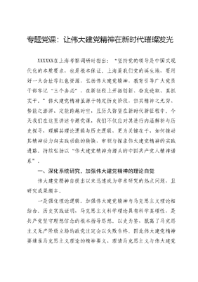 专题党课:让伟大建党精神在新时代璀璨发光XXXXXX在上海考察调研时指出:坚持党的领导是中国式现代化的本质要求,也是根本保证。上海是我们党的诞生地,要用好一大会址等红色资源,弘扬伟大建党精神,教育引导广大党员干部牢记三个务必,在新征程上开拓创新、奋发进取、真抓实干。伟大建党精神虽源于特定历史阶段,但其精神之无穷、势能之澎湃、定能跨越时空,且历久弥坚在新时代新征程中。今天我们在这里讲述专题党课,我们不仅应对其进行内涵解析与历史探寻,理解其理论逻辑与历史逻辑,更为关键在于,如何推动其精神动力向实践动能的转换,审视与探求伟大建党精神的实践进路。持续弘扬以伟大建党精神为源头的中国共产党人精神谱系。一、深化系统研究,加强伟大建党精神的理论自觉伟大建党精神自提出以来迅速成为学术研究的热点问题,且研究成果颇丰。一是强化理论逻辑。加强伟大建党精神与马克思主义理论相结合。历史实践证明,马克思主义科学理论具有科学真理性,是共产党坚守理想信念的根本指导思想。以史为鉴,脱离了马克思主义无产阶级立场的政党注定会以失败告终。因此伟大建党精神要继承马克思主义理论的精神要义,理清马克思主义与伟大建党精神中国特色社会主义及中国式现代化建设之关系,一切从实际出发,同时发挥好马克思主义的理论指导实践的伟大力量,推进马克思主义理论研究的中国化时代化新境界。二是深化历史逻辑,不断丰富和发展伟大建党精神。以大历史观理清共产党建立、中华人民共和国成立、社会主义制度确立以及改革开放的必然性与必要性。伟大建党精神在革命中淬炼在建设与改革中不断被检验与丰富,并在中国特色社会主义新时代得到升华,正确把握伟大建党精神贯通历史的传承结构,在总结伟大建党精神的历史经验中不断做好寻根筑基工作,从而不断增强伟大建党精神的历史自信与文化自信。三是创新发展逻辑,厘清伟大建党精神与共产党人精神谱系的辩证关系。一方面,伟大建党精神具有根源性,相较于共产党人的精神谱系,更具有本体论意义,是精神谱系之源;另一方面伟大建党精神亦具有时代性,它是从中国发展的现实逻辑中生成的,或者可以说,是在回答时代性课题中生成与凝练的在具体的历史阶段。伟大建党精神会衍生、延展出多维度、具体化的精神形态。这些具体的精神形态共同谱写与日渐丰富着党的精神谱系。根据新征程的时代课题,要加强对伟大建党精神的时代性延展研究,在新的历史方位下继续丰富与创新中国共产党人的精神谱系。二、提升弘扬践行伟大建党精神的思想自觉可以说。伟大建党精神作为中国共产党的精神之源与精神红线,突破了时空之限,连接了共产论学习与理论教育,分众化、差异化地进行学习教育,不断加强党员群众以及广大学生群体对马克思主义以及中国化时代化的马克思主义的理论认司,深化对伟大建党精神的思想认同,使马克思主义真理更加深入人心。一是将伟大建党精神融入高质量发展当中之中。首先,以学校作为核心场域,以学生作为关键主体,以知识传授课程为主要平台。伟大建党精神作为党的最新理论成果。蕴含着丰富的理论内涵与鲜明的政治品格,通过加强马克思主义基本原理教育及党史、国史社会主义发展史等理论课程的学习,不断满足学生的理论需要,引发思想共鸣,增强主体认同。引领在理解与掌握伟大建党精神的过程中不断树立正确的人生观与价值观进一步增强伟大建党精神的理论性与思想性。其次,创新思想教育方式方法,杜绝填鸭式与一刀切式教学方式,增强教师与学生之间的双向互动。利用好革命遗址遗迹、纪念馆、博物馆等红色资源实现实地观摩与实践活动相结合积极开展纪念日主题教育活动、团日主题活动理论宣讲活动、志愿服务活动等,增强教学质效,进一步增强伟大建党精神的实践性。最后,持续进行思想教育平台创新,不断扩大与创新弘扬伟大建党精神的平台。随着科学技术的飞速发展,互联网已成为信息传播的主要途径。因此,在互联网领域开展思想教育具有时代必要性。利用好数字媒体、网络平台的先进技术,实现传统教学与现代教学相结合。充分发挥网络新媒体的宣传教育作用,依托学习强国、青年大学习、哗哩哗哩、微博抖音等各大网络渠道精准推送,不断实现伟大建党精神的润物细无声,进一步强化思想教育的针对性。二是将伟大建党精神融入社会主义核心价值观弘扬之中。伟大建党精神与社会主义核心价值观具有同宗同源的逻辑关联,二者均源于马克思主义之基与中华民族优秀传统文化之根,致力于满足人民群众美好生活需要、实现伟大复兴的中国梦与人的自由全面发展的理想目标。一方面,伟大建党精神作为党的精神谱系之源,要以伟大建党精神为引领,用好红色资源,康续精神力量开展社会主义核心价值观教育,推动国家、社会与人民价值目标的协调发展,不断培养出担当民族复兴大任的时代新人另一方面,社会主义核心价值观表征着全体人民共同价值观的最大公约数,具有明确方向、凝心聚力、启智润心的强大作用