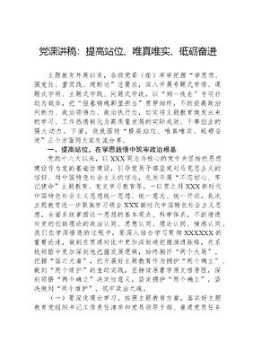 党课讲稿:提高站位、唯真唯实、砥砺奋进主题教育开展以来,各级党委(组)牢牢把握学思想、强党性、重实践、建新功总要求,深入开展专题式学悟、课题式学研、主题式学践、问题式学改,以到一线去专项行动为载体,把强基铸魂彰显担当贯穿始终,不断提高政治判断力、政治领悟力、政治执行力,切实将主题教育焕发出来的学习、工作热情转化为高质量发展的实际成效、干事创业的强大动力。下面,我就围绕提高站位、唯真唯实、砥砺奋进三个方面同大家交流分享。一、提高站位,在学思践悟中筑牢政治根基党的十八大以来,以XXX同志为核心的党中央坚持把思想建设作为党的基础性建设,引导党员干部坚定对马克思主义的信仰、对中国特色社会主义的信念,先后开展不忘初心、牢记使命主题教育、党史学习教育等,一以贯之用XXX新时代中国特色社会主义思想统一思想、统一意志、统一行动。此次主题教育进一步聚焦学习领会XXX新时代中国特色社会主义思想,全面系统掌握这一思想的基本观点、科学体系,不断增进对党的创新理论的政治认同、思想认同、理论认同、情感认同。我们在学深悟透的过程中,要深入结合学习贯彻XXXXXX的重要论述,做到在贯通对比中更加深刻地把握演进脉络,在系统领悟中更加深刻地把握发展逻辑,始终胸怀两个大局、把握国之大者,把开展好主题教育作为拥护两个确立、做到两个维护的生动实践,坚持读原著学原文悟原理,深刻领悟两个确立决定性意义,坚定拥护两个确立,坚决做到两个维护,筑牢政治之魂。(一)要深化理论学习。按照主题教育方案,落实好主题教育党组织书记工作责任清单和党员领导干部、普通党员任务清单,压紧压实责任。突出重点,强化学思践悟。坚持以XXX新时代中国特色社会主义思想为根本遵循,利用三会一课、主题党日+等载体,举办专题读书班、专题党课,通过交流研讨、宣传阐释等方式,认真研读指定书目,以持续不断、入脑入心的理论淬炼和政治锤炼,不断提高认识问题的高度、分析问题的深度、把握问题的准度,努力增强破解改革发展难题的能力和本领。(二)要强化督导检查。各级党委(组)要把开展主题教育同贯彻落实党中央及党的XX大决策部署结合起来,同推动本单位的中心工作结合起来,将主题教育纳入巡察内容,作为领导班子和领导干部年度考核、党委(组)书记抓基层党建述职评议考核重要内容,加强工作统筹衔接、协调推进,强化过程性评价与总结性评估,系统反映主题教育进展成效。(三)要注重有机融合。各级党委(组)要以高度自觉接受主题教育锻造洗礼,推动主题教育同业务工作深度融合,不断提高政治判断力、政治领悟力、政治执行力,自觉从伟大思想中寻找破解发展难题的金钥匙,作为推动事业发展的最高政治原则和根本政治责任,确保各级党委(组)和广大党员干部坚定沿着XXXXXX指引的方向奋勇前进。二、唯真唯实,在学思践悟中厚植党性修养XXX新时代中国特色社会主义思想不仅包含着党治国理政的重要思想,也贯穿着中国共产党人的政治品格、价值追求、精神境界、作风操守的要求。开展这次主题教育,就是自觉用XXX新时代中国特色社会主义思想改造主客观世界,更好教育引导广大党员干部自觉用党的光荣传统和优良作风坚定信念、凝聚力量,通过主题教育,更加注重对标对表查不足、找差距、明方向,多倾听群众诉求与愿望,多干群众期盼关切的实事好事,真正从学习贯彻XXX新时代中国特色社会主义思想中厚植为民服务的信念宗旨、汲取真抓实干的精神力量。(一)要切实站稳人民立场。作为党员干部,必须始终坚持人民至上、以人民满意为标准,将其作为谋划和推进落实一切工作的出发点和落脚点。要真正从学习贯彻XXX新时代中国特色社会主义思想中厚植为民服务的信念宗旨、汲取真抓实干的精神力量,严格落实关于大兴调查研究的工作要求,扑下身子、沉到一线,掌握真实情况和民情民意,在调查研究中加深对党的创新理论的理解,运用党的创新理论研究新情况、解决新问题。(二)要切实为民排忧解难。作为党员干部,要坚持问题导向,对照党中央关于大兴调查研究方案中明确的12个方面,立足工作岗位和工作职责,找准切入点、发力点,有针对性地研究确定调研课题,把本行业、本部门工作融入新发展格局。落实三进三解工作要求,采取问卷调查、实地察看、座谈会、随机走访、个别交流等方式,深入到困难多、群众意见集中、工作打不开局面的地方体察实情、解剖麻雀,全面掌握第一手情况,敢啃硬骨头,敢去涉险滩,用心用力办好为民实事,不断提升职工群众的获得感、幸福感。(三)要切实注重成果转化。作为党员干部,要对群众普遍关切的问题及时解疑释惑、回应诉求,打通基层党组织联系服务群众最后一公里,针对调研中群众反映强烈的突出问题,采取台账式管理、项目化推进的方式进行集中整治,做好调研成果转化的后半篇文章,同时,建立调研成果转化运用清单,真正把调研成果转
