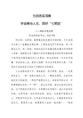 为民务实清廉学会善待人生,算好七笔账——廉政专题党课司法局党组书记、局长XXX同志们,大家好,按照廉洁机关建设计划安排,今天由我为大家上一堂廉政专题党课,主要是通过学习和交流,进一步深化认识,统一思想。考虑到结合目前廉洁机关建设活动的深入开展,同时使大家了解我们党党风廉政建设的历程和新形势下做好党风廉政建设的几点要求。因此我选择为民务实清廉,学会善待人生,算好七笔账作为这节党课的主题。下面我和大家谈谈自己对这个问题的认识和体会。人生道路坎坷不平,艰难曲折,很不容易。因此,一定要善待自己。善有两方面的认识,一种是无原则,无条件的满足自己的欲望;一种是严格要求自己,有制有节的生活。任何事物都应该有一个度,超过这个度,就会走向相反的方向,这个度就是合理合法。无数教训告诉我们,追求无条件的私欲,必然导致一无所有的结局。因此,大家要严格要求自己,有制有节的生活,才是真正的善待自己,才能使美好的生活长久。要善待人生,就要算好人生的政治账、经济账、名誉账、家庭账、亲情账、自由账和健康账这七笔大账:一是要算好政治账。志高方能致远,每一个党员干部,尤其是领导干部,工作业绩和荣誉的取得,既是个人艰苦奋斗的结盯,更是组织精心培养的结果。常言道:一失足成千古恨。我们每个党员干部特别是党员领导干部一定要加强政治修养,要坚定理想信念,牢固树立正确的世界观、人生观、价值观,倍加珍惜自己的政治生命。只有这样,才能实现自己的理想抱负,才能不负国家和组织、家人和亲友的厚望。前江苏省徐州市建设局女局长赵某,因贪污而犯罪。她在囚室中给自己算的七笔账,对那些仍在执迷不悟中的腐败干部们是一个深刻的警示。她说:算政治账,我自毁前程;算荣誉账,我身败名裂。这是一个普通铁路工人的女儿,通过个人的不懈努力逐渐成长起来。先后在很多重要岗位上担任领导,是当地少有的几个令人羡慕的正处级女干部之一。管理着成百上千企业,对人、财、物拥有重要的决定权,每到一处都前呼后拥,令人尊敬。但从被戴上手铐的那一刻起,就宣判了她政治生涯的终结。一个人多年的辛勤努力就这样毁于一旦,公职没了,党籍丢了,不仅亲手断送了自己的政治前程,也给党和政府的威信、干部队伍的形象带来了严重损害。二是要算好经济账。勤耕方能富足,俗话说君子爱财,取之有道。客观地说,党和国家给予我们每个党员干部的工资、奖金以及其它福利、待遇已经让我们衣食无大忧。日食三餐,夜宿七尺不需要见小利而忘大义。因此,我们的党员干部更不能把工作中的权力滋生为违纪违法的温床。我们现在生活在一个开放的社会里,每个党员干部,特别是手握一定权力的领导干部,面临的诱惑和风险无处不在、无时不有,而且权力越大诱惑越多、风险越大。而从业不廉则是领导干部人生的最大风险,只要你稍不留神,就有可能乱阵脚、陷泥坑,以致步步跌向深渊。比如,面对感谢费、好处费、人情费等等时,对每一个党员干部都是实实在在的考验,更是真真切切的风险。是真廉洁,还是假廉洁,就在这一刻见分晓;是走向光明大道,还是步入万丈深渊,全在贪廉一念之间。抗住了,拒绝了,风险就仅仅是一场考验;抗不住,伸手了,风险就会真正变成危险。众多的案例告诫我们,一些党员干部就是因为没有把握住自己,没有管好自己的手而被送上了审判台,甚至送上了断头台。想想,你收受了多少,可又失去了多少?哪多哪少?哪大哪小?相信在座的各位都能算清楚这笔经济账。三是要算好名誉账。清廉方能扬名,古人说:一丝一粒,我之名节,人生在世,名节最重。古往今来,舍生取义者比比皆是。我们每个党员干部特别是领导干部,都要拼搏多年才能赢得他人的尊重和荣誉,如果不懂得珍重,自毁其名,实在是令人痛惜。上述讲到的赵某,这位曾经拥有过鲜花、掌声的女贪官,在享有成功的同时,也得到了一定的社会地位。她曾是家人的光荣和骄傲,是父母最大的安慰,是儿女引以为荣的学习榜样。可是当有一天,她的名字和劳改犯联系在一起的时候,所有的这一切都成为人们所唾弃的耻辱。从此以后,她的名字将永远和贪污受贿这个词连在一起,脸上将永远留下贪官字样的烙印。四是要算好家庭账。守身方能家圆家,家是一个人温馨的港湾、幸福的源泉。我们领导干部的家庭在社会上大多让人羡慕。经济富裕,社会地位高,妻贤子孝,夫唱妇随,经常门庭若市,欢歌笑语,亲朋好友,络绎不绝。关爱自己的家人,构建幸福的家庭,这是人之常情。但是,在什么是家庭幸福,怎样爱家,用什么方式爱家的问题上,观念、心态与方式却各不相同。有的人为追求所谓的家庭幸福,权为家所用、情为家所系、利为家所谋,封妻荫子,遗泽子孙,结果把家庭变成了腐败的大后方,不但让自己受罪,还使家人受牵连;有的人为光宗耀祖、恩泽亲属,大搞以权谋私,一人得