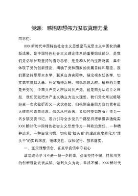 党课:感悟思想伟力汲取真理力量同志们:XXX新时代中国特色社会主义思想是马克思主义中国化的最新成果,是中国特色社会主义理论体系的重要组成部分,是我们党必须长期坚持的指导思想,是党和人民的宝贵财富,集中体现了党的创新理论,明确了党和国家的发展目标和路径。我们要坚持原原本本学,联系自身实际学,锚定根本任务学,切实筑牢信仰之基、补足精神之钙、把稳思想之舵。精神的力量是无穷的,中国共产党之所以叫共产党,就是因为从成立之日起,我们党就把共产主义确立为远大理想。我们党之所以能够经受一次次挫折而又一次次奋起,归根到底是因为我们党有远大理想和崇高追求。信念从何而来,又如何坚如磐石?作为一名乡镇党委书记,着力引导全乡党员干部坚持把学懂弄通做实XXX新时代中国特色社会主义思想作为一种政治责任、一种精神追求、一种自觉习惯,切实把抬头看的理论高度转化为埋头干的实践深度,锤炼党性、以知促行、狠抓落实。一、坚定理想信念,在真学真信中守初心政治理论学习不是一朝一夕的事,必须坚持不懈,持续用党的创新理论武装头脑,做到久久为功、常抓不懈。XXX新时代中国特色社会主义思想是全党全国人民为实现中华民族伟大复兴而团结奋斗的行动指南,作为一名乡镇党委书记,要始终冲在学习贯彻的第一梯队,自觉把学习贯彻XXX新时代中国特色社会主义思想作为当前和今后的重要政治任务来抓。(一)坚持不懈用XXX新时代中国特色社会主义思想凝心铸魂。坚定不移用XXX新时代中国特色社会主义思想武装头脑,深刻认识和领会其核心要义、精神实质、丰富内涵、实践要求,坚决有力贯彻落实好第一议题制度,依托理论学习中心组、党委会议、三会一课、主题党日、党员教育培训等载体,全面贯彻学习XXX新时代中国特色社会主义思想。(二)坚持从思想上正本清源、固本培元。常怀忠诚之心,常思党员之责,始终保持头脑清醒,始终认清肩上重任,衷心拥护两个确立,忠诚践行两个维护,在思想上认同,情感上认可,行动上追随,切实站稳政治立场、把准政治方向、坚持政治原则,做到党中央号召的坚决响应、党中央决定的坚决执行、党中央禁止的坚决不做,滋养政治灵魂、练就政治慧眼、锤炼政治品格。(三)坚持从中汲取智慧和力量。牢固树立权力就是责任,岗位就是重任的责任感,切实增强主人翁意识,提振想担当、愿担当的大局观念和政治站位,紧跟党中央大政方针走,紧跟省委、市委决策部署走,紧跟县委工作要求走,找准与旧城乡实际工作的结合点,搞清楚目标任务是什么、未来发展靠什么、下步工作抓什么,带头研究细化贯彻落实意见,制定出可量化的目标和可操作的措施,确保各项工作推进始终聚焦中心而谋、服务大局而动,不断推动党的战略部署取得扎实成效。二、增强宗旨意识,在笃行不怠中担使命理论学习的目的在于指导工作实践,前提是在学懂、弄通上下功夫,根本是在用好、做实上出实效。深入学习贯彻XXX新时代中国特色社会主义思想,既要注重改造客观世界,又要注重改造主观世界,二者是相连相通、紧密联系的,自觉做到理论武装头脑、联系工作实际、推动工作落实、践行初心使命。(一)情系群众安危冷暖,优化为民服务的宗旨意识。XXX新时代中国特色社会主义思想始终突出依靠谁、为了谁、我是谁这个根本问题,贯穿着鲜明的人民立场,体现了真挚的为民情怀。党的XX大报告鲜明提出为民造福是立党为公、执政为民的本质要求,烙印着我们党与人民水乳交融的初心本色,闪耀着民为根、民为本、民为天的思想光辉。作为一名乡镇党委书记,要用脚步度量大地,用真情换取真心,常怀为民之心、常行亲民之举、常思敬民之意、常做惠民之事,始终坚持立党为公、执政为民,以人民群众的根本利益为工作出发点,经常性深入基层走访入户,了解群众心声,把群众满不满意作为衡量工作成败的标尺,带着激情、带着热情、带着感情深入到群众家中,多交流多沟通,了解基层最真实想法,制定科学的帮扶措施,及时解决急难愁盼问题,让群众的获得感更加充实、幸福感更有保障、安全感更可持续。(二)推动三农工作高质量发展,奋力谱写乡村振兴新篇章。深刻感悟XXXXXX深厚的三农情怀,准确领会党中央实施乡村振兴战略的战略意图,以农业农村优先发展为目标,强化农业经营,打造农业品牌,提升农业效益。以整治农村人居环境为推手,有效提升村容村貌,建设宜居宜业和美乡村,不断提高居住环境质量。以生态文明建设为己任,持续做好生态修复、环境保护、绿色发展三篇文章,贯彻落实好绿水青山就是金山银山的理念,坚决打赢蓝天、碧水、净土污染防治攻坚战。以深化网格化服务管理为载体,持续推进枫桥经验,筑牢共建共治共享的社会治理新格局。抓实安全生产工作,常态化开展安全生产检查,强化宣传提高认识,坚决遏制辖区重特大事故发生,为社会稳定奠定基础;坚持发挥党建引领作用,以党建引领+产业发展