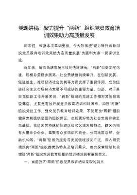 党课讲稿:聚力提升两新组织党员教育培训效果助力高质量发展同志们,根据本次集训安排,今天我围绕聚力提升两新组织党员教育培训效果助力高质量发展为题和大家一起探讨交流。近年来,随着新增市场主体的快速增长,两新组织发展迅速,规模总量稳步提高、社会贡献值持续攀升,在创新发展、促进就业、推动经济社会发展等方面发挥了重要作用,成为促进社会主义市场经济发展不可或缺的重要力量。但是,对于基层党组织工作开展来说,两新组织的党建工作相对其他领域较薄弱,尤其是有效开展党员教育培训相对困难。加强两新组织党建工作,强化党员教育培训效果,不仅能为两新组织健康发展提供坚强的组织保证,也能更好地为社会发展夯实思想基础。我区因其特殊的地理区位和区域发展特点,辖区内拥有大量非公企业,集聚着众多组织和商会、公司地区总部、金融机构等。两新组织的服务与发展领域涉及广泛,深入研究辖区内两新组织的党员特点及培训需求,着力探索能够切实增强两新组织党员教育质量的培训模式具有重要意义。一、当前我区两新组织党员教育培训呈现的特点为了深入分析两新组织党员的培训需求,区委党校调研组以问卷的形式开展了调研。从收回的有效问卷中反映出以下几方面的特点,从年龄结构看,党员年龄在31-40岁、40-50岁这两个年龄段的党员在工作中属于中坚力量,在家庭中处于支柱位置。从学历分布看,本科及以上学历的占百分之八十,说明受访者具有较强的学习能力和较高的知识水平,对知识掌握快,容易接受新事物、新理念。从党龄看,超过百分之八十五的受访者具有五年以上党龄,具有较长的党组织生活经历,在所在党组织中能够起到很强的示范作用。受访者中有近百分之十五为专职党务工作者,其他为企业或组织中不同岗位的人员,具有一定的普遍性和代表性。近年来,两新组织党建工作逐渐受到重视,党员的教育培训工作也在不断加强。我区结合自身区域内两新组织党员特点,依托区委党校分校平台不断加强两新组织党员教育工作,通过举办示范培训班加大组织教育培训力度。调研结果表明,超过百分之六十的两新"组织每年集中组织党员培训超过一周;从党员个体参与情况来看,每年参加培训一周以上的党员在过半数以上。在培训方式上,以专题讲座为主,同时包含主题研讨、现场教学(现场参观)、案例教学、情景观摩、实景体验等。还有一些党员表示日常通过学习强国app、党校分校讲堂平台等开展自学,教育培训形式日渐丰富。从培训效果看,受访者表示通过教育培训,自身政治理论素养得到提升,坚定了理想信念,增强了党性修养,激发了爱党爱国热情。超过一半的管理者表示,加强党员的教育培训可以提升企业(组织)发展能力,使党员能够更好地发挥先锋模范作用。二、影响和制约两新组织党员教育培训效果提升的因素(一)受制于两新组织所在企业的支持力度。受企业规模、发展阶段、现实效益情况和企业负责人对党建工作认识程度等影响,一些两新组织的关注点主要在经济效益和未来业务发展等方面,部分企业主对党建工作能够促进企业更好发展的认识还不够,出于对经常开展活动占用企业生产时间、增加管理和经营成本等考虑,对于企业内的党员教育培训持消极态度["。企业的态度一方面影响其党员的可学习时间,另一方面也影响着党员的学习积极性和重视程度。因此,如果企业重视党建工作其党员对教育培训参与的积极性就相对更高,反之则会出现党员教育培训形式化的现象。同时,调研发现两新组织的中层或负责人都希望能将党员教育与企业的实际发展相结合,通过党员能够带动企业更好地发展,希望企业的党建工作能更好地促进企业发展壮大。(二)受制于两新组织党员的分散性和流动性。一般情况下,两新组织的党组织具有规模小、党员数量少等特点,很多党员分布在不同企业联合建立的党组织中,还有一些党员组织关系在属地建立的联合党支部。处于联合党支部的党员工作地点分布较零散,不同党员之间的工作性质跨度较大,很多党员工作时间不固定,难以召集和组织到一起,给集中组织党员教育培训带来很大难度。此外,党员的培训教育管理工作是党务工作者的重要职责,但由于目前两新"组织中的党务工作者大多为兼职,任职前基本上没有相关工作经历、流动性大,加上自身业务工作压力大,很难集中精力认真研究,难以形成针对两新组织分散性的有效培训模式,这也是制约两新组织党员教育培训效果的重要因素。(三)受制于两新组织党员教育培训的内容和形式。部分两新组织党员缺少接受教育的主动性,除受工作环境等外在因素的限制外,培训方式与两新"组织的性质和特点未能有效适应,培训方式的固化是党员教育培训效果不理想的主要原因之一。由于两新组织党员的年龄结构、职业性质差别较大,学习的关注点也具有较大差异性,采取同样的模式、同样的内容对其开展教育,难以产生共鸣,也会削弱党员的学习热情和