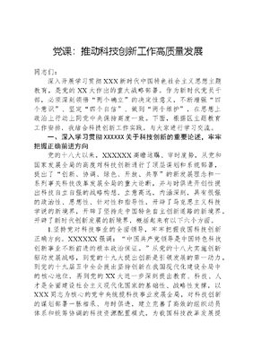 党课:推动科技创新工作高质量发展同志们:深入开展学习贯彻XXX新时代中国特色社会主义思想主题教育,是党的XX大作出的重大战略部署。作为新时代党员干部,必须深刻领悟两个确立的决定性意义,不断增强四个意识、坚定四个自信、做到两个维护,在思想上政治上行动上同党中央保持高度一致。下面,根据区主题教育工作安排,我结合科技创新工作实践,与大家进行学习交流。一、深入学习贯彻XXXXXX关于科技创新的重要论述,牢牢把握正确前进方向党的十八大以来,XXXXXX高瞻远瞩、审时度势,从党和国家发展全局的高度对科技创新进行了顶层谋划和系统部署,提出了创新、协调、绿色、开放、共享的新发展理念和一系列事关科技改革发展全局的重大论断,并与时俱进开创性提出科技自立自强的战略构想,立意高远,内涵深刻,具有很强的政治性、思想性、针对性和指导性,开辟了马克思主义科技学说的新境界,开辟了坚持走中国特色自主创新道路的新境界,开辟了新时代创新发展的新境界,概括起来有以下六个方面。1.坚持党对科技事业的全面领导,牢牢把握我国科技创新正确方向。XXXXXX强调:中国共产党领导是中国特色科技创新事业不断前进的根本政治保证。从党的十八大实施创新驱动发展战略,到党的十九大提出创新是引领发展的第一动力,到党的十九届五中全会提出坚持创新在我国现代化建设全局中的核心地位,再到党的XX大进一步深刻提出教育、科技、人才是全面建设社会主义现代化国家的基础性、战略性支撑,以XXX同志为核心的党中央统揽科技事业发展全局,对科技创新的谋划部署一脉相承、与时俱进,建立完善了高效的组织动员体系和统筹协调的科技资源配置模式,为我国科技改革发展提供了坚强政治保证。2.坚持创新驱动发展,全面塑造发展新优势。XXXXXX强调,实施创新驱动发展战略,必须紧紧抓住科技创新这个牛鼻子。我国已由高速增长阶段转向高质量发展阶段,立足新发展阶段、落实新发展理念、构建新发展格局、推动高质量发展,实现质量变革、效率变革、动力变革,迫切需要更多高质量的科技创新供给,塑造更多依靠创新驱动、更多发挥先发优势的引领型发展。3.坚持四个面向战略方向,提高科技创新对统筹发展和安全的支撑引领能力。XXXXXX强调,科技创新必须面向世界科技前沿、面向经济主战场、面向国家重大需求、面向人民生命健康,明确了推进科技事业发展的战略方向。当前,我国发展面临的机遇和挑战并存,要办好发展和安全两件大事,必须向科技创新要方法、要答案,以高水平科技自立自强提供筋骨支撑。要加强基础研究和原始创新,以非对称策略在前沿领域加快换道超车。4.坚持人才是第一资源,最大限度激发人才创新创造活力。XXXXXX强调,创新驱动实质上是人才驱动,硬实力、软实力,归根到底要靠人才实力。科技创新本质上是人的创造性活动,人才资源是创新活动中最为活跃、最为积极的因素。要围绕重要学科领域和创新方向完善战略科技人才、科技领军人才和创新团队培养发现机制,健全创新激励和保障机制,完善科技人才评价体系,弘扬科学家精神,推动作风学风建设。5.坚持科技创新和体制机制创新双轮驱动,营造良好的创新生态和政策环境。XXXXXX强调:创新决胜未来,改革关乎国运。科技改革发展涉及生产力和生产关系的多方面调整,如果把科技创新比作我国发展的新引擎,那么改革就是点燃这个新引擎必不可少的点火系。让科技创新和体制机制创新两个轮子共同转动,目的就是以改革驱动创新,以创新驱动发展,破除制约科技创新的体制机制障碍,把创新驱动的新引擎全速发动起来。6.坚持以全球视野谋划和推动科技创新,增强国际创新治理的参与度和影响力。XXXXXX强调:科学技术是世界性的、时代性的,发展科学技术必须具有全球视野。科技自立自强与开放合作辩证统一、并行不悖,开放合作是中国特色自主创新道路的应有之义,而科技自立自强是能够平等合作的前提和基础。要坚持融入全球科技创新网络,深度参与全球创新治理,积极拓展科技对外开放的格局和空间。XXXXXX关于科技创新的重要论述是XXX新时代中国特色社会主义思想的重要组成部分,是新时代科技创新工作的根本遵循和行动指南。我们必须进一步提高政治站位,强化政治意识和政治能力,全面系统学习理解掌握,把学习成果转化为推动新时代科技改革发展的生动实践。二、认真贯彻落实区委全会精神,不断开创高新区科技工作新局面区委全会是在推进高质量发展的关键时期召开的一次十分重要的会议,明确把产业兴区、创新引领作为全区现代化建设的总策略,更好地以科技创新引领产业升级。(一)高新区科技创新工作总体情况。年初以来,我们认真落实区党工委管委会决策部署,着力做好创新主体培育、平台载体建设、科技人才引育、成果转移转化、创新生态营造,引导企业开展创新活动、提高创新能力,助推主导产业转型