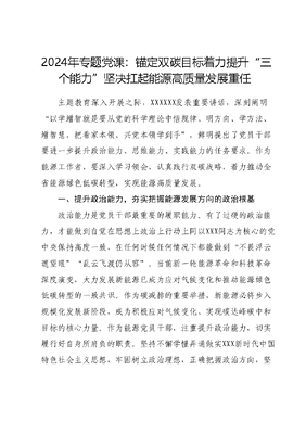 2024年专题党课:锚定双碳目标着力提升三个能力坚决扛起能源高质量发展重任主题教育深入开展之际,XXXXXX发表重要讲话,深刻阐明以学增智就是要从党的科学理论中悟规律、明方向、学方法、增智慧,把看家本领、兴党本领学到手,鲜明提出了党员干部要进一步提升政治能力、思维能力、实践能力的任务要求。作为能源工作者,要深入学习领会,认真践行双碳战略,着力推动全省能源绿色低碳转型,实现能源高质量发展。一、提升政治能力,夯实把握能源发展方向的政治根基政治能力是党员干部最重要的履职能力。有了过硬的政治能力,才能做到自觉在思想上政治上行动上同以XXX同志为核心的党中央保持高度一致,在任何时候任何情况下都能做到不畏浮云遮望眼乱云飞渡仍从容。当前新一轮能源革命和科技革命深度演变,大力发展新能源已成为应对气候变化和推动能源绿色低碳转型的一致共识。作为碳减排的重要举措,新能源必将步入规模化发展新阶段,成为积极应对气候变化、实现碳达峰碳中和目标的核心力量。作为能源党员干部,注重提升政治能力,切实履行好自身所肩负的职责。坚持不懈学懂弄通做实XXX新时代中国特色社会主义思想,牢固树立政治理想,正确把握政治方向,坚定站稳政治立场,严格遵守政治纪律,加强政治历练,积累政治经验,使自己的政治能力同所担任的职务和所肩负的职责相匹配更加自觉贯彻党中央和省委省政府关于碳达峰碳中和的重大决策部署,围绕全省一主六双高质量发展战略,聚焦六新产业和四新设施,紧紧抓住五大工程这个关键推动全省能源产业实现高质量发展。政治能力是善于从党和人民立场和国家大局出发思考问题的能力。XXXXXX强调人民立场是中国共产党的根本政治立场,是马克思主义政党区别于其他政党的显著标志。要时刻把事关党和国家前途命运、事关人民根本利益的大事放在心上,牢牢站稳人民立场,做到能源发展为了人民。深入实施新能源乡村振兴工程,顺应人民对美好生活的向往。要促进能源改革发展成果更多惠及企业、惠及民生,解决好人民群众急难愁盼问题,逐步实现能源用得上向用得好转变。不断优化提升政务服务质量提高获得电力水平,持续做好电力市场化交易,积极做好电力现货细则编制,推动全体人民共同富裕取得更为明显的实质性进展。政治能力是善于从繁杂问题中把握事物规律、趋势的能力。XXX新时代中国特色社会主义思想深化了对共产党执政规律、社会主义建设规律、人类社会发展规律的认识。我们要熟练掌握这一科学理论蕴含的领导方法、思想方法、工作方法,善于运用这一科学理论观察时代、把握时代、引领时代,准确把握事物发展的必然趋势,不断提高政治敏锐力和政治鉴别力,提升透过现象看本质的能力。充分认识能源是支撑经济高质量发展重要的基础保障作用。能源必须立足高质量发展,面向国家能源四个革命、一个合作重大需求,面向碳达峰碳中和重大战略决策,积极布局新能源产业格局,在新能源装备产业链、储能、氢能做出规划和布局,做到眼睛亮、见事早、行动快。政治能力是能够驾驭复杂局面、防范政治风险的能力。当前世界之变、时代之变、历史之变正以前所未有的方式展开,这是改革开放以来从未遇到过的。在能源领域,在双碳战略大背景下推动能源绿色低碳转型,大力发展新能源产业,已成为能源行业未来发展的必由之路。围绕新能源发展的竞争日趋激烈,比如特高压通道建设,在电力十四五规划中已有12条,去年又新增了5条,加上我省正积极推动的吉电入京,国内多条特高压通道正在推动建设,可谓千帆竞发、百舸争流。提升政治能力,就是要有忧患意识,坚持底线思维,居安思危、未雨绸缪,时刻保持箭在弦上的备战姿态,下好先手棋,打好主动仗。二、提升思维能力,准确把握推动能源转型发展的关键XXXXXX对提升思维能力做出深刻阐释,强调要做到善于把握事物本质、把握发展规律、把握工作关键,把握政策尺度,增强工作科学性、预见性、主动性、创造性。做好全省能源工作要在111555能源工作思路引领性,切实提升战略思维、系统思想创新思维和底线思维,以新能源产业发展为主线,以陆上风光三峡等一批重大能源项目建设为支撑,以推动清洁能源消纳为主攻方向,着力推动全省能源高质量发展取得新成效。一是强化战略思维,优化顶层设计。着重加强源网荷储的协同规划和布局优化。新能源具有间歇性和波动性,必须推进源网荷储一体化和多能互补发展,按照新能源+储能+火电协同运行模式,以储能火电调整支撑清洁能源高比例上网模式进行顶层设计,保证电力系统安全稳定高效运行。比如,五大工程是根据新能源发展新形势新任务提出的,包括消纳提速工程储能提升工程、新型电网工程、六新产业耦合工程、创新驱动工程,涵盖了源网荷储一体化等多方面设想,是能源发展的有效路径,是项目和产业融合发展的关,将是我省新能源产业的着力点、增长点。二是坚持系统
