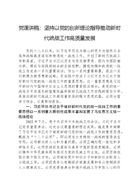 党课讲稿:坚持以党的创新理论指导推动新时代统战工作高质量发展党的十八大以来,以习近平同志为核心的党中央始终从全局和战略高度谋划和推进统一战线工作,开创了新时代统战工作新局面。习近平总书记以历史与现实相贯通、国内与国际相关联、理论与实践相结合的宏阔视野,围绕加强和改进统一战线工作发表一系列重要讲话,作出一系列重要部署,提出一系列新理念新思想新战略,在实践中形成了习近平总书记关于做好新时代党的统一战线工作的重要思想。这一重要思想是习近平新时代中国特色社会主义思想的重要组成部分,是党的统一战线百年发展史的智慧结晶和新时代统战工作实践的理论升华,是推动新时代统战工作高质量发展的强大思想武器,必须全面学习领会、认真贯彻落实。一、习近平总书记关于做好新时代党的统一战线工作的重要思想以一系列重大原创性成果丰富和发展了马克思主义统一战线理论2022年7月,党中央召开中央统战工作会议,习近平总书记发表重要讲话。这次会议最重要的理论成果,就是集中阐释了习近平总书记关于做好新时代党的统一战线工作的重要思想,概括为十二个必须,即必须充分发挥统一战线的重要法宝作用,必须解决好人心和力量问题,必须正确处理一致性和多样性关系,必须坚持好发展好完善好中国新型政党制度,必须以铸牢中华民族共同体意识为党的民族工作主线,必须坚持我国宗教中国化方向,必须做好党外知识分子和新的社会阶层人士统战工作,必须促进非公有制经济健康发展和非公有制经济人士健康成长,必须发挥港澳台和海外统战工作争取人心的作用,必须加强党外代表人士队伍建设,必须把握做好统战工作的规律,必须加强党对统战工作的全面领导。十二个必须是一个逻辑严密、内在统一的有机整体,是一个完整的理论体系,既站在两个大局的高度明确了统一战线在党和国家事业中的重要地位、本质要求和基本方针,又从新时代统一战线的总目标出发,明确了统一战线各领域工作的任务和重点,谱写了马克思主义统一战线理论发展新篇章。坚持把马克思主义统一战线理论同中国具体实际相结合、同中华优秀传统文化相结合,科学回答新时代统一战线重大理论和实践问题。两个结合是我们党在探索中国特色社会主义道路中得出的规律性认识,是我们推进马克思主义中国化时代化的根本途径。特别是在第二个结合上,中华优秀传统文化作为中华文明的智慧结晶,其中蕴含的天下为公、民为邦本、为政以德、革故鼎新、任人唯贤、天人合一、自强不息、厚德载物、讲信修睦、亲仁善邻等思想内容,与马克思主义相融相通。习近平总书记关于做好新时代党的统一战线工作的重要思想坚守马克思主义这个魂脉和中华优秀传统文化这个根脉,是两个结合的重大成果。比如,继承和发展中华文明德政、仁政的思想主张,强调统战工作的本质要求是大团结大联合,解决的就是人心和力量问题;继承和发展中华文明兼容并包、求同存异的政治智慧,强调牢牢把握大团结大联合的主题,坚持一致性和多样性统一,找到最大公约数,画出最大同心圆;继承和发展中华文明的天下共治理念和共和、商量的施政传统,强调坚持好发展好完善好中国新型政党制度,努力把中国特色社会主义参政党建设提高到新水平;继承和发展中华文明六合同风,九州共贯的大一统思想,顺应向内凝聚、多元一体的中华民族发展大趋势,强调铸牢中华民族共同体意识;继承和发展中华文明革故鼎新、与时俱进的改革创新精神,强调构建亲清统一的新型政商关系,做好新的社会阶层人士工作,强化共同奋斗的政治引领;继承和发展中华文明海纳百川、厚德载物的博大胸怀,强调实现中华民族伟大复兴是海内外中华儿女共同的梦,要完善大统战工作格局,动员全体中华儿女围绕实现中华民族伟大复兴中国梦一起来想、一起来干,等等。这一重要思想创造性地将中华优秀传统文化中的核心价值理念运用到统战工作之中,推动马克思主义统一战线理论中国化时代化实现了新发展、开辟了新境界。立足中华民族伟大复兴战略全局和世界百年未有之大变局突出强调统一战线凝聚人心、汇聚力量的强大法宝作用。在我国革命、建设、改革各个历史时期,我们党先后建立了国民革命联合战线、工农民主统一战线、抗日民族统一战线、人民民主统一战线、新时期爱国统一战线。尽管统一战线在不同时期担负的历史任务有所不同,团结联合的范围对象有所变化,采取的政策策略也有所区别,但大团结大联合的本质要求始终没有变,凝聚人心、汇聚力量的法宝作用始终没有变。进入新时代,我们面临错综复杂的外部环境和我国进入新发展阶段的新形势,党中央强调必须把推进中国式现代化作为最大的政治,必须把坚持高质量发展作为新时代的硬道理,擘画了全面建设社会主义现代化国家、以中国式现代化全面推进中华民族伟大复兴的宏伟蓝图。统一战线作为党的总路线总政策的重要组成部分,随着党的中心任务和世情国情的发展变化,担负着更重要的使命。特别是统一战线处在反分裂反渗透斗争的