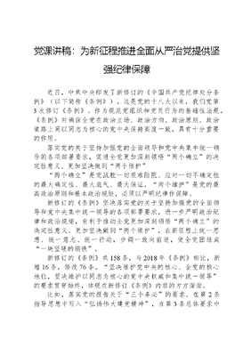 党课讲稿:为新征程推进全面从严治党提供坚强纪律保障近日,中共中央印发了新修订的《中国共产党纪律处分条例》(以下简称《条例》)。这是党的十八大以来,我们党第3次修订《条例》。作为规范党组织和党员行为的基础性法规,《条例》对确保全党在政治立场、政治方向、政治原则、政治道路上同以同志为核心的党中央保持高度一致,具有十分重要的作用。落实党的关于坚持加强党的全面领导和党中央集中统一领导的各项部署要求,促进全党更加深刻领悟两个确立的决定性意义、更加坚决做到两个维护两个确立是党战胜一切艰难险阻、应对一切不确定性的最大确定性、最大底气、最大保证,两个维护是党的最高政治原则和根本政治规矩,必须以严明纪律作保障。新修订的《条例》坚决落实党的关于坚持加强党的全面领导和党中央集中统一领导的各项部署要求,进一步严明政治纪律和政治规矩,有利于推动全党更加深刻领悟两个确立的决定性意义、更加坚决做到两个维护,在新征程上统一思想、统一意志、统一行动,步调一致向前进,使全党团结成一块坚硬的钢铁。新修订的《条例》共158条,与2018年《条例》相比,新增16条,修改76条。坚决维护党中央的核心、全党的核心地位,坚决维护以同志为核心的党中央权威和集中统一领导的要求贯穿始终,体现在新修订《条例》内容的方方面面。比如,落实党的报告关于三个务必的要求,在第2条指导思想中写入弘扬伟大建党精神,在第3条总体要求中增写坚守初心使命切实践行正确的权力观、政绩观、事业观等内容,引导党员、干部增强纪律自觉。落实党的报告关于加快构建新发展格局,着力推动高质量发展的要求,充实党员领导干部政绩观错位,违背新发展理念、背离高质量发展要求的处分规定,将搞劳民伤财的形象工程政绩工程行为由违反群众纪律调整到违反政治纪律,等等。这些都充分体现出《条例》修订的重要特征之一,就是把坚决维护以同志为核心的党中央权威和集中统一领导作为出发点和落脚点。将有关重要论述转化为纪律要求,用贯穿党的创新理论的立场观点方法引领纪律建设工作党的十九大以来,围绕解决大党独有难题、健全全面从严治党体系、全面加强党的纪律建设提出一系列新思想新观点新论断,强调把严的基调、严的措施、严的氛围长期坚持下去,把纪律建设摆在更加突出位置,坚持党性党风党纪一起抓,在增强纪律自觉性上下更大功夫。这是我们党对新时代新征程全面从严治党规律的深刻把握,是新时代中国特色社会主义思想的重要组成部分。新修订的《条例》将关于全面加强党的纪律建设重要论述转化为纪律要求,用贯穿党的创新理论的立场观点方法引领纪律建设工作,有利于为新征程上一刻不停推进全面从严治党提供坚强纪律保障。比如,新修订的《条例》巩固主题教育成果,落实关于推进党的自我革命、全面加强党的纪律建设重要论述的要求,在第2条指导思想中增写坚持自我革命推动解决大党独有难题、健全全面从严治党体系为以中国式现代化全面推进强国建设、民族复兴伟业提供坚强纪律保障等内容。在第4条工作原则中增写把严的基调、严的措施、严的氛围长期坚持下去。再比如,落实反复强调的坚持勤俭节约、反对铺张浪费重要要求,引导广大党员崇尚简朴生活,增写对铺张浪费造成不良影响行为的处分规定。坚持尊崇和维护党章,从党章总源头出发,将党章要求具体化为纪律规定本次对《条例》作出修订,首要原则就是坚持尊崇和维护党章,将党章的规定要求细化具体化,用党章这把尺子衡量干部、丈量工作,维护党章的权威性和严肃性。比如,落实党章关于充分发挥人才作为第一资源的作用要求,聚焦保障人才评价机制落实,增加对在授予学术称号中弄虚作假、违规谋利行为的处分规定;落实党章规定,增写反对特权思想和特权现象的内容;立足始终保持党同人民群众的血肉联系,完善对慢作为、假作为等损害群众利益行为的处分规定;增写对在党组织纪律审查中,依法依规负有作证义务的党员拒绝作证或者故意提供虚假情况的处分规定,推动党员强化组织意识,不忘自己应尽的义务和责任。在党的各项纪律中,政治纪律是最重要、最根本、最关键的纪律。新修订的《条例》在政治纪律部分充实对党不忠诚不老实、破坏党的团结统一的处分规定,增加搞政治攀附、结交政治骗子等行为的处分规定,对违反政治纪律行为的处分规定更加充实、表述更加清晰、界定更加精准。剑指突出问题,扎紧制度篱笆,修订《条例》就是要把坚决维护以同志为核心的党中央权威和集中统一领导作为根本的政治纪律和政治规矩,推动各级党组织和党员、干部始终在政治立场、政治方向、政治原则、政治道路上同以同志为核心的党中央保持高度一致。