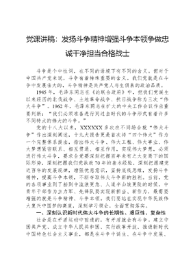 党课讲稿:发扬斗争精神增强斗争本领争做忠诚干净担当合格战士斗争是个中性词,在不同的语境下有不同的含义。但对于中国共产党来说,斗争有着特殊重要的含义。我们党就是在斗争中发展壮大的,斗争精神是共产党人与生俱来的政治品质。1945年,毛泽东同志在《论联合政府》中,把我们党诞生以来经历的北伐战争、土地革命战争、抗日战争称为三次伟大斗争。1962年,毛泽东同志在扩大的中央工作会议作出重要判断:我们必须准备进行同过去时代的斗争形式有着许多不同特点的伟大的斗争。党的十八大以来,XXXXXX多次在不同场合就伟大斗争作出深刻阐述,十九大报告更是首次将四个伟大作为一个完整体系提出,指出伟大斗争、伟大工程、伟大事业、伟大梦想紧密联系、相互贯通、相互作用,实现伟大梦想,必须进行伟大斗争,要求全党要深刻把握百年未有之大变局下的国际形势,深刻把握我们党执政70年的基本经验,深刻把握建党近百年的发展规律,增强忧患意识,坚持底线思维,发扬斗争精神,提高斗争本领,不断夺取伟大斗争新的胜利。当前,党的各项事业到了船到中流浪更急、人道半山坡更陡的时候,中青年干部作为主力军、先锋队要实现新担当、新作为,最需要增强的就是斗争精神、斗争本领。我们要站在实现中华民族伟大复兴中国梦的高度,深刻学习领会,全面贯彻落实。一、深刻认识新时代伟大斗争的长期性、艰巨性、复杂性社会是在矛盾运动中前进的,有矛盾就会有斗争。建立中国共产党、成立中华人民共和国、实行改革开放、推进新时代中国特色社会主义事业,都是在斗争中诞生、在斗争中发展、在斗争中壮大的。站在新时代这一新的历史方位,要充分认识斗争的长期性。XXXXXX指出,我们面临的各种斗争不是短期的而是长期的,至少要伴随我们实现第二个百年奋斗目标全过程。这一重大判断彰显了清醒的战略睿智。敌对势力不愿看到由大向强的中国顺顺当当发展,不断对我国进行战略遏制和围堵。在前进道路上面临的风险考验只会越来越复杂,甚至会遇到难以想象的惊涛骇浪。从我们自身来看,中国特色社会主义制度是特色鲜明、富有效率的,但还不是尽善尽美、成熟定型的。中国特色社会主义事业不断发展,中国特色社会主义制度也需要不断完善。这就须要发扬斗争精神,持续不断进行自我革命、自我完善,着力构建系统完备、科学规范、运行有效的制度体系,使各方面制度更加成熟、更加定型,更好支撑起中华民族伟大复兴的历史伟业。要充分认识斗争的艰巨性。艰巨二字,艰体现斗争的难度,巨体现斗争的规模。这种艰巨性一方面来源于外部因素,我们越是靠近世界舞台中心,面临的阻力和压力就越大,推进伟大斗争也就越难。另一方面源于内部因素,推进伟大社会革命,需要深刻调整利益格局,需要解决突出矛盾问题,需要防范化解重大风险,其难度前所未有。当前和今后一个时期,我国发展进入各种风险挑战不断积累甚至集中显露的时期,面临的重大斗争不会少,经济、政治、文化、社会、生态文明建设等方面都有。面对如此艰巨的伟大斗争,我们只能丢掉幻想、做好准备,以明知山有虎、偏向虎山行的决心意志,涉险滩,闯难关。要充分认识斗争的复杂性。中华民族伟大复兴,绝不是轻轻松松、敲锣打鼓就能实现的。我们必须准备付出更为艰巨、更为艰苦的努力。新时代伟大斗争,多重因素的交织叠加是在大变局中发生的,在世界战略格局大变动、人类发展方式大转型、当代中国社会大变革、中外思想文化大激荡同频共振的宏大场景中,伟大斗争的复杂性尤为凸显。主要矛盾和次要矛盾相互转化,各种矛盾相互交织、牵一发而动全身,这些都对推进新时代伟大斗争提文可居文库——海量学习资料,手机电脑下载www.wenkeju.com出了新的更高要求。二、科学把握新时代推进伟大斗争的基本要求一要发扬斗争精神。培养和保持顽强的斗争精神、坚韧的斗争意志,这是推进伟大斗争的强大动力。XXXXXX强调:面对新形势新挑战,要发扬斗争精神,既要敢于斗争,又要善于斗争骨头要硬,敢于出击,敢战能胜以踏平坎坷成大道,斗罢艰险又出发的顽强意志,应对好每一场重大风险挑战,切实把改革发展稳定各项工作做实做好。二要把准斗争方向。共产党人的斗争不是为了私利而相互攻击的窝里斗,也不是不分青红皂白的乱斗,更不是逞强好胜、争勇斗狠的瞎斗,而是有方向、有立场、有原则的。XXXXXX通过五个凡是阐释了共产党人斗争所要坚持的方向、立场和原则,指出凡是危害中国共产党领导和我国社会主义制度的各种风险挑战,凡是危害我国主权、安全、发展利益的各种风险挑战,凡是危害我国核心利益和重大原则的各种风险挑战,凡是危害我国人民根本利益的各种风险挑战,凡是危害我国实现两个一百年奋斗目标、实现中华民族伟大复兴的各种风险挑战,只要来了,我们就必须进行坚决斗争,而且必须取得斗争胜利。这五个凡是的重要论述,明确了推进新