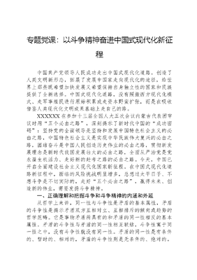 专题党课:以斗争精神奋进中国式现代化新征程中国共产党领导人民成功走出中国式现代化道路,创造了人类文明新形态,拓展了发展中国家走向现代化的途径,给世界上那些既希望加快发展又希望保持自身独立性的国家和民族提供了全新选择。中国式现代化道路,没有照搬西方现代化模式、走军事殖民进行原始积累或走资本野蛮扩张,而是在吸收借鉴人类现代化文明成果基础上走自己的路。XXXXXX在参加十三届全国人大五次会议内蒙古代表团审议时用五个必由之路,深刻揭示了新时代中国的成功密码:坚持党的全面领导是坚持和发展中国特色社会主义的必由之路,中国特色社会主义是实现中华民族伟大复兴的必由之路,团结奋斗是中国人民创造历史伟业的必由之路,贯彻新发展理念是新时代我国发展壮大的必由之路,全面从严治党是党永葆生机活力、走好新的赶考之路的必由之路。今天,中国已开启全面建设社会主义现代化国家新征程。在中国式现代化道路新征程中,面临的风险挑战明显增多,总想过太平日子、不想斗争是不切实际的,走好五个必由之路,赢得未来、创造新的伟业,需要发扬斗争精神。一、正确理解和把握斗争和斗争精神的内涵和外延从哲学上来讲,同一性与斗争性是矛盾的基本属性,矛盾的斗争性是揭示矛盾双方互相对立、互相排斥的倾向或趋势的哲学范畴。它是事物矛盾所具有的和矛盾的同一性相反的基本属性。矛盾的斗争性与矛盾的同一性相互联结,斗争性寓于同一性之中,没有斗争性就没有同一性。矛盾的同一性是有条件的、暂时的、相对的,矛盾的斗争性则是无条件的、绝对的。绝对的斗争性和相对的同一性相结合,推动着事物的变化发展。矛盾的斗争性在事物的发展中具有重要作用,它不仅引起事物的量变,而且是事物由旧质向新质转化、飞跃的决定力量。矛盾斗争的存在是普遍的、绝对的,但矛盾斗争的形式则是特殊的、相对的。矛盾斗争的形式由事物矛盾的性质和矛盾运动的具体条件所决定。矛盾的性质不同、所处的条件不同,矛盾斗争的形式也就不同。任何矛盾,以及矛盾发展的任何阶段,都包含着不同性质的两种因素的对立和斗争。矛盾的斗争可能采取对抗的形式,也可能采取非对抗的形式。正确理解矛盾斗争性的范畴,依据矛盾发展的客观进程以及矛盾的性质和它所处的客观条件,采取相应的斗争形式和方法,正确解决和处理各种矛盾,这是运用矛盾斗争学说所必须遵循的基本原则和要求。共产党人的斗争精神,来源于哲学上的矛盾的斗争性。饶有意味的是,提出共产党的哲学是斗争哲学的,并不是共产党人,而是国民党的军官。1945年4月24日毛泽东主席在中共七大政治报告中,在谈到与国民党结成抗日统一战线时应坚持既团结又斗争的方针时说,权利是争来的,不是送来的,这世界上有一个争字,我们的同志不要忘记了。有人说我们党的哲学叫斗争哲学,榆林有一个总司令叫邓宝珊的就是这样说的。我说你讲对了。自从有了奴隶主、封建主、资本家,他们就向被压迫的人民进行斗争,斗争哲学是他们先发明的。被压迫人民的斗争哲学出来得比较晚,那是斗争了几千年,才有了马克思主义。放弃斗争,只要团结,或者不注重斗争,马马虎虎地斗一下,但是斗得不恰当、不起劲,这是小资产阶级软弱性的表现。从哲学上关于矛盾的斗争性来理解,关于现实中的斗争和斗争精神,内涵和外延其实是很明确的。但世易时移,一些关于斗争和斗争精神的理解,逐渐出现偏差。一种是把斗争片面地理解为阶级斗争。这种理解下,容易导致阶级斗争扩大化或者阶级斗争熄灭论,而忘记了马克思的文可居文库——海量学习资料,手机电脑下载www.wenkeju.com经典论述。一种是把斗争简单地理解为军事斗争。其实,军事斗争是斗争的激烈形式,其他方面的斗争,如政治斗争、经济斗争,也是重要的斗争形式和方法。如皖南事变之后,我们党在政治斗争上采取猛烈攻势,而在军事斗争上只取守势,也取得了很大的成效;再比如建国初期的经济斗争,虽然不是军事斗争,但激烈程度和重大意义并不亚于军事斗争。由此可见,共产党人的斗争,不一定在战场上;即使是在其他方面,如党内政治生活中,甚至在各式各样的谈判中,都要有斗争精神。二、新时代新征程仍然需要发扬斗争精神中国共产党和中国人民是在斗争中成长和壮大起来的,斗争精神贯穿于中国革命、建设、改革各个时期。建设社会主义现代化国家,同样需要斗争,同样需要发扬斗争精神。早在1962年1月,毛泽东同志在扩大的中央工作会议(史称七千人大会)上讲话指出:从现在起,五十年内外到一百年内外,是世界上社会制度彻底变化的伟大时代,是一个翻天覆地的时代,是过去任何一个历史时代都不能比拟的。处在这样一个时代,我们必须准备进行同过去时代的斗争形式有着许多不同特点的伟大的斗争。XXXXXX曾经谈到:党的十八大报告有一句话,我主持起草工作时就主张要写上去,就是发展中国特色社会主义是一项长期的艰巨的历史任务,必须准