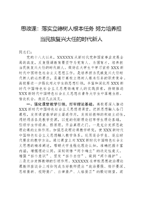 思政课:落实立德树人根本任务 努力培养担当民族复兴大任的时代新人同志们:党的十八大以来,XXXXXX从新时代党和国家事业发展全局的高度,反复强调教育要坚守为党育人、为国育才,培养担当民族复兴大任的时代新人。做好在大学生中学习宣传XXX新时代中国特色社会主义思想工作,是培养担当民族复兴大任时代新人的必然要求,是履行高校立德树人根本任务的职责使命。高校要进一步强化对大学生的思想引领,丰富和深化用XXX新时代中国特色社会主义思想铸魂育人的实践探索,持续推动XXX新时代中国特色社会主义思想在青年大学生中落地生根。借此机会,我谈几点浅见。一、强化课堂教学引领,打牢理论基础。高校要深入推动XXX新时代中国特色社会主义思想进课堂,把新思想融入各门课程,发挥课堂教学的主渠道作用,发挥好教师的积极主动性,用好用活各类教学资源,以党的创新理论打牢学生理论基础,引领学生学经典、悟原理,开启真理之门。一是充分发挥思政理论课的主体作用。加强思政理论课教学研究,使XXX新时代中国特色社会主义思想融入教学体系。运用适合学生、适应时代要求的教学方法,通过课堂上对XXX新时代中国特色社会主义思想的精准阐述,帮助大学生强化理论认知,准确把握丰富内涵,增强理论认同,深刻领悟两个确立的决定性意义,增强四个意识、坚定四个自信、做到两个维护。二是充分发挥教师的引领作用。XXXXXX在学校思想政治理论课教师座谈会上对如何成为好教师提出政治要强、情怀要深、思维要新、视野要广、自律要严、人格要正的殷切期望。高校要建强教师队伍,围绕政治强、理论深的标准,不断提升教师的政治素养,不断增强教师的理论内功,促使教师学深悟透理论的内涵和价值等问题。引导教师有效贴近学生接受契合点,用严谨的语言来表达新思想,促使学生从理论、实践、历史三重逻辑上理解党的创新理论成果,激发理论学习热情。三是探索多样化的教法提高课堂效果。鼓励教师紧扣时代脉搏,反映时代精神,积极探索创新教学方式,使用感染力强的形式拉进与学生的距离。鼓励教师多采用案例教学方法,通过联系马克思主义观点,凸显其思想继承性;通过联系新时代新跨越,凸显其产生的合理性;通过联系现代化建设成就,凸显其思想指导性,将XXX新时代中国特色社会主义思想的结构逻辑讲清楚,理论观点讲透彻,助力学生打牢理论基础。二、拓展学习教育形式,铸就坚定信念。大学生正处于人生的拔节孕穗期,需要适时培土、浇水、施肥,做好思想引领和灵魂塑造。高校要坚持用新时代党的创新理论为他们指引航向,通过采取丰富、灵活、有效的教育形式,使XXX新时代中国特色社会主义思想真正入脑入心,帮助大学生点亮心中灯,解开思想结,系好人生的第一粒扣子,铸就坚定信念。一是以丰富的学术活动深化学习教育。在融入深度上发力,着力提升党课培训质量,组织好讲座、论坛和学术活动,邀请人文社科理论界知名的专家学者解读阐释XXX新时代中国特色社会主义思想。举办主题学习讨论活动、读书活动等,通过组织学生开展党的创新理论成果学习研讨,分享学习心得,让学生参与进去、受到启发、深刻领悟,进一步增强大学生的理论认同,增强育人实效。二是以丰富的校园文化活动深化学习教育。用XXX新时代中国特色社会主义思想指引校园文化建设,发挥多渠道促进作用,依托学生喜闻乐见的校园文化活动载体,激发学生参加第二课堂兴趣。坚持重视内容和形式,将学习教文可居文库——海量学习资料,手机电脑均可下载www.wenkeju.com育融入知识竞赛、征文比赛、主题展览、文艺汇演等活动,在融合效度上发力,实现XXX新时代中国特色社会主义思想与校园文化活动有机契合,增强活动的知晓度、参与度和满意度,使学生从中受到教育、得到成长。三是以丰富的社团组织活动引领学习教育。成立XXX新时代中国特色社会主义思想大学生学习社团,吸引学生主动参与到学习活动中,增强学生学习的积极性,做到以学增智,促动学生将理论内化于心、外化于行。创建和培育高校新思想学习教育活动品牌,持续推进党的创新理论成果进校园,推动理论进大学生头脑,打通情感共鸣通道,锤炼精神品质,坚定理想信念。三、创新校园宣传方式,强化情感认同。XXXXXX指出:新时代以来,党的理论创新和实践创新是十分生动的,我们的学习也应该是生动的。高校要创新校园宣传教育内容和形式,营造浓厚的学习氛围,把生动的思想讲生动,把党的创新理论通过生动活泼、喜闻乐见的形式推送给大学生,推动学习XXX新时代中国特色社会主义思想往深里走、往实里走,发挥潜移默化作用,以党的创新理论固本培元、凝心铸魂,让学生在日常生活中坚定情感认同。一是创新常态化宣传阵地。发挥好常态化宣传阵地的支撑作用,以创新的方式和个性化设计来激发学生学习兴趣,让校园宣传教育保持持久旺盛的生命力。将XXX新时代中国特色社会主义思想与校园