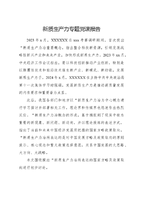 新质生产力专题党课报告2023年x月,XXXXXX在xxx考察调研期间,首次提出新质生产力冶重要概念,指出整合科技新资源,引领发展战略性新兴产业和未来产业,加快形成新质生产力。2023年xx月,中央经济工作会议指出,要以科技创新推动产业创新,特别是以颠覆性技术和前沿技术催生新产业、新模式、新动能,发展新质生产力于。2024年x月,XXXXXX在主持中共中央政治局第十一次集体学习时强调,发展新质生产力是推动高质量发展的内在要求和重要着力点盂。此后,我国各部门和地方以新质生产力冶为中心概念进行学习探讨并部署相关工作,理论界和传媒界也迅速作出热烈反应。新质生产力冶概念的形成,基于捕捉到了现实中极为重要的新现象、新问题、新动向,并以理论提炼的表述方式,指出了当前和未来中国经济发展须把握的国家方略政策取向。新质生产力冶所表达的是对中国发展方略及政策取向的原则提示、核心观念和重大政策选择意愿,关系中国发展的大思路、大方向、大战略。本文围绕提出新质生产力冶所表达的国家方略及政策取向进行初步讨论。一、国家方略核心取向:聚焦生产力,发力新科技新质生产力冶作为国家发展方略的核心概念,体现了马克思主义社会发展观的基本原理。人类社会在发展历程中,其决定和影响因素极为丰富多样。人们只有在对复杂现象的观察中,捕捉到最重要最基本的影响因素和因果关系,才能发现人类经济社会发展的客观规律或基本趋势。马克思主义的发展史观认为,生产力决定生产关系,经济基础决定上层建筑,在对极为纷繁复杂的历史进程的观察中,抽象出最具决定性的现象关系,生产力冶是决定经济社会发展的基础性根本性因素。这一历史观体现物质第一性,精神第二性冶的唯物主义原则,一切经济社会现象归根结底受生产力状况所决定,或制约。这是一言以蔽之冶的真理性认识和理论性判断,并且具有鲜明的实践指向。人类社会经济发展的具体过程是极为复杂的。各个国家各个民族的发展模式不仅高度多样化,而且在不同发展阶段,影响发展状况的各种因素的作用力也不尽相同。本文关注的主要问题是,中国目前社会经济发展的态势,何为决定性核心因素?这不仅是历史发展漫长过程的核心因素,也是现阶段国家方略的核心因素。马克思历史唯物主义认为,生产力作为根本性物质力量,文可居文库——海量学习资料,手机电脑均可下载www.wenkeju.com是决定历史发展长程的核心因素。在社会发展的各具体历史时期,生产力对生产关系的决定性作用,以及经济基础对上层建筑的决定性作用,有时表现得十分直接和显著,且关系清晰、易于理解;但在大多数情况下,则往往表现得比较间接和迂回,关系复杂、较难把握。人类历史发展的曲折过程,可能表现为生产关系变革及上层建筑革命,辩证冶地成为一定时期发挥决定性历史作用的关键力量。也就是说,在具体的历史进程中,人的主观能动性冶所发挥的重要作用,也可能直接影响重大历史事件和国家发展局面,而生产力的决定性作用却可能并非显而易见。此时,究竟成为决定社会经济发展态势的核心因素为何,则可能极为难以判断,往往形成对国家发展方略的不同认知和政策主张,导致所谓政治路线斗争冶。人类历史发展的经验告诉我们,坚信和坚持历史唯物主义不仅在基础理论上信服生产力决定生产关系、经济基础决定上层建筑的真理性,而且在国家方略思维乃至政策选择上,有效体现生产力第一性原理,这是一个十分复杂和困难的实践问题。19xx年,中华人民共和国成立后,对这一原理在具体实践中的把握多有争论冶,甚至多次发生过违背生产力第一性原理而出现大折腾冶的情况。20世纪70年代末,中国开始的改革开放,实际上就是一次基本理论的拨乱反正冶,即摒弃各种妨文可居文库——海量学习资料,手机电脑均可下载www.wenkeju.com碍生产力发展的论调和政策主张,而坚持生产力第一性原理,并且充分地体现在国家发展方略中,即使发生不测事件,也绝不动摇、义无反顾。因此,从一定意义上,就国家发展方略而论,中国改革开放40多年来的巨大成就,就是坚持生产力第一性的历史唯物主义原理而取得的,并且体现为生产力标准与实践是检验真理的唯一标准冶的内在逻辑一致性。历史证明,国家能够促进生产力发展的实践及其经验总结和理论提炼,才是最具真理性的国家方略取向,并据此确立了生产力第一性的政治原则。生产力第一性原理基于对生产力性质的深刻理解,即在推动社会经济发展的各种力量中,生产力是最活跃、最积极、最革命的因素,具有元初冶性特质。中国作为由唯物史观指引的社会主义国家,发展方略初心冶萌生于生产力的元初本性。生产力之于人类发展,如同生命细胞之于生命体繁衍,也如同商品二重性之于市场经济发展,以其朴素的元初基因,孕育着成长的无限张力。人类社会在演化过程中,生产力具有吸纳新生因素的包容之力,可以聚集鲜活的科技之力。人类在