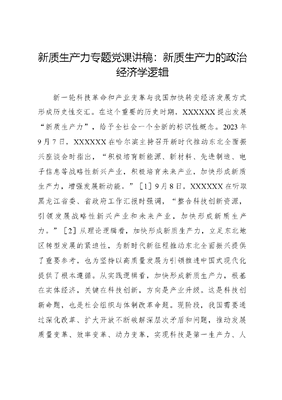 新质生产力专题党课讲稿:新质生产力的政治经济学逻辑新一轮科技革命和产业变革与我国加快转变经济发展方式形成历史性交汇。在这个重要的历史时期,XXXXXX提出发展新质生产力,给予全社会一个全新的标识性概念。2023年9月7日,XXXXXX在哈尔滨主持召开新时代推动东北全面振兴座谈会时指出,积极培育新能源、新材料、先进制造、电子信息等战略性新兴产业,积极培育未来产业,加快形成新质生产力,增强发展新动能。[1]9月8日,XXXXXX在听取黑龙江省委、省政府工作汇报时强调,整合科技创新资源,引领发展战略性新兴产业和未来产业,加快形成新质生产力。[2]从理论逻辑看,加快形成新质生产力,立足东北地区转型发展的紧迫性,为新时代新征程推动东北全面振兴提供了重要参考,也为坚持以高质量发展为引领推进中国式现代化提供了根本遵循。从实践逻辑看,加快形成新质生产力,根基在实体经济,关键在科技创新,方向是产业升级。这是科技创新命题,也是社会组织与体制改革命题。现阶段,我国需要通过深化改革、扩大开放不断破解深层次矛盾和问题,推动发展质量变革、效率变革、动力变革,实现科技是第一生产力、人才是第一资源、创新是第一动力,从而进一步解放和发展生产力。一、生产力的发展是社会发展的根本动力XXXXXX指出:坚持马克思主义,最重要的是坚持马克思主义基本原理和贯穿于其中的立场、观点、方法。这是马克思主义的精髓和活的灵魂。[3]基于构成要素的发展,生产力总是处在从量变到质变的能级演化当中。新质生产力是以科技创新为主导的生产力,实质上仍然属于马克思主义的生产力范畴。必须深入马克思主义政治经济学基本原理,考察生产力发展变化的基本规律,解蔽生产力发展是社会发展最终决定力量的本质要义,剖析生产力发展和生产关系变革的互动逻辑,进而寻找新时代发展新质生产力何以可能、发展新质生产力何以必要和发展新质生产力何以可为的体系化、系统化理论支撑。生产力概念是历史唯物主义最根本的理论基石。从本质上看,生产力概念的形成过程和历史唯物主义的发展历程具有一致性。马克思在《1844年经济学哲学手稿》中工资部分指出,分工提高劳动的生产力,增加社会的财富,促使社会精美完善。[4]123在私有财产的关系部分指出,土地所有者———无所事事的、只会碍事的粮食投机商———则抬文可居文库——海量学习资料,手机电脑均可下载www.wenkeju.com高人民最必须的生活资料的价格,从而迫使资本家提高工资而不能提高生产力。[4]175,176这两处所讲的生产力仅是泛指社会财富的生产能力。马克思在《评弗里德里希•李斯特的著作<政治经济学的国民体系>》一文中指出,资本主义工业可以分为资本主义的工业制度和工业违反自己意志而无意识地创造的生产力[5]两个方面。这是马克思从生产力和生产关系矛盾运动的角度对如何界定生产力内涵作出的初步探讨。在标志唯物史观诞生的《德意志意识形态》一书中,马克思恩格斯明确指出,在社会经济活动中,生产是双重关系的表现,一方面是自然关系,另一方面是社会关系。[4]532在此双重关系中,一定的生产方式或一定的工业阶段始终是与一定的共同活动方式或一定的社会阶段联系着的,而这种共同活动方式本身就是生产力。[4]532马克思恩格斯在《共产党宣言》中进一步分析了生产力与生产关系的矛盾运动,指出现代生产力反抗现代生产关系、反抗作为资产阶级及其统治的存在条件的所有制关系的历史。[6]37而要解决这个矛盾,关键就在于无产阶级的斗争,即无产阶级将利用自己的政治统治,一步一步地夺取资产阶级的全部资本,把一切生产工具集中在国家即组织成为统治阶级的无产阶级手里,并且尽可能快地增加生产力的总量。[6]52在《资本论》中,文可居文库——海量学习资料,手机电脑均可下载www.wenkeju.com马克思立足劳动二重性的视阈,将生产力作为生产关系的物质载体来研究,指出在物质资料生产活动中会形成两个方面的关系:一方面,是人类与自然界之间的关系,这表现为生产力;另一方面,是人与人、人与社会之间的关系,也就是指生产关系。生产力是在生产方式的统摄下和生产关系辩证统一的存在,并不是孤立的存在。生产力是由多要素构成、具有特定结构和功能的有机系统可以称为生产力系统。马克思在《资本论》中明确指出:劳动生产力是由多种情况决定的,其中包括:工人的平均熟练程度,科学的发展水平和它在工艺上应用的程度,生产过程的社会结合,生产资料的规模和效能,以及自然条件。[7]53可见,生产力系统是由劳动者、生产资料、科学技术知识和组织管理方式四大要素共同组合而成的有机整体。这些要素相互联系、相互作用又相互区别。这其中,劳动者是生产实践的主体,是生产力系统中最活跃的因素。生产资料是劳动者在生产实
