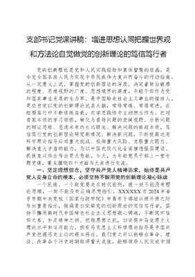 支部书记党课讲稿:增进思想认同把握世界观和方法论自觉做党的创新理论的笃信笃行者党的创新理论是党和人民实践经验和集体智慧的结晶,是全党全国各族人民为实现中华民族伟大复兴而奋斗的行动指南。从一定意义上说,掌握党的创新理论的深度,决定着政治敏感的程度、思维视野的广度、思想境界的高度。年轻干部作为党和国家事业发展的生力军,是中国特色社会主义事业的接班人,更应自觉以党的创新理论武装头脑,常修常炼、常悟常进,在细照笃行中不断修炼自我,在学思践悟中主动担当作为。把对看家本领的学习领悟,转化为看待问题的宏阔视野、分析问题的辩证思维、思虑未来的长远眼光、解决问题的高超本领,笃信笃行党的创新理论研究新情况、解决新问题,不断提高运用科学理论指导应对重大挑战、抵御重大风险、克服重大阻力、解决重大矛盾的能力,为以中国式现代化全面推进强国建设、民族复兴伟业作出更大贡献。今天,为年轻党员干部上一堂专题党课,重点围绕四个方面与大家进行交流。一、坚定理想信念,坚守共产党人精神追求,始终是共产党人安身立命的根本,必须坚持不懈用党的创新理论凝心铸魂一个民族、一个政党要走在时代前列,就一刻不能没有理论思维,一刻不能没有正确思想指引。XXXXXX在2024年春季学期中央党校(国家行政学院)中青年干部培训班开班之际作出重要指示,强调要自觉做党的创新理论的笃信笃行者,坚持不懈用新时代中国特色社会主义思想凝心铸魂,不断筑牢信仰之基、补足精神之钙、把稳思想之舵,切实提升马克思主义理论水平和运用能力。拥有马克思主义科学理论指导是中国共产党把握历史主动的根本所在。我们党之所以能够在革命、建设、改革各个历史时期取得重大成就,能够领导人民完成中国其他政治力量不可能完成的艰巨任务,根本在于掌握了马克思主义科学理论,并不断结合新的实际推进理论创新,使党掌握了强大的真理力量。党员干部加强理论学习,掌握看家本领,最根本、最紧要的就是深学细悟XXX新时代中国特色社会主义思想,深刻把握这一重要思想的科学体系、核心要义、实践要求,把学习成效转化为做好本职工作、推动事业发展的生动实践。(一)把握坚持不懈用XXX新时代中国特色社会主义思想凝心铸魂的理论逻辑。XXX新时代中国特色社会主义思想,是为新时代伟大变革所证明的科学理论。这一思想以全新的视野深化对共产党执政规律、社会主义建设规律、人类社会发展规律的认识,闪耀着辩证唯物主义和历史唯物主义的光辉。在当代中国,坚持和发展XXX新时代中国特色社会主义思想,就是真正坚持和发展马克思主义。新征程上,只有坚持不懈用XXX新时代中国特色社会主义思想凝心铸魂,才能准确把握中国式现代化的根本性质、牢牢锚定中国式现代化的奋斗目标、充分激发推进中国式现代化的强劲动力、广泛凝聚推进中国式现代化的磅礴力量,在中国式现代化道路上实现中华民族伟大复兴。只有坚持不懈用XXX新时代中国特色社会主义思想凝心铸魂,不断提高全党运用科学理论应对风险挑战的能力,才能以咬定青山不放松的顽强韧劲,发扬狭路相逢勇者胜的斗争精神,迎难而上,沉着应对,赢得优势、赢得主动、赢得未来。只有坚持不懈用XXX新时代中国特色社会主义思想凝心铸魂,在纷繁复杂的形势下把准团结奋斗的正确方向,不断增强以团结奋斗开辟美好未来的志气、骨气、底气,才能把人民群众最广泛地团结在党的周围、把方方面面的智慧和力量凝聚起来,汇聚万众一心、共克时艰的磅礴伟力,不断开创强国建设、民族复兴的新局面。只有坚持不懈用XXX新时代中国特色社会主义思想凝心铸魂,才能保证我们党在世界形势深刻变化的历史进程中始终走在时代前列,在应对国内外各种风险和考验的历文可居文库——海量学习资料,手机电脑均可下载www.wenkeju.com史进程中始终成为全国人民的主心骨,在坚持和发展中国特色社会主义的历史进程中始终成为坚强领导核心。(二)理解创新理论的前提是不断增进对党的创新理论的四个认同。增进政治认同。对党的创新理论的政治认同是指对XXX新时代中国特色社会主义思想的政治立场、政治方向、政治原则的认同,其主要表现是对人民立场的认同、对中国特色社会主义的认同、对中国共产党领导的认同。要深刻领悟两个确立的决定性意义,增强四个意识、坚定四个自信、做到两个维护,做到真心爱党、时刻忧党、坚定护党、全力兴党,坚持共产党人政治本色,不断提高党员干部的政治判断力、政治领悟力、政治执行力。增进思想认同。对党的创新理论的思想认同是指对XXX新时代中国特色社会主义思想的理论主题、重大意义的认同,其主要是认同中国特色社会主义理想信念、共产主义崇高信仰,认同这一思想指导下攻克了许多长期没有解决的难题,办成了许多事关长远的大事要事。加强党的创新理论的思想认同关乎意识形态的稳固、关乎党员同志的信念,关乎广大人民群众的正确认知和思想定力。要坚持马克