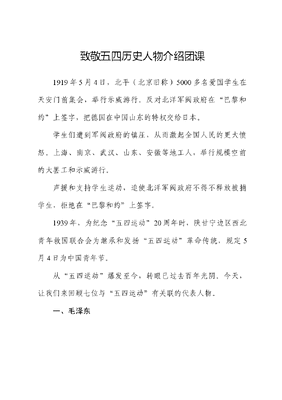 致敬五四历史人物介绍团课1919年5月4日,北平(北京旧称)5000多名爱国学生在天安门前集会,举行示威游行。反对北洋军阀政府在巴黎和约上签字,把德国在中国山东的特权交给日本。学生们遭到军阀政府的镇压,从而激起全国人民的更大愤怒。上海、南京、武汉、山东、安徽等地工人,举行规模空前的大罢工和示威游行。声援和支持学生运动,迫使北洋军阀政府不得不释放被捕学生,拒绝在巴黎和约上签字。1939年,为纪念五四运动20周年时,陕甘宁边区西北青年救国联合会为继承和发扬五四运动革命传统,规定5月4日为中国青年节。从五四运动爆发至今,转眼已过去百年光阴。今天,让我们来回顾七位与五四运动有关联的代表人物。一、毛泽东说起毛泽东,大家都清楚他是带领全中国人民翻身做主的伟大领袖,更是世界上公认的一代伟人。很多人都以为五四运动与毛泽东并没有关系,其实不然。五四运动虽然是以北京的爱国学生为主要发起、参与者,但最终演变成了一场全国范围内的反帝、反封建的运动。青年毛泽东是湖南地区五四运动实际上的发动者和主要领导人。且在1939年,陕甘宁边区的西北青年救国联合会决定将每年5月4日定为五四青年节时,毛泽东就曾亲自出席大会,发表了《关于中国青年运动政治方向》的讲话。从这点上看,毛泽东主席不仅与五四运动有关联,而且与五四青年节也有直接的联系。在五四运动之前,毛泽东离开韶山老家,前往湖南省立第一师范求学,当时他的身边已经聚集了一大批满腔热血的爱国青年。1918年4月,毛泽东与蔡和森等人组建了新民学会。新民学会在湖南全省发动组织大批青年前往法国勤工俭学,这段时间,毛泽东前往北京见到了一些新文化运动的著名学者。文可居文库——海量学习资料,手机电脑均可下载www.wenkeju.com他多次聆听李大钊先生的演讲,阅读了李大钊先生的大量文章,对自己的思想变化产生了重要影响。毛泽东的抱负和才干,也得到李大钊的赞赏,他认为毛泽东是湖南学生青年的杰出领袖。五四运动爆发之际,由于湖南反动军阀张敬尧封锁消息,直到1919年5月9日,长沙《大公报》才报道了北京学生的爱国运动。毛泽东闻讯立即召集新民学会的成员何叔衡、周世钊等人积极响应北京的五四运动。5月14日,毛泽东参与省教育会、各干事、各校校长联席会议致电北京政府,要求罢免卖国贼曹汝霖、陆宗舆。至6月3日,长沙的20所高校学生统一罢课,向北洋政府提出了拒绝巴黎和约,废除一切不平等条约的6项要求。毛泽东一直站在五四运动的前哨,成为湖南地区五四运动的组织者和领导者。通过五四运动的洗礼,青年毛泽东完成了从一个爱国主义者到马克思主义者的蜕变。文可居文库——海量学习资料,手机电脑均可下载www.wenkeju.com此后,毛泽东对五四运动做出了科学评价,指引了青年运动的正确方向。因此,五四运动不仅对全中国各族人民有着深刻影响同时也对青年毛泽东产生了意义深远的重要影响。二、陈独秀陈独秀先生是我党早期的领导者、组建者,通过电视剧《觉醒年代》,相信大家对陈独秀的真实形象有了一个新的认识。在1919年五四运动爆发的前后,陈独秀提出了许多真知灼见,其中虽不乏极端言论,但也表明陈独秀充满书生意气的革命者思想。作为五四运动的发起与组织者,陈独秀曾提出:科学与民主是人类社会进步的两大主要动力,青年朋友们一定要发愤图强,既废除封建糟粕,摒弃一切不合理,同时也要向前看。文可居文库——海量学习资料,手机电脑均可下载www.wenkeju.com他与毛泽东属于亦师亦友的关系,在居住上海期间,陈独秀曾经与青年毛泽东有过数次长谈,甚至还是毛泽东参加革命的引路人,这一点也是同样毋庸置疑的。三、李大钊同样是电视剧《觉醒年代》,让年轻的朋友们记住了留着两撇胡子,为人正直的守常先生。李大钊与陈独秀同为五四运动的发起、组织者,李大钊先生对言论自由的看法是五四运动精神的重要表现。他是学识渊博,勇于开拓的著名学者,在中国共产主义运动和民族解放事业中占有崇高的历史地位。此外,在李大钊看来,五四运动与俄国十月革命一样是具有历史意义的大事。五四运动不仅是争取民族独立和解放的运动,同样也是中国学生用直接行动向世界传达反抗强权的举动,更是知识分子与普通民众相结合的大联合运动。李大钊先生也不止一次说过:青年知识分子应该将这种联合精神坚持下去,并积极投身民族解放事业。文可居文库——海量学习资料,手机电脑均可下载www.wenkeju.com四、瞿秋白瞿秋白是五四运动中的骨干,1919年5月4日,瞿秋白率领俄文专修馆的同学参加了天安门示威游行和火烧赵家楼的壮举。第二天,为营救被捕的30多名学生,他领导同学参加了北京各专门以上学校实行的总罢课运动。19