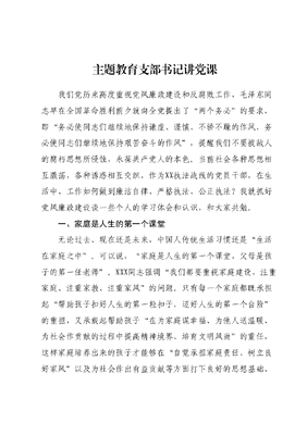 主题教育支部书记讲党课我们党历来高度重视党风廉政建设和反腐败工作,毛泽东同志早在全国革命胜利前夕就向全党提出了两个务必的要求,即务必使同志们继续地保持谦虚、谨慎、不骄不躁的作风,务必使同志们继续地保持艰苦奋斗的作风,提醒我们不要被敌人的腐朽思想所侵蚀,永葆共产党人的本色。当前社会各种思想相互激荡,各种诱惑相互交织,作为XX执法战线的党员干部,在生活中、工作如何做到廉洁自律、严格执法、公正执法?我就抓好党风廉政建设谈一些个人的学习体会和认识,和大家共勉。一、家庭是人生的第一个课堂无论过去、现在还是未来,中国人传统生活习惯还是生活在家庭之中。可以说,家庭是人生的第一个课堂,父母是孩子的第一任老师。XXX同志强调我们都要重视家庭建设,注重家庭、注重家教、注重家风的问题。只有每一个家庭都既承担起帮助孩子扣好人生的第一粒扣子,迈好人生的第一个台阶的重担,又承载起帮助孩子在为家庭谋幸福、为他人送温暖、为社会作贡献的过程中提高精神境界、培育文明风尚的重任,这样家庭培养出来的孩子才能够在自觉承担家庭责任、树立良好家风以及为社会作出有益贡献等方面打下良好的思想基础、品德基础和人格基础。XX执法工作性质决定了我们的工作要经常出差在外,工作再忙也要千方百计照顾好家庭,特别是孩子。亲情因素对党员干部廉洁从政的行为影响不可忽视,但亲情再深亦应有度,家庭利益、亲人利益再高,也决不能超越法律和道德的范畴。特别是作为从事行政执法工作的党员干部必须树立正确的亲情观,把握好亲情与原则的关系,对自己的配偶、子女及其他亲属要加强教育,使他们树立普通人的心态和作风,不揩公家的油,不耍特权,不沾自己的光。要管好他们的手、嘴和腿防止他们打着自己的旗号或利用自己的影响谋私利。个别党员干部重个人感情,重朋友关系,重江湖义气,在他们眼里,原则要服从义气,这是不对的思想。党员干部在对自己的同事和朋友关心的同时,也要清楚其缺点和不足,不因私情乱公事,不以义气犯原则,不受关系所左右,坚持严格公正文明执法,坚守法纪道德底线。党员干部一定要处理好组织之恩、人民之恩和私恩的关系,把握好公与私、情与理的尺度,把党的培养和人民群众的信任,变成奉献党和人民事业的实际行动。要忠心耿耿、任劳任怨地为XXXX执法事业发展努力奋斗。要脚踏实地,履职尽责,对违法违规用地用矿行为,该制止的制止,该查处的查处,该拆除的拆除,该移送的移送,让违法者受到应有的惩罚维护XX法律法规的尊严。二、家风是社会风气的重要组成部分XXX同志指出:蜕化变质往往就是从生活作风不检点、生活情趣不健康开始的,往往都是从吃喝玩乐这些看似小事的地方起步的。如果一个人在生活作风上不检点、不正派,在道德情操上打开了缺口,出现了滑坡,那就很难对社会风气起到正面引导和促进作用。家风好,就能家道兴盛、和顺美满;家风差,难免殃及子孙、贻害社会,正所谓积善之家,必有余庆积不善之家,必有余殃。小事小节是党员干部个人品德的反映,也是党员干部队伍作风建设的一面镜子。一个在小事小节上过不了关的党员干部,也很难在大事大节上过得硬。从事XX执法工作的党员干部在任何时候都要保持头脑冷静,特别是在XX执法现场,更要小心谨慎,时刻做到慎思、慎微、慎言、慎始,习惯在放大镜和聚光灯下工作。有个寓言说,有个偷针者和偷牛者一起被游街,偷针者感到委屈,发牢骚说:我只偷了一根针,为什么和盗牛贼一起游街,太不公平了!盗牛者对他说:别说了,我走到这一步也是从偷针开始的。这个故事告诉我们,任何事物都是由小变大,由量变到质变的。一个人不可能一夜之间成为不廉洁分子,其走向腐化堕落大多是从不注意小事小节开始的。党员干部只有树立终身学习的观念,把学习当成一种政治责任,当成一种人生修养,当成一种自觉追求,多一些学习思考,多一些调查研究,不因条件变好、地位升高、权力增大、事务繁杂而疏懒学习、放弃学习,才能不断夯实廉政思想和执法业务基础。当前很多党员干部堕落为不廉洁分子,一个根本的原因就是放松学习,搞学习上的形式主义,把学习当成软任务。XX相关法律法规和政策规定变化很快,不学习甚至不及时学习,就会在执法工作中出现问题。三、家风是一个家庭的精神内核XXX同志指出:孩子们从牙牙学语起就开始接受家教,有什么样的家教,就有什么样的人。中国古代流传下来的孟母三迁岳母刺字、画荻教子讲的就是这样的故事。他还以个人为例来说明家教对于自己成长的影响。在他看来,在一个家庭或者家族里面,只要家庭成员或者家族成员能够长期按照家训、家规、家教发语行事,那么,久而久之,这个家庭或者家族就会形成一种独具特色的家风。这样的家风既是一个家庭的精神内核,也是一个社会的价值缩影。它用之于家庭,不仅使其家庭成员的身心健康得以顺利地成长,而且也使家庭之中的孩