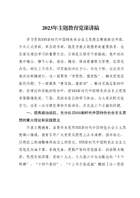 2023年主题教育党课讲稿学习贯彻XXX新时代中国特色社会主义思想主题教育读书班,今天正式开班。举办读书班,既是开展主题教育的重要抓手,也是深化理论学习的重要方法,目的是从领导干部做起,集中时间集中精力,静下心来,通读、精读、研读原著原文原理,在深化内化、转化上下功夫,切实做到内化于心、外化于形。这次读书班共分两期进行,这一期聚焦学思想、强党性,解决思想层面的问题;下一期聚焦重实践、建新功,解决实践层面的问题,在理论和实践的结合中,把XXX新时代中国特色社会主义思想学深悟透做实。下面,我结合自己的学习体会,与大家共同交流学习,也是一次专题党课和开班动员,共交流三个方面的问题。一、提高政治站位,充分认识XXX新时代中国特色社会主义思想的重大理论和实践意义开展主题教育,首要任务是用XXX新时代中国特色社会主义思想凝心铸魂,教育引导广大党员从思想上正本清源、固本培元,以理论上的清醒确保政治上的坚定。XXX新时代中国特色社会主义思想是内涵丰富、系统完备、逻辑严密的思想体系,内容博大精深、思想系统深邃,党的十九大、十九届六中全会提出的十个明确、十四个坚持、十三个方面成就概括了这一思想的主要内容。真学真懂、学好用好XXX新时代中国特色社会主义思想,要从充分认识重大理论和实践意义入手,领会好、把握好这一思想的世界观和方法论,运用好、坚持好根本政治立场、科学的思想方法。党的XX大报告把XXX新时代中国特色社会主义思想的世界观和方法论概括为六个坚持,即必须坚持人民至上,坚持自信自立,坚持守正创新,坚持问题导向,坚持系统观念,坚持胸怀天下,这是XXX新时代中国特色社会主义思想活的灵魂,集中体现了这一思想的重大理论和实践意义。(一)坚持人民至上是对马克思主义政党政治属性和政治功能理论的丰富发展。人民性是马克思主义的本质属性。马克思、恩格斯在《共产党宣言》中指出:过去的一切运动都是少数人的或者为少数人谋利益的运动。无产阶级的运动是绝大多数人的为绝大多数人谋利益的独立的运动。这样的政治观区别于一切旧式的政治观。马克思主义植根人民之中,指明了依靠人民推动历史前进的人间正道。XXX新时代中国特色社会主义思想开宗明义坚持人民至上,进一步彰显了我们党始终同人民同呼吸、共命运心连心的赤子之心,对充分发挥亿万人民的创造伟力、形成同心共圆中国梦的强大合力具有重大而深远的意义。(二)坚持自信自立是对马克思主义理论自信精神的丰富发展。马克思在创立、发展、传播和实践真理的过程中展现出强烈的理论自信,坚信他毕生所从事事业的正义性、思想的科学性、目标的伟大性。XXX新时代中国特色社会主义思想有着自信自立的鲜明特质,彰显对马克思主义的坚定信仰、对中国特色社会主义的坚定信念,充满着豪迈的历史担当和创造精神。这种自信自立的鲜明特质,激励着广大党员干部群众斗志昂扬地为全面建设社会主义现代化国家、全面推进中华民族伟大复兴而团结奋斗。(三)坚持守正创新是对马克思主义认识论和唯物辩证法的丰富发展。守正与创新相辅相成,守正是创新的前提和基础,创新是守正的目的和路径,这深刻彰显了变与不变、继承与发展、原则性与灵活性的辩证统一。党的十八大以来,以XXX同志为核心的党中央在立场、方向、原则、道路等根本性问题上旗帜鲜明、毫不含糊,坚持马克思主义基本原理不动摇,坚持党的全面领导不动摇,坚持中国特色社会主义不动摇,确保了党不变质、不变色、不变味。同时,面对快速变化的世界和中国,我们党坚持解放思想,坚持立破并举,持续创马克思主义中国化时代化之新,创新时代中国特色社会主义之新,以原创性理论贡献标注了马克思主义发展的新高度,实现了马克思主义中国化时代化新的飞跃。(四)坚持问题导向是对马克思主义问题导向思维方法的丰富发展。马克思指出:问题就是公开的、无畏的、左右一切个人的时代声音。问题就是时代的口号,是它表现自己精神状态的最实际的呼声。马克思主义的一个鲜明特点是自始至终贯穿着强烈的问题意识,致力于提出新问题并寻求科学的答案。XXX新时代中国特色社会主义思想聚焦实践遇到的新问题、改革发展稳定存在的深层次问题、人民群众急难愁盼问题、国际变局中的重大问题、党的建设面临的突出问题,不断提出真正解决问题的新理念新思路新办法,推动党和国家事业取得历史性成就、发生历史性变革。(五)坚持系统观念是对马克思主义系统观的丰富发展。唯物辩证法认为,事物是普遍联系的,事物内部各要素是相互影响相互制约的,整个世界是相互联系的统一整体,也是相互作用的系统。XXXXXX指出:要善于通过历史看现实、透过现象看本质把握好全局和局部、当前和长远、宏观和微观、主要矛盾和次要矛盾、特殊和一般的关系,不断提高战略思维、历史思维、辩证思维、系统思维、创新思维、法治思维、底线思维能力。XXX新时代中国特色