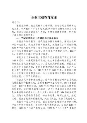企业主题教育党课同志们:根据总局第二批主题教育工作部署,结合公司主题教育实施方案,今天我以学习贯彻XXX新时代中国特色社会主义思想,推动公司高质量发展为题,讲授主题教育党课,和大家谈谈我的认识和感悟。一、了解党的历史上开展的历次集中教育开展党内集中教育,是我们党加强自身建设、推进自我革命的一大法宝。党内集中教育的历史,就是党在各个历史阶段,围绕为中国人民谋幸福、为中华民族谋复兴的初心使命,和围绕不同历史时期的中心工作,而开展集中教育的历史。102年来,我们党共开展过17次集中教育。新民主主义革命时期,中国共产党主要开展了两次党内集中教育活动。一是延安整风运动,使实事求是的马克思主义思想路线在全党范围内深入人心,为抗日战争的胜利、新民主主义革命在全国的胜利,奠定了重要的思想政治基础。二是三查三整整党运动,从1947年9月至1949年春,各解放区结合土地改革进行了整党运动,为土地改革顺利开展和解放战争全面胜利,打下了良好基础。社会主义革命和建设时期,党内集中教育活动的主要做法,依然是整风和整党运动,主要有1950年整风运动,1951年整党运动,1957年整风运动,1963年到1966年的社会主义教育运动和整党。如1950年的整风运动,是为了克服以功臣自居的骄傲自满情绪和官僚主义、命令主义;1951年至1954年的整党运动,则是对党员进行了登记、审查和处理。这两次整风、整党运动,提高了党员的思想觉悟,纯洁了队伍,改善了党的作风。党的十一届三中全会后,面对出现的各种新矛盾和新问题,中国共产党持续开展了多次党内集中教育活动,分别是1983年整党、1999年三讲教育活动、2000年三个代表重要思想学习教育活动、2004年保持共产党员先进性教育活动、2008年学习实践科学发展观活动、2010年创先争优活动。从1983年到1987年的整党进一步弘扬了党的实事求是的思想路线,为新时期经济社会发展和改革开放奠定了坚实的思想和组织基础。此后开展的几次党内集中教育活动,皆着眼于加强和改进党的自身建设,不断用马克思主义理论武装全党,取得了良好成效。党的十八大以来,以XXX同志为核心的党中央全面推进新时代党的建设新的伟大工程,持续开展了多次党内集中教育。2013年开展了以为民务实清廉为主要内容的党的群众路线教育实践活动,2015年开展了严以修身、严以用权、严以律己,谋事要实、创业要实、做人要实为主要内容的三严三实专题教育,2016年开展了以学党章党规、学系列讲话,做合格党员为主要内容的学习教育活动,2019年开展了以守初心、担使命,找差距、抓落实为总要求的不忘初心、牢记使命主题教育,2021年开展了以学史明理、学史增信、学史崇德、学史力行为总要求和目标任务的党史学习教育。总的来说,这一阶段党内集中教育顺应时代要求,传承历史,因应现实,一以贯之体现了党要管党、从严治党的恒心和决心,使全党经历了深刻的思想淬炼、政治锻炼、党性锤炼和实践历练,全党在思想上更加统一、在政治上更加团结、在作风上更加务实、在行动上更加一致,我们党把方向、谋大局、定政策、促改革的能力不断提高,总揽全局、协调各方的领导核心作用充分发挥,有效推动了党和国家事业健康发展。以上是我们党成立以来,在不同历史时期开展的17次党内集中教育情况回顾,目的是要搞清楚为什么要开展党内集中教育,有什么重大意义,希望取得什么样的效果,我们该怎么做等等。二、深刻认识开展本次主题教育的重大意义XXXXXX在3月30日举行的二十届中共中央政治局第四次集体学习时强调:新时代新征程,面对错综复杂的国际国内形势、艰巨繁重的改革发展稳定任务、各种不确定难预料的风险挑战,要实现党的XX大确定的战略目标,迫切需要广大党员、干部特别是各级领导干部进一步深入学习贯彻新时代中国特色社会主义思想。为什么要学习贯彻XXX新时代中国特色社会主义思想?因为它是写入中国共产党章程和中华人民共和国宪法的全党全国的指导思想。正是在此背景下,党中央决定在全党开展学习贯彻XXX新时代中国特色社会主义思想主题教育。XXXXXX对主题教育高度重视,亲自谋划部署、全程指导推动,在4月3日召开的学习贯彻XXX新时代中国特色社会主义思想主题教育工作会议上,XXXXXX亲身示范开讲第一课,明确提出主题教育的总要求和目标任务,对主题教育各项工作作出全面部署。(一)开展主题教育是用XXX新时代中国特色社会主义思想凝心铸魂,铸牢团结奋斗之基的战略安排XXX新时代中国特色社会主义思想是当代中国马克思主义、二十一世纪马克思主义,是中华文化和中国精神的时代精华,是党和人民实践经验和集体智慧的结晶,是中国特色社会主义理论体系的重要组成部分,是全党全国各族人民为实现中华民族伟大复兴而奋斗的行动指南,必须长期坚持并不断发展。这次