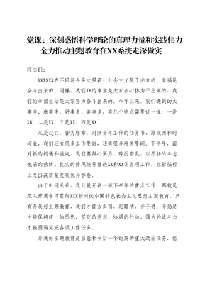 党课:深刻感悟科学理论的真理力量和实践伟力全力推动主题教育在XX系统走深做实同志们:XXXXXX在不同场合多次强调:社会主义是干出来的,幸福是奋斗出来的。同样,我们XX的事业是大家齐心协力干出来的,我们的幸福生活是大家努力奋斗出来的。今年以来,我们遇到的大事多、难事多,好事多、喜事多,有几个亮点需要说一说:一是XX。二是XX,三是XX。四是XX。凡是过往,皆为序章。对照全年工作的任务书、路线图和时间表,我们还有很多工作要做,还有很多难关要闯。下半年,面对新的机遇和挑战,我们要凝心聚力、踔厉奋发,以昂扬的斗志饱满的热情、扎实的作风统筹推进XX和XX等各项工作,在新征程上交出高质量发展优异答卷。由于时间关系,我只展开讲一项下半年的重点工作,那就是深入开展学习贯彻XXX新时代中国特色社会主义思想主题教育。只有开展好主题教育,我们才能方向明、思路清,步子稳、干劲足才能保持统一的思想、坚定的意志、协调的行动、强大的战斗力才能圆满完成各项工作任务。开展好主题教育是当前和今后一个时期的重大政治任务,结合近期深入学习和思考,我谈一下心得体会。一、为什么要开展主题教育党的理论创新每前进一步,理论武装就要跟进一步。这次主题教育,是贯彻党的XX大精神的重大举措,也是一件事关全局的大事,XXXXXX用三个必然要求深刻阐述开展这次主题教育的重大意义:是统一全党思想意志行动始终保持党的强大凝聚力、战斗力的必然要求,是推动全党积极担当作为、不断开创事业发展新局面的必然要求,是深入推进全面从严治党、以党的自我革命引领社会革命的必然要求。这次主题教育,对于统一全党思想、解决党内存在的突出问题、始终保持党同人民群众血肉联系、推动党和国家事业发展,具有重要意义。第一,开展主题教育是凝心铸魂的战略安排。思想建设是党的基础性建设,思想建党、理论强党是百年大党永葆生机活力的关键所在。XXXXXX深刻指出,党的历次集中教育活动,都以思想教育打头,着力解决学习不深入、思想不统一、行动跟不上的问题。党的十八大以来,党中央把学习贯彻XXX新时代中国特色社会主义思想作为党的思想建设的根本任务,层层推进开展了五次党内集中教育,为加强党的建设、推动全面从严治党向纵深发展作出了重要贡献,解决了许多新时代所面临的重大理论和现实问题开展这次主题教育,就是要把XXX新时代中国特色社会主义思想进一步转化为坚定理想、锤炼党性和指导实践、推动工作的强大力量,增强学思践悟的政治智慧,筑牢拒腐防变的堤坝防线,从而更有定力、更有自信、更有智慧地在中国式现代化道路上坚定不移走下去。第二,开展主题教育是推进中国式现代化的重大举措。党的XX大科学擘画了全面建设社会主义现代化国家、以中国式现代化全面推进中华民族伟大复兴的宏伟蓝图。XXXXXX强调,党的XX大在政治上、理论上、实践上取得了一系列重大成果,就新时代新征程党和国家事业发展制定了大政方针和战略部署,是我们党团结带领人民全面建设社会主义现代化国家、全面推进中华民族伟大复兴的政治宣言和行动纲领。在全面贯彻落实党的XX大精神的开局之年,开展学习贯彻XXX新时代中国特色社会主义思想主题教育,就是要以此为契机,引导广大党员干部全面把握中国式现代化中国特色、本质要求、两步走战略性安排和重要原则,紧紧围绕高质量发展这个全面建设社会主义现代化国家的首要任务,以强化理论学习指导实践,以深化调查研究推动发展,把学习、调研、整改内嵌到完成党的XX大部署的各项任务中去,以推动高质量发展的新成效检验主题教育成果。第三,开展主题教育是推进自我革命的迫切需要。党的十八大以来,党中央从政治、思想、组织、作风、纪律和反腐倡廉各方面加强党的建设,全面从严治党取得不平凡成就反腐败斗争取得压倒性优势,政治生态根本好转,得到了人民群众的衷心拥护和普遍赞誉,充分体现了管党治党的战略清醒、战略自觉、战略自信。XXXXXX指出,我们党作为世界上最大的马克思主义执政党,要始终赢得人民拥护、巩固长期执政地位,必须时刻保持解决大党独有难题的清醒和坚定。开展主题教育,就是要深入推进新时代党的建设新的伟大工程,持续锻造对党忠诚、担当有为的过硬队伍,持续营造风清气正、团结奋进的政治生态,将党的建设与企业经营改革发展融合统一起来,将党的作用发挥到企业基层一线各个方面,切实以高质量党建引领保障企业高质量发展。二、这次主题教育有哪些要求这次主题教育的总要求是学思想、强党性、重实践、建新功,体现了我们党认识与实践相结合、理论与实际相联系、改造主观世界与改造客观世界相统一的一贯要求,是一个紧密联系相互贯通、内在统一的整体。全局上下要深刻理解、牢牢把握主题教育的总要求,将其贯彻落实到主题教育全过程,以高度的政治自觉、饱满的政治热情、严肃的政治态度,推动主题教育扎实开展。第一,学思想是出发点,坚定理想