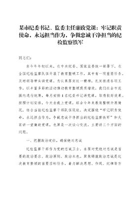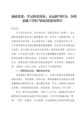 廉政党课:牢记职责使命,永远担当作为,争做忠诚干净担当的纪检监察铁军同志们:自今年年初以来,在中央纪委、国家监委统一部署下,在全国纪检监察队伍开展了教育整顿工作,其中有一项重要任务,及时领导带头讲党课。为认真落实这一精神,扎实推进各项工作,以丰富多彩的活动推动教育整顿提质增效,我们在全市范围内进行统筹,每月安排1名纪委书记讲党课,取得较好效果。按照计划安排,今天由我上党课,综合今年来教育整顿开展情况,结合当前纪检监察干部队伍现状,决定围绕牢记职责使命,永远担当作为,争做忠诚干净担当的纪检监察铁军和大家讲一堂廉政党课,也算是一次谈心交流。主要讲三个方面的问题。一、把握政治定位,确保绝对忠诚纪检监察干部作为党的忠诚卫士,永葆对党绝对忠诚是首要的政治要求、政治原则、政治本色。聚焦铸就政治忠诚是这次教育整顿的首要目标任务,着力解决思想、作风、纪律等方面的突出问题,切实做到纯洁思想,纯洁组织,坚决防治灯下黑。首先,要牢记政治嘱托。党的十八大以来,XXXXXX多次发表重要讲话谈到纪检监察干部队伍建设,字字句句都蕴含着更高更严的要求。突出强调,纪检监察机关是党和国家监督专责机关,要忠诚于党、忠于人民,带头增强四个意识、坚定四个自信、做到两个维护;鲜明指出,纪检监察机关要带头加强党的政治建设,继承对党绝对忠诚的光荣传统,做忠诚干净担当、敢于善于斗争的战士;特别是在二十届中央纪委二次全会重要讲话中重点指出,要结合即将在全党开展的主题教育把纯洁思想、纯洁组织作为突出问题来抓,切实加强政治教育、党性教育,严明法纪,坚决清除害群之马,以铁的纪律打造忠诚干净担当的铁军。这一系列重要论述为纪检监察机关加强政治建设指明方向、提供遵循。开展教育整顿是XXXXXX亲自点题、亲自部署的一项重大政治任务,是纪检监察机关做到打铁必须自身硬的务实有效举措。纪检监察机关是党的纪律部队,对党绝对忠诚,是纪检监察机关与生俱来的政治基因,纪检监察机关从产生之日起,就担负维护党中央权威和集中统一领导的重大使命。纪检监察干部是党的忠诚卫士,打铁必须自身硬,做到自身硬,就必须在政治、作风、能力、纪律上做到四个过硬。其次,要强化政治学习。政治上的坚定,源于理论上的清醒党的XX大后,各级纪检监察机关把学习贯彻党的XX大精神与学懂弄通做实XXX新时代中国特色社会主义思想结合起来,与纪检监察工作结合起来,切实把XXX新时代中国特色社会主义思想作为新时代纪检监察工作的根本遵循,教育引导纪检监察干部忠诚于以XXX同志为核心的党中央,忠诚于新时代中国特色社会主义事业。要深入抓好理论武装,坚持不懈用XXX新时代中国特色社会主义思想凝心铸魂,跟进学习XXXXXX最新重要讲话和重要指示批示精神,深入开展读原著、学原文、悟原理,不断坚定理想信念,带头拥戴核心、信赖核心、忠诚核心、维护核心,切实把对两个确立决定性意义的深刻领悟转化为两个维护的自觉行动。要着力提高政治能力,全面从严治党首先要从政治上看,不断提高政治判断力、政治领悟力、政治执行力。每一名纪检监察干部都要在进一步学懂弄通做实XXX新时代中国特色社会主义思想中不断提高政治站位,始终心怀国之大者,找准找实服务保障新时代新征程党的使命任务的切入点和着力点,确保党中央重大决策部署落地见效;要把对党绝对忠诚作为工作的首要政治原则、个人的首要政治品质,坚决做到党中央提倡的坚决响应,党中央决定的坚决照办,党中央禁止的坚决不做。要严守政治纪律政治规矩,XXXXXX明确要求纪检监察机关更好履行党章赋予的职责强调必须带头尊崇党章,严肃查处违反党章党规党纪的行为,做党章的坚定执行者和忠实捍卫者。各级要把学习、尊崇、维护党章作为党的政治建设重点,特别是加强对遵守党章、执行党纪情况的监督检查,把党章权威树起来,坚决同危害党中央权威和集中统一领导的言行作斗争,推动各级党组织和党员干部与党中央同心同德,真心爱党、时刻忧党、坚定护党、全力兴党。再次,要加强政治建设。要突出政治标准加强纪检监察干部队伍建设,强化政治引领和政治担当,做党中央决策部署的坚定执行者、推动者、实践者,以实际行动肩负起两个维护的政治责任。要持续加强纪委常委会自身建设,坚持和完善纪委常委会第一议题、理论学习中心组集体学习制度,认真贯彻民主集中制,严格落实常委会议事规则和决策程序。要突出政治标准加强纪检监察干部队伍建设,树立注重实干实绩的选人用人导向常态化做好干部选拔任用和职级晋升,统筹系统内外干部交流,推动多岗位锻炼、全方位发展。要坚持系统施治,教育进到纪检监察干部在自身正自身硬自身廉上走在前做表率,永葆自我革命精神,把一体推进三不腐的理念贯穿自身建设,扛牢全面从严治党主体责任,从严教育管理监督干部,引导树立正确权力观政绩观、事业观,坚决防