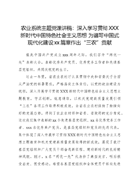 农业系统主题党课讲稿:深入学习贯彻XXX新时代中国特色社会主义思想 为谱写中国式现代化建设xx篇章作出三农贡献值此中国共产党成立xxx周年之际,我们召开两优一先表彰大会,表彰优秀共产党员、优秀党务工作者和先进基层党组织,共同庆祝党的生日。过去一年里,省农业农村厅认真贯彻中央和省委关于全面从严治党的部署要求,严格落实主体责任,以党的政治建设为统领,深入开展学习贯彻XXX新时代中国特色社会主义思想主题教育,守正创新,锐意进取,以机关党建高质量发展引领三农各项工作取得积极成效,全省农业农村保持了持续向好的发展态势,得到了农业农村部和省委、省政府的充分肯定。这次我们集中表彰的xx个先进基层党组织、xx名优秀党务工作者、xxx名优秀共产党员,是基层党组织和党员的先进代表,集中体现了深入开展学习贯彻XXX新时代中国特色社会主义思想主题教育和机关党建高质量发展取得的新成效,展现了我厅基层党组织和广大党员干部奋进新征程、建功新时代的良好精神风貌。刚才,x名两优一先代表作了典型发言,听后很受启发、很受感动。希望各基层党组织和全体党员干部向先进典型学习,学习他们以党建为引领推动中心工作增比进位的经验做法,学习他们不忘初心使命、立足本职真抓实干的可贵精神,学习他们忠诚于党和人民、甘于担当奉献的优秀品质,为全省三农事业发展作出新的更大贡献。在此,我代表厅党组向受到表彰的先进集体和先进个人表示诚挚的祝贺!向全体党员致以节日的问候!在全党深入开展学习贯彻XXX新时代中国特色社会主义思想主题教育,是贯彻落实党的XX大精神的重大举措,对于统一全党思想、解决党内存在的突出问题、始终保持党同人民群众血肉联系、推动党和国家事业发展,具有重要意义。几个月来,逐篇逐字学习了主题教育规定书目,特别是反复学习XXXXXX视察xx时重要讲话精神,通过读原著、学原文、悟原理,结合个人思想和工作实际进行深入思考,更加深化了对XXX新时代中国特色社会主义思想的世界观、方法论和贯穿其中的立场观点方法的理解把握,进一步夯实了忠诚捍卫两个确立、坚决做到两个维护的思想根基;更加深刻认识到开展学习贯彻XXX新时代中国特色社会主义思想主题教育的重大政治意义、理论意义、实践意义、引领意义,进一步坚定了用XXX新时代中国特色社会主义思想武装头脑、指导实践、推动工作的思想自觉、政治自觉、行动自觉;更加深切的感受到,三农工作面临一系列新形势、新任务、新挑战,全省农业农村系统必须以XXXXXX关于三农工作的重要论述为指导,明确思路方向、发展路径、工作举措,加快建设农业强省,全面推进农业农村现代化。下面,我围绕深入学习贯彻XXX新时代中国特色社会主义思想、为谱写中国式现代化建设xx篇章作出三农贡献,谈一些认识和体会,与大家交流。一、深入学习贯彻XXX新时代中国特色社会主义思想,进一步增强谱写中国式现代化建设xx篇章的责任感使命感XXX新时代中国特色社会主义思想是一个逻辑严密、内涵丰富、系统全面、博大精深的科学体系,是当代中国马克思主义、二十一世纪马克思主义,是中华文化和中国精神的时代精华,是强国建设、民族复兴的理论指引和行动指南。概括提出并深入阐述中国式现代化理论,是党的XX大的一个重大理论创新,是科学社会主义的最新重大成果。中国式现代化是XXX新时代中国特色社会主义思想的重要组成部分,是经济、政治、文化、社会、生态文明五位一体的全面现代化,对建设什么样的社会主义现代化强国、怎样建设社会主义现代化强国这一重大时代课题的集中回答,以全新视野深化了对社会主义建设规律的认识。在全面建设社会主义现代化国家、全面推进中华民族伟大复兴的新征程中,深入学习贯彻XXX新时代中国特色社会主义思想,就要深刻把握中国式现代化蕴含的理论逻辑、历史逻辑、实践逻辑,以高度统一的思想和行动朝着中国式现代化的方向奋勇前进。(一)深入学习领会中国式现代化的理论体系,深刻认识中国式现代化是强国建设、民族复兴的唯一正确道路。实现中华民族伟大复兴是近代以来中国人民的共同梦想,无数仁人志士为此苦苦求索、进行各种尝试,但都以失败告终。中国共产党自成立之日起,就担负起探索中国现代化道路的重任。我们党团结带领人民历经新民主主义革命时期、社会主义革命和建设时期、改革开放和社会主义建设新时期,逐步为中国式现代化提供了充满新的活力的体制保证和快速发展的物质条件。党的十八大以来,我们党在已有基础上继续前进,不断实现理论和实践上的创新突破,创立了XXX新时代中国特色社会主义思想,实现了马克思主义中国化时代化新的飞跃,为中国式现代化提供了根本遵循。我们进一步深化对中国式现代化的内涵和本质的认识,党的XX大概括形成中国式现代化的中国特色、本质要求和重大原则,初步构建中国式现代化的理论体系,明确指出中国式现代化既有各国现代