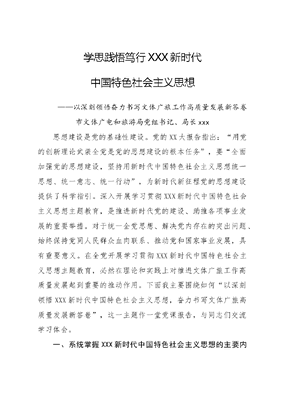 学思践悟笃行XXX新时代中国特色社会主义思想——以深刻领悟奋力书写文体广旅工作高质量发展新答卷市文体广电和旅游局党组书记、局长xxx思想建设是党的基础性建设。党的XX大报告指出:用党的创新理论武装全党是党的思想建设的根本任务,要全面加强党的思想建设,坚持用新时代中国特色社会主义思想统一思想、统一意志、统一行动,为新时代新征程党的思想建设提供了科学指引。深入开展学习贯彻XXX新时代中国特色社会主义思想主题教育,是推进新时代党的建设、助推各项事业发展的重要举措。对于统一全党思想、解决党内存在的突出问题、始终保持党同人民群众血肉联系、推动党和国家事业发展,具有重要意义。在全党开展学习贯彻XXX新时代中国特色社会主义思想主题教育,必然在理论和实践上对推进文体广旅工作高质量发展起到重要的推动作用。下面我主要围绕如何以深刻领悟XXX新时代中国特色社会主义思想,奋力书写文体广旅高质量发展新答卷,这一主题作一堂党课报告,与同志们交流学习体会。一、系统掌握XXX新时代中国特色社会主义思想的主要内容伟大时代孕育伟大思想,伟大思想引领伟大时代。这是一个什么样的时代?变是时代的主基调,新是党和国家事业发展的主旋律。同时,今天我们所面临挑战的复杂程度、解决问题的艰巨程度明显加大,难也成为大趋势。XXXXXX以马克思主义政治家、思想家、战略家的深刻洞察力、敏锐判断力、理论创造力,立足时代之基、回答时代之问、引领时代之变,提出一系列具有开创性意义的新理念新思想新战略。要实现文体广旅高质量发展,就要深刻领悟XXX新时代中国特色社会主义思想的创新成果,在思想上来一个大解放、来一次大提升。第一,十个明确是XXX新时代中国特色社会主义思想的核心内容。党的十八大以来,以XXX同志为主要代表的中国共产党人,坚持把马克思主义基本原理同中国具体实际相结合、同中华优秀传统文化相结合,以巨大的政治智慧和理论勇气,创立了XXX新时代中国特色社会主义思想。党的十九届六中全会通过的《中共中央关于党的百年奋斗重大成就和历史经验的决议》概括了十个明确,即明确中国特色社会主义最本质的特征和中国特色社会主义制度的最大优势;明确坚持和发展中国特色社会主义的总任务;明确新时代我国社会的主要矛盾;明确中国特色社会主义事业总体布局和战略布局;明确全面深化改革总目标;明确全面推进依法治国总目标;明确必须坚持和完善社会主义基本经济制度;明确党在新时代的强军目标;明确中国特色大国外交;明确全面从严治党的战略方针,这是XXX新时代中国特色社会主义思想的核心内容,集中体现了以XXX同志为核心的党中央对中国特色社会主义建设规律的新认识。第二,十四个坚持是XXX新时代中国特色社会主义思想中的基本方略。党的十九大报告概括了十四个坚持,并称之为新时代坚持和发展中国特色社会主义的基本方略,即坚持党对一切工作的领导、坚持以人民为中心、坚持全面深化改革、坚持新发展理念、坚持人民当家作主、坚持全面依法治国、坚持社会主义核心价值体系、坚持在发展中保障和改善民生、坚持人与自然和谐共生、坚持总体国家安全观、坚持党对人民军队的绝对领导、坚持一国两制和推进祖国统一、坚持推动构建人类命运共同体、坚持全面从严治党,这既是XXX新时代中国特色社会主义思想的重要组成部分,也是党在实践中全面贯彻落实这一重要思想的基本要求。第三,十三个方面成就是XXX新时代中国特色社会主义思想的重要组成部分。《中共中央关于党的百年奋斗重大成就和历史经验的决议》在开创中国特色社会主义新时代部分,系统概括总结了党的十八大以来以XXX同志为核心的党中央推动党和国家事业在坚持党的全面领导、全面从严治党、经济建设、全面深化改革开放、政治建设、全面依法治国、文化建设、社会建设、生态文明建设、国防和军队建设、维护国家安全、坚持一国两制和推进祖国统一、外交工作等十三个方面取得的历史性成就,这既是在XXX新时代中国特色社会主义思想指导下取得的重大成就,又为XXX新时代中国特色社会主义思想的创新发展提供了现实基础和实践动力。二、深入学习领会XXX新时代中国特色社会主义思想的重大意义时代是思想之母。时代风云有多么壮阔,思想创造就有多么活跃。科学的世界观和方法论是我们研究问题、解决问题的总钥匙。进入新时代,党的十八大以来XXXXXX既坚持和运用马克思主义世界观和方法论,又在指导新时代伟大实践中丰富和发展了马克思主义世界观和方法论,勇于进行理论探索和创新,创立了XXX新时代中国特色社会主义思想,实现了马克思主义中国化时代化新的飞跃。(一)XXX新时代中国特色社会主义思想,是经过实践检验、富有实践伟力的思想武器,在推进新时代中国特色社会主义伟大实践中展现出强大真理力量一是新时代党和国家事业发展的根本遵循。XXX新时代中国