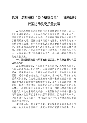 党课:深刻把握四个辩证关系—推动新时代国防动员高质量发展A强军思想敏锐洞察新时代军事领域的矛盾运动,深化了我们党对军事领域一些基本问题的规律性认识,蕴含着当代中国马克思主义军事观和方法论,为引领强国强军伟大实践提供了锐利思想武器。国防动员贯通经济与国防、横跨军队与地方、关联平时与战时,是一体化国家战略体系和能力的重要组成部分,是打赢未来战争的重要战略支撑。必须坚决贯彻A强军思想,深刻把握、科学运用贯穿其中的马克思主义军事观和方法论,注重统筹处理四个辩证关系,奋力推动新时代国防动员高质量发展。一、深刻把握政治与军事的辩证关系,切实把正新时代国防动员方向A主席强调指出,坚持军事服从政治,战略服从政略,从政治高度思考战争问题。这深刻阐明政治决定军事、引领军事,军事服务政治、支撑政治的历史逻辑、理论逻辑和实践逻辑,两个方面相辅相成、有机统一。当今时代,军事和政治联系更加紧密,在战略层面上的相关性和整体性日益增强,政治因素对战争的影响和制约愈发突出,军事斗争的政治性、政策性、敏感性显著增强。这就要求我们必须深刻认识军事的政治属性,抓军队建设首先要从政治上看。国防动员是国防和军队现代化建设的重要组成部分,加强国防动员和后备力量建设,必须坚持从政治高度思考和处理军事问题,坚决听从党中央、中央军委和A主席指挥,确保国防动员和后备力量建设沿着正确方向阔步前进。突出政治性,强化党管武装。党对军队的绝对领导是中国特色社会主义的本质特征,是党和国家的重要政治优势,是人民军队的建军之本、强军之魂。90多年来,人民军队之所以能始终保持强大的凝聚力、向心力、战斗力,经受住各种考验,不断从胜利走向胜利,最根本的就是靠党的坚强领导。党管武装是我党我军在长期革命与建设实践中形成的光荣传统,是党对军队绝对领导根本原则在国防动员和后备力量建设中的贯彻和体现。必须坚决把国防动员置于党的绝对领导之下,全面贯彻党领导军队的一系列根本原则和制度,坚定捍卫两个确立、做到两个维护,贯彻军委主席负责制,严格落实党管武装各项制度,把党的领导贯彻到国防动员建设各个领域、各个方面、各个环节。突出战略性,强化使命担当。目前,深化国防动员体制改革已全面落地,这是党中央、中央军委着眼国防和军队建设全局作出的重大战略安排,也充分体现了国防动员的战略地位和战略使命。大国军队需要全局视野,大国动员需要大国防观。建设强大国防动员,必须着眼中华民族伟大复兴战略全局和世界百年未有之大变局,牢牢把握新时代国家政略需要和安全战略需求,把动员事业放在复兴伟业中谋划,把动员布局放在国家全局中谋篇,把动员方略放在强军战略中谋定,全面提升国防动员支撑强军胜战能力。四川是我国发展的战略腹地,战略位置十分重要,必须自觉胸怀大局、一心为战、扎根川蜀、勇当先锋,加快建设新时代国家战略大后方。突出人民性,强化践行宗旨。全心全意为人民服务是人民军队的根本宗旨,是人民军队的根脉所在、使命所系。无论时代如何发展、形势如何变化,都必须始终坚持。建设新时代国防动员,必须牢记一切为了人民,一切依靠人民,坚持人民至上,站稳人民立场,继承发扬拥政爱民优良传统,深入开展军民共建活动,在抗洪抢险、抗震救灾、森林灭火等急难险重任务中,当先锋、打头阵,发挥生力军、突击队作用。四川省军区各单位要发挥桥梁纽带作用,牵头参加和支援地方经济社会建设,以实际行动为人民造福兴利。二、深刻把握发展与安全的辩证关系,全力构建军地一体化发展格局A主席强调指出,坚持和发展中国特色社会主义,实现中华民族伟大复兴,必须统筹发展和安全、富国和强军,确保国防和军队现代化进程同国家现代化进程相适应,军事能力同国家战略需求相适应。发展和安全始终是国家战略的永恒主题,二者互为条件、彼此支撑,安全离不开发展的成果,而发展又需要安全来保证。当今时代,国家战略竞争力、社会生产力、军队战斗力的耦合关联越来越紧,战场上的对抗不仅是军事体系间的较量,而且集中表现为以国家整体实力为基础的体系对抗。深刻理解把握这一辩证关系,必须贯彻总体国家安全观,统筹发展与安全两大主题,统筹经济建设和国防建设,巩固提高一体化国家战略体系和能力,为强国兴军、强军备战提供坚实国防动员力量支撑。加强战略规划统筹。国防动员和后备力量建设一头连着军队,一头连着地方,必须放在国家经济社会发展和军事斗争准备全局中加强整体设计和统筹谋划,纳入地方经济社会发展总体规划,加强跨军地、跨部门、跨区域统筹协调,把战略方向军事斗争与区域经济社会发展有机结合起来,把国防科技工业融入区域工业布局,总体规划、一体推进。四川是西部经济大省、人口大省、资源大省、农业大省,在国家发展大局中具有独特而重要的地位。在推进四化同步、城乡融合、五区共兴进程中,应坚持经济建设贯彻国防需求,实现经济建设与国防动员建设一盘棋体系设计布局
