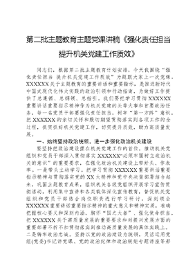 第二批主题教育主题党课讲稿《强化责任担当提升机关党建工作质效》同志们,根据第二批主题教育计划安排,今天我围绕强化责任担当 提升机关党建工作质效为题跟大家上一次党课。XXXXXX关于主题教育的重要讲话和重要指示,是推进新时代中国式现代化伟大实践的政治引领和行动指南,为做好工作提供了总遵循、总纲领、总指引。我们要把学习贯彻XXXXXX重要讲话重要指示精神作为机关党建的头等大事和首要政治任务,每一名党员干部要强化责任担当,树牢第一方阵意识,把XXXXXX的亲切关怀和殷切期望贯彻落实到各项工作的全过程,抓实抓好机关党建工作,切实提升质效,助力高质量发展。一、始终坚持政治统领,进一步强化政治机关建设要坚持把政治建设摆在机关党建工作的首位,推动机关党组织和党员干部深入贯彻落实XXXXXX必须牢固树立政治机关的意识的重要要求,在强化政治机关建设上带好头、作表率。一是带头主动学习。把学习贯彻XXXXXX重要讲话重要指示精神与贯彻落实党的XX大精神和党中央决策部署结合起来,巩固主题教育成果,组织机关各级党组织开展学习宣传贯彻活动,利用集中宣讲和各类载体深化宣传教育,督促机关党组织和党员干部结合岗位职责进行学习研讨,深刻领会XXXXXX重要讲话重要指示精神的重大意义和精神实质,准确把握核心要义和深刻内涵,胸怀国之大者、强化使命担当,把XXXXXX关于高质量发展的重要要求和对振兴发展方面的重要部署不折不扣贯彻落实到推动高质量发展的具体实践上。二是铸牢政治忠诚。坚持以党的政治建设为统领,灵活运用党组(党委)书记讲党课、党的政治纪律和政治规矩专题讲座等形式强化对党忠诚教育,以工作提示的方式督促省级领导和部门负责人落实五个到支部要求,带头过好双重组织生活,督促党内政治生活质量持续提升。落实基本制度,用好"三会一课和主题党日,推动对党忠诚教育向机关处室和基层单位延伸,不断提高党员干部的政治判断力、政治领悟力、政治执行力,坚定走好深刻领悟两个确立决定性意义、践行"两个维护的第一方阵。三是创建学习型党组织。增强思想理论武装的针对性有效性。坚持把深入学习领会XXX新时代中国特色社会主义思想作为重要政治任务,深化学习型机关创建,督促机关充分利用第一议题、理论学习中心组、青年理论学习小组、党支部三会一课和党课开讲啦等载体,开展日读一小时、精讲五分钟学习活动,引导广大党员干部学深悟透、深信笃行XXX新时代中国特色社会主义思想,切实增强用党的创新理论武装头脑、指导实践、推动工作的思想自觉、政治自觉和行动自觉。二、注重突出工作重点,进一步强化模范机关建设认真落实XXXXXX关于模范机关建设的需要要求,把建设模范机关作为机关党建工作的主要载体和重点任务持续推进,在做到三个表率,建设让党中央放心、让人民群众满意的模范机关上下功夫。一是凝聚思想共识。结合工作实际,树立政治过硬、勤于学习、务实高效、为民服务,清正廉洁的创建标准,通过组织理论研讨、经验交流、成果展示等方式加强宣传、教育、引导,推动广大党员干部特别是关键少数"关心创建,支持创建,参与创建,深化思想认识、凝聚思想共识,形成持续深化模范机关创建的声势导向和浓厚氛围二是优化实施路径。坚持目标导向、问题导向、过程导向相结合,印发《关于进一步加强模范机关建设的实施意见》,制定《机关模范机关建设目标体系》,汇编创建工作优秀案例,发挥典型引领作用,完善责任落实、督促检查、典型激励、考核问效工作机制,认真做好模范机关创建的设计、谋划、落实等工作,把创建工作转精创建工作细化为破解难题、改进作风、推动事业发展的过程。三是提高质量水平。把模范机关创建纳入整体工作布局,作为机关党组织书记抓党建述职评议考核的重要内容,健全以上率下、以机关带系统工作机制,定期督促检查创建情况,科学运用正向激励和提醒提示等方式激活动力、传导压力,形成各级党组织和全体党员干部整体联动,努力实现创建效果的最大化。三、夯实筑牢基层基础,进一步强化党建引领作用坚持把XXXXXX加强党的领导和党的建设是根本保证重要要求作为工作的出发点和落脚点,着力提高机关党建质量,发挥党建引领作用,促进经济社会高质量发展。一是要注重打造品牌。推动党建与业务深度融合。紧紧围绕全省的战略定位和加快建设六个先行,把机关党建与业务工作,政治生态建设、干部队伍建设、能力作风建设、优化营商环境等工作相互贯通起来,提炼汇总机关党建引领示范案例,打造特点鲜明的机关党建品牌,把机关党建工作成效体现到工作晋位争先上,反映到党建与业务融合发展上。二是要注重夯实基础。增强基层党组织政治功能和组织功能。树牢大抓基层的鲜明导向,认真贯彻落实《中国共产党党和国家机关基层组织工作条例》和《中国共产党支部工作条例(试行)》,抓基层、打基础,开展党建"擂台赛和党