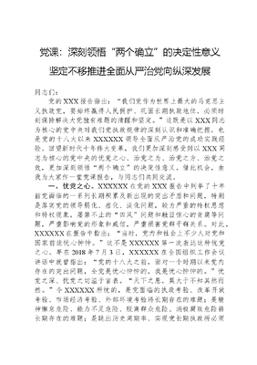 党课:深刻领悟两个确立的决定性意义坚定不移推进全面从严治党向纵深发展同志们:党的XXX报告指出:我们党作为世界上最大的马克思主义执政党,要始终赢得人民拥护、巩固长期执政地位,必须时刻保持解决大党独有难题的清醒和坚定。这既是以XXX同志为核心的党中央对我们党执政规律的深刻认识和准确把握,也是党的十八大以来XXXXXX领导全面从严治党的成功实践经验。回望新时代十年伟大变革,我们更加深刻感受到以XXX同志为核心的党中央的忧党之心、治党之为、治党之方、治党之效,更加深刻领悟两个确立的决定性意义。借此机会,由我为大家作一堂党课报告,与同志们共同交流。一、忧党之心。XXXXXX在党的XXX报告中列举了十年前党面临的一系列长期积累及新出现的突出矛盾和问题,特别是落实党的领导弱化、虚化、淡化问题,较为严重的特权思想和特权现象,屡禁不止的四风问题和触目惊心的贪腐等问题,严重影响党的形象和威信,严重损害党群干群关系。对此,XXXXXX在报告中指出:当时,党内和社会上不少人对党和国家前途忧心忡忡。这不是XXXXXX第一次表达这种忧党之心。早在2018年7月3日,XXXXXX在全国组织工作会议讲话中就曾指出:党的十八大之前,面对一个时期以来党内存在的突出问题,全党是忧心忡忡的,我是忧心忡忡的。忧党之深、忧党之切溢于言表。天下之患,莫大于不知其然而然。令XXXXXX所忧的,是党面临的执政考验、改革开放考验、市场经济考验、外部环境考验将长期存在的难题;是精神懈怠危险、能力不足危险、脱离群众危险、消极腐败危险将长期存在的难题;是跳出历史周期率、实现党长期执政所必须解决的大党独有难题。走好新的赶考之路,必须解决这三个长期存在的难题,如果管党不力、治党不严,人民群众反映强烈的党内突出问题得不到解决,那我们党迟早会失去执政资格,不可避免被历史淘汰。这决不是危言耸听。当前,我们要以扎实开展XXX新时代中国特色社会主义思想主题教育为契机,接受政治体检,打扫政治灰尘,纠正行为偏差,解决思想不纯、组织不纯问题,真心爱党、时刻忧党、坚定护党、全力兴党,使我们党始终充满蓬勃生机和旺盛活力。二、治党之为。打铁必须自身硬,这是执政党执政的基本逻辑。党的十八大以来,以XXX同志为核心的党中央站在关系党和国家生死存亡的高度,采取了一系列管党治党举措。坚持以上率下改进工作作风,从制定和落实中央八项规定破题,从中央政治局做起,为全党作出示范和榜样。将思想建党的光荣传统赋予时代内涵,以县处级以上领导干部为重点,抓好关键少数,在全党开展党的群众路线教育实践活动、三严三实专题教育、两学一做学习教育、不忘初心、牢记使命主题教育、党史学习教育等党内集中教育,以及目前正在全党开展的学习贯彻XXX新时代中国特色社会主义思想主题教育,筑牢全党团结奋斗的共同思想基础。党提出和贯彻新时代党的组织路线,明确信念坚定、为民服务、勤政务实、敢于担当、清正廉洁的新时代好干部标准,以严的标准要求干部、以严的措施管理干部、以严的纪律约束干部,锻造了政治过硬、适应新时代要求、具备领导现代化建设能力的干部队伍。以零容忍态度坚决惩治腐败,不敢腐、不能腐、不想腐一体推进,打虎拍蝇猎狐多管齐下,反腐败斗争取得压倒性胜利并全面巩固,党风政风焕然一新。以党的政治建设为统领,增强党内政治生活的政治性、时代性、原则性、战斗性,坚决反对七个有之,确保党中央权威和集中统一领导,确保党发挥总揽全局、协调各方的领导核心作用,使我们这个拥有9600多万名党员的马克思主义政党更加团结统一。严格党内监督,把巡视作为党内监督战略性制度安排,推动各类监督贯通协同、形成合力,发现问题,形成震慑,推动改革,促进发展。坚持制度治党、依规治党,以党章为根本,以民主集中制为核心,先后出台和完善了3600多部党内法规,全面实现了党组织工作活动和党员、干部行为有规可依、有章可循。以永远在路上的执着、彻底的自我革命精神纵深推进全面从严治党,号召全党决不能有松劲歇脚、疲劳厌战的情绪,永葆赶考的清醒与坚定。三、治党之方。以XXX同志为核心的党中央推进全面从严治党的伟大实践,始终贯穿着马克思主义立场观点方法,开辟了百年大党自我革命的新境界。坚持人民至上。始终将人民放在最高位置,始终铭记为人民谋幸福的初心,信守全心全意为人民服务的宗旨,以得罪千百人、不负十四亿的使命担当,祛疴治乱,消除了党、国家、军队内部存在的严重隐患,确保党和人民赋予的权力始终用来为人民服务。坚持自信自立。党的自身问题,只有靠党自己解决。XXXXXX指出:一定要认清,中国最大的国情就是中国共产党的领导。什么是中国特色?这就是中国特色。中国共产党领导的制度是我们自己的,不是从哪里克隆来的,也不是亦步亦趋效仿别人的。无论我们吸收了什么