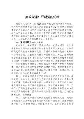 廉政党课:严明党的纪律党的十八大以来,以XXX同志为核心的党中央审时度势,把严明党的纪律作为全面从严治党的着力点,明确提出加强纪律建设是全面从严治党的治本之策。没有严明的纪律作保障,从严治党就无从谈起。那么什么是党的纪律?哪些是我们容易忽视的纪律短板?如何加强纪律建设?今天我将以党的纪律为主题,为全体党员干部和职工讲一堂党课。一、深刻理解党的六大纪律党有党纪,国有国法。国无法不安,党无纪不治。我们党是靠革命理想和铁的纪律组织起来的马克思主义政党,纪律严明是党的优良传统和独特优势。严明的纪律始终是我们党战胜一切艰难险阻、从胜利走向胜利的坚强保证。那么,党的纪律包含哪些主要内容?《中国共产党章程》明确党的纪律是党的各级组织和全体党员必须遵守的行为规则,是维护党的团结统一、完成党的任务的保证。党组织必须严格执行和维护党的纪律,共产党员必须自觉接受党的纪律的约束。党的纪律主要包括政治纪律、组织纪律、廉洁纪律、群众纪律、工作纪律、生活纪律。这六大纪律的内涵是什么?第一,政治纪律是各级党组织和全体党员在政治方向、政治立场、政治言论、政治行为方面必须遵守的规矩,是牵头管总的纪律,是维护党的团结统一的根本保证,遵守党的政治纪律是遵守党的全部纪律的重要基础。政治纪律主要是四个坚决:坚决与党中央保持一个声音,坚决贯彻党和国家的方针政策以及决策部署,坚决与宗教迷信活动划清界限,坚决反对团团伙伙、拉帮结派。第二,组织纪律是规范和处理党的各级组织之间、党组织与党员之间以及党员与党员之间关系的行为规则,是维护党的集中统一、保持党的战斗力的基本条件。组织纪律主要包括四服从、三严格一自觉。四服从即党员个人服从党的组织,少数服从多数,下级组织服从上级组织,全党各个组织和全体党员服从党的全国代表大会和中央委员会。三严格一自觉即严格遵守组织制度和程序,严格执行民主集中制和请示报告制度,严格按组织原则和组织程序办事,自觉接受组织安排和纪律约束。第三,廉洁纪律是党组织和党员在从事公务活动或者其他与行使职权有关的活动中应当遵守的廉洁用权的行为规则,是干部清正、政府清廉、政治清明的重要保障。核心内容即为《中国共产党廉洁自律准则》:党员要坚持公私分明,先公后私,克己奉公;坚持崇廉拒腐,清白做人,干净做事;坚持尚俭戒奢,艰苦朴素,勤俭节约;坚持吃苦在前,享受在后,甘于奉献。领导干部要廉洁从政,自觉保持人民公仆本色;廉洁用权,自觉维护人民根本利益;廉洁修身,自觉提升思想道德境界;廉洁齐家,自觉带头树立良好家风。第四,群众纪律是党的各级组织和全体党员坚持以人民为中心的发展理念和处理党群关系时必须遵守的行为规则,充分体现了党的性质和宗旨,是密切党同人民群众血肉联系、克服脱离群众危险的重要保证。党的群众纪律要求各级党组织和共产党员,必须坚持党的全心全意为人民服务的宗旨,时刻维护人民群众的利益,做到四个严禁,即严禁侵害群众利益;严禁欺压群众、充当黑恶势力保护伞;严禁漠视群众利益的不作为、乱作为;严禁侵犯群众知情权。第五,工作纪律是党组织和党员在党的各项具体工作中必须遵循的行为规则,是党组织和党员依规开展各项工作的重要保证。正确履职、担当尽责、作风优良,这是党的工作纪律要求的重要内容,也是党的各项工作正常开展的重要保证。对党是否绝对忠诚、是否遵从党组织要求、是否做到廉洁自律、是否始终保持与人民群众的血肉联系,都体现在具体的工作实践中,需要工作纪律做保障。第六,生活纪律是党员在日常生活和社会交往中应当遵守的行为规则,涉及个人品德、家庭美德、社会公德等各个方面,直接关系党的形象。生活纪律重在规范党员干部八小时之外的私人生活,要求党员必须发扬社会主义新风尚,带头实践社会主义核心价值观和社会主义荣辱观,提倡共产主义道德,弘扬中华民族传统美德,自觉遵守家庭美德和社会公序良俗,坚决反对享乐主义和奢靡之风,坚决反对一切庸俗、落后、腐化和违背党的理想信念宗旨的行为。六大纪律相互联系、相互统一,涵盖党的纪律各个方面,体现了对党员的高标准严要求,是保持党的肌体健康、维护党的团结统一提供了有力武器,是党的各级组织和全体党员必须遵守的行为规则,必须一以贯之、身体力行。二、以案为鉴强化纪律意识入党誓词和《党章》党员义务章节中都提出了严守党的纪律,正如XXXXXX强调的:党的纪律是全党必须遵守的行为准则,严格遵守和坚决维护纪律是做合格党员、干部的基本条件。纵观身边的典型腐败案例,党员干部违法犯罪,始于纪律意识松懈,党纪防线逐渐失守,一步步滑向违法深渊,最终沦为阶下囚。事实证明,拒腐防变守住党纪底线是关键,2018年党中央修订实施《中国共产党纪律处分条例》,以负面清单的形式为全体党员划出了纪律红线。《条例》第二编分则第四十四条至第一百三十八条详细列举了各类违反六大纪律的