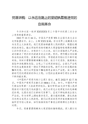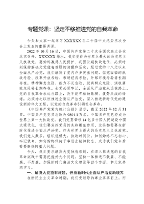专题党课:坚定不移推进党的自我革命今天和大家一起学习XXXXXX在二十届中央纪委三次全会上发表的重要讲话。2022年10月16日,中国共产党第二十次全国代表大会在北京召开。XXXXXX指出,我们党作为世界上最大的马克思主义执政党,要始终赢得人民拥护、巩固长期执政地位,必须时刻保持解决大党独有难题的清醒和坚定。经过党的十八大以来全面从严治党,我们解决了党内许多突出问题,但党面临的执政考验、改革开放考验、市场经济考验、外部环境考验将长期存在,精神懈怠危险、能力不足危险、脱离群众危险、消极腐败危险将长期存在。全党必须牢记,全面从严治党永远在路上,党的自我革命永远在路上,决不能有松劲歇脚、疲劳厌战的情绪,必须持之以恒推进全面从严治党,深入推进新时代党的建设新的伟大工程,以党的自我革命引领社会革命。《中国共产党党内统计公报》显示,截至2022年12月31日,中国共产党党员总数为9804.1万名。中国共产党已经成为世界上第一大执政党,我们党要带领14亿多中国人民建设中国式现代化,我们要发挥党员的先锋模范作用,这些都需要在新时代推进全面从严治党。作为世界上最大的马克思主义执政党,我们党人数多,组织规模大,执政时间长。如何始终不忘初心、牢记使命,如何始终保持干事创业精神状态,成为我们党今后需要解决的重大问题。今天,我主要从解决大党独有难题,在深入推进党的自我革命实践中需要把握好九个问题,坚持一体推进不敢腐、不能腐、不想腐,加强新时代廉洁文化建设等四个方面,和大家共同学习。一、解决大党独有难题,开拓新时代全面从严治党新境界在新民主主义革命时期,我们党领导的事业蒸蒸日上,而国民党则是日薄西山。1945年,黄炎培来到延安,看到了延安兴旺的景象。黄炎培说:我生六十多年,耳闻的不说,所亲眼看到的,真所谓其兴也勃焉,其亡也忽焉,一人,一家,一团体,一地方,乃至一国,不少单位都没有能跳出这周期率的支配力。大凡初时聚精会神,没有一事不用心,没有一人不卖力,也许那时艰难困苦,只有从万死中觅取一生。继而环境渐渐好转了,精神也就渐渐放下了……一部历史,政怠宦成的也有,人亡政息的也有,求荣取辱的也有。总之没有能跳出这周期率。中共诸君从过去到现在,我略略了解的了。就是希望找出一条新路,来跳出这周期率的支配。听闻黄炎培肺腑之言,毛泽东同志作答:我们已经找到新路,我们能跳出这周期率。这条新路,就是民主。只有让人民来监督政府,政府才不敢松懈。只有人人起来负责,才不会人亡政息。我们知道,李自成率领大军轰轰烈烈进入北京后,这支队伍迅速腐败,仅仅过了42天就从北京撤出。1949年3月23日,中共中央和毛泽东同志离开西柏坡前往北平。毛泽东同志说:今天是进京赶考的日子。周恩来同志答道:我们都应当考及格,不要退回来。毛泽东同志坚定地说:退回来就失败了。我们决不当李自成!我们都希望考个好成绩!在世界历史发展过程中,我们能够看到,有的政党在兴起时也是艰难困苦、玉汝于成,但一旦失去民心,在执政中无法应对新的挑战,就不可避免地被时代抛弃。十月革命胜利后,列宁曾尖锐地指出,我们所有经济机关的一切工作中最大的毛病就是官僚主义。共产党员成了官僚主义者。如果说有什么东西把我们毁掉的话,那就是这个。苏联共产党在只有20万党员的情况下夺取了政权,在有200万党员的情况下打败了法西斯侵略者,但在拥有2000万党员时却失去了政权。为什么苏联共产党在拥有2000万党员时失去了政权?因为此时许多苏联共产党党员没有了信仰。我们党面临的四大考验将长期存在,这四大考验就是执政考验、改革开放考验、市场经济考验、外部环境考验。因此,落实党要管党、从严治党的任务比以往任何时候都更为繁重更为紧迫。2018年,在全国组织工作会议上,XXXXXX指出:党的十八大之前,面对一个时期以来党内存在的突出问题,全党是忧心忡忡的,我是忧心忡忡的。想来想去,打铁必须自身硬。当时,一些党员干部忽视理论学习、学用脱节,对马克思主义信仰不坚定,对中国特色社会主义缺乏信心;一些党员干部认为共产主义非常遥远,对理想信念开始动摇;有的党员干部出现了形式主义、官僚主义。面对这种情况,2012年12月,中共中央政治局会议审议通过《十八届中央政治局关于改进工作作风、密切联系群众的八项规定》,即中央八项规定。规定要求,中央政治局全体同志要改进调查研究,切忌走过场、搞形式主义;要轻车简从、减少陪同、简化接待。要精简会议活动,切实改进会风;提高会议实效,开短会、讲短话,力戒空话、套话。要精简文件简报,切实改进文风,没有实质内容、可发可不发的文件、简报一律不发。要规范出访活动,严格控制出访随行人员,严格按照规定乘坐交通工具。XXXXXX在深圳视察时,没有安排任何宴请,没有入住深圳迎宾馆的1号楼,而是选择了另一家酒店,
